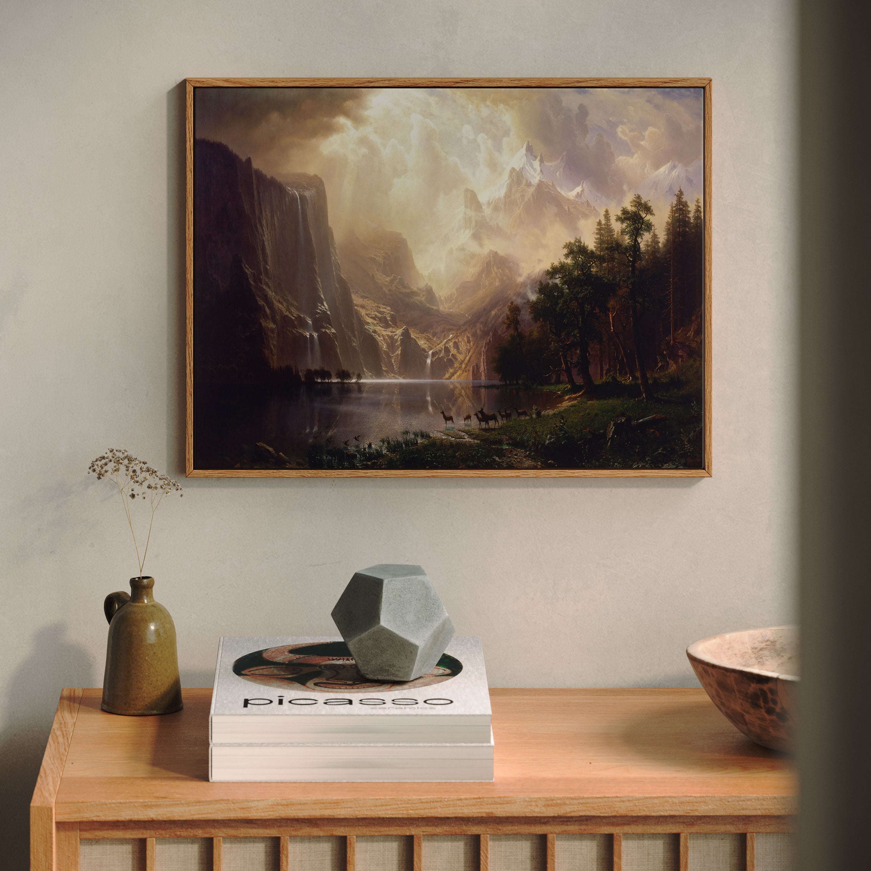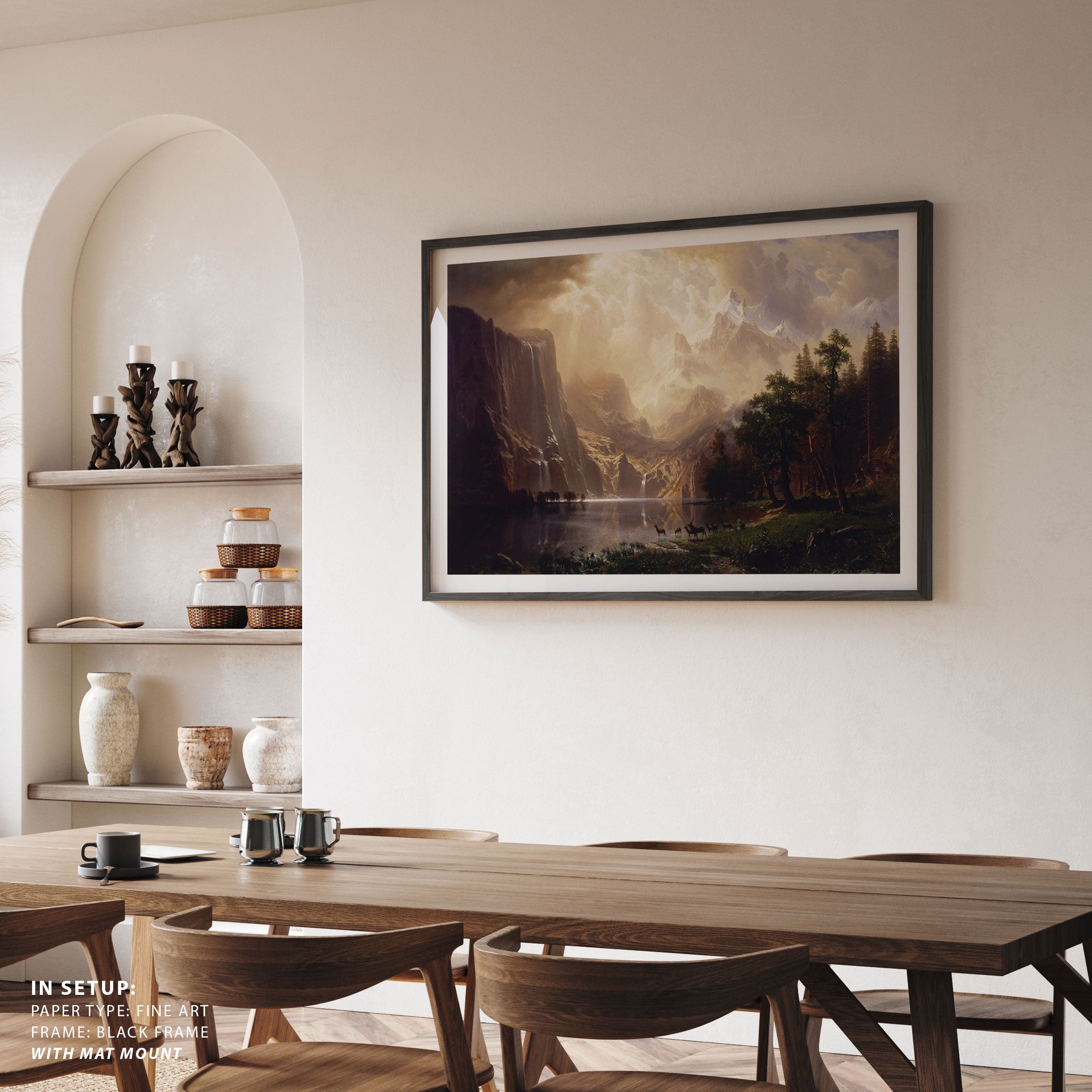 Bring elegance and harmony into your space with this beautiful artwork, Among the Snowy Mountains, from our Art Prints Collection. Inspired by the majestic vision of Albert Bierstadt, each piece reveals the breathtaking grandeur of unspoiled landscapes through radiant light, sweeping horizons, and meticulously rendered natural detail. Whether capturing misty mountain passes, serene lakes glowing with reflected sky, or forests illuminated beneath dramatic clouds, these paintings fill any interior with a sense of tranquility, wonder, and timeless refinement perfect for creating an inviting, artful atmosphere in your home.