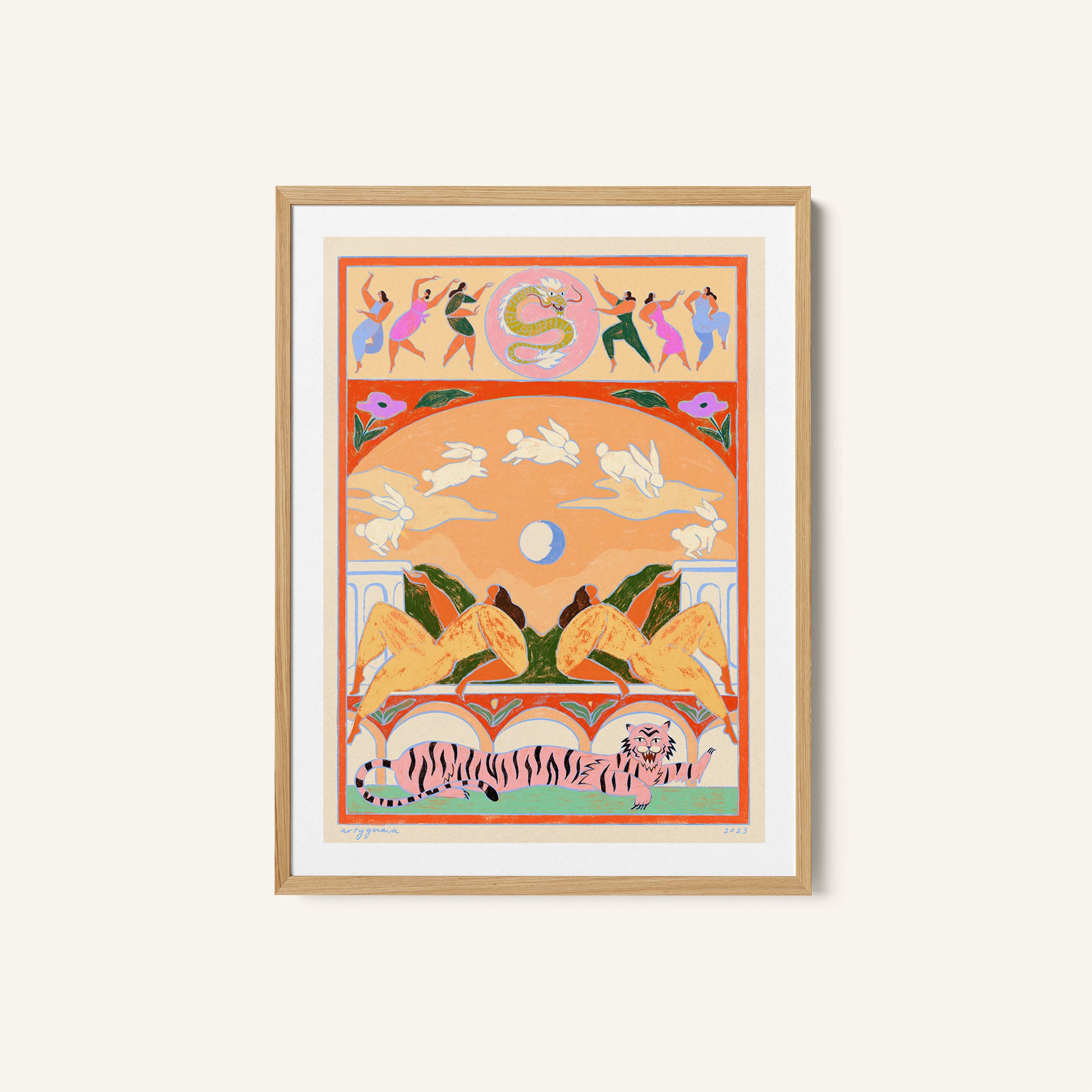 Infuse your space with modern expression and artistic storytelling through this captivating artwork, Rabbit Jumps Over the Moon, from our Arty Guava Art Prints Collection. Designed to celebrate bold illustration and imaginative narratives, this artwork blends expressive figures, dynamic forms, and thoughtfully curated color palettes to create a striking yet balanced visual impact. Rooted in contemporary and folk-inspired aesthetics, it adds character, depth, and creative energy to modern, eclectic, artistic, and contemporary interiors.