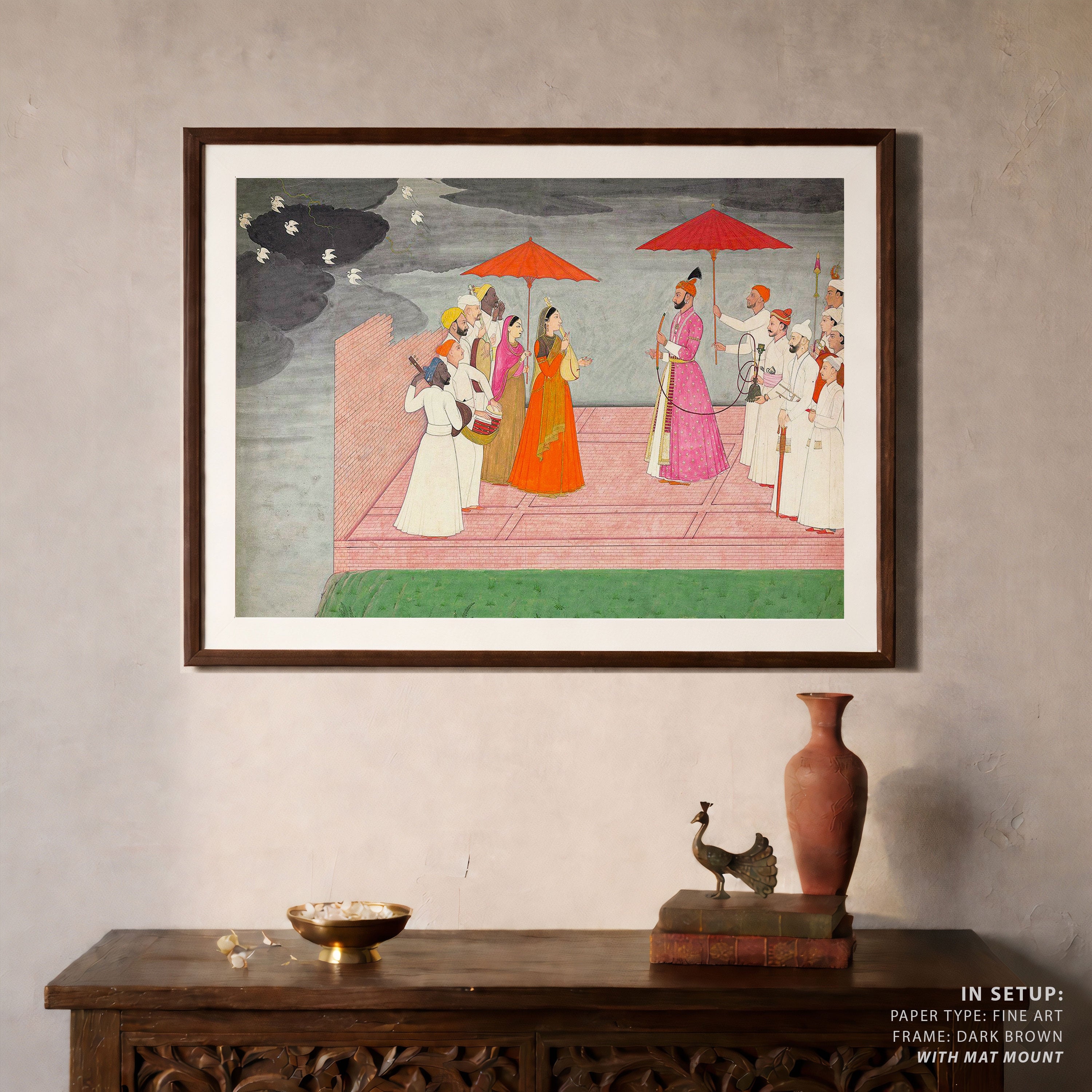 Bring elegance and cultural harmony into your space with this beautiful artwork, Musicians Playing a Raga for Balwant Dev Singh, from our Classical Indian Art Collection. Rooted in India’s rich classical and miniature painting traditions, this artwork showcases expressive figures, symbolic motifs, ornate architectural details, and serene natural landscapes, all rendered with refined craftsmanship and thoughtful precision. Its narrative depth and decorative richness make it ideal for traditional, heritage, eclectic, and contemporary interiors, adding warmth, character, and a timeless sense of history and storytelling to every interior.