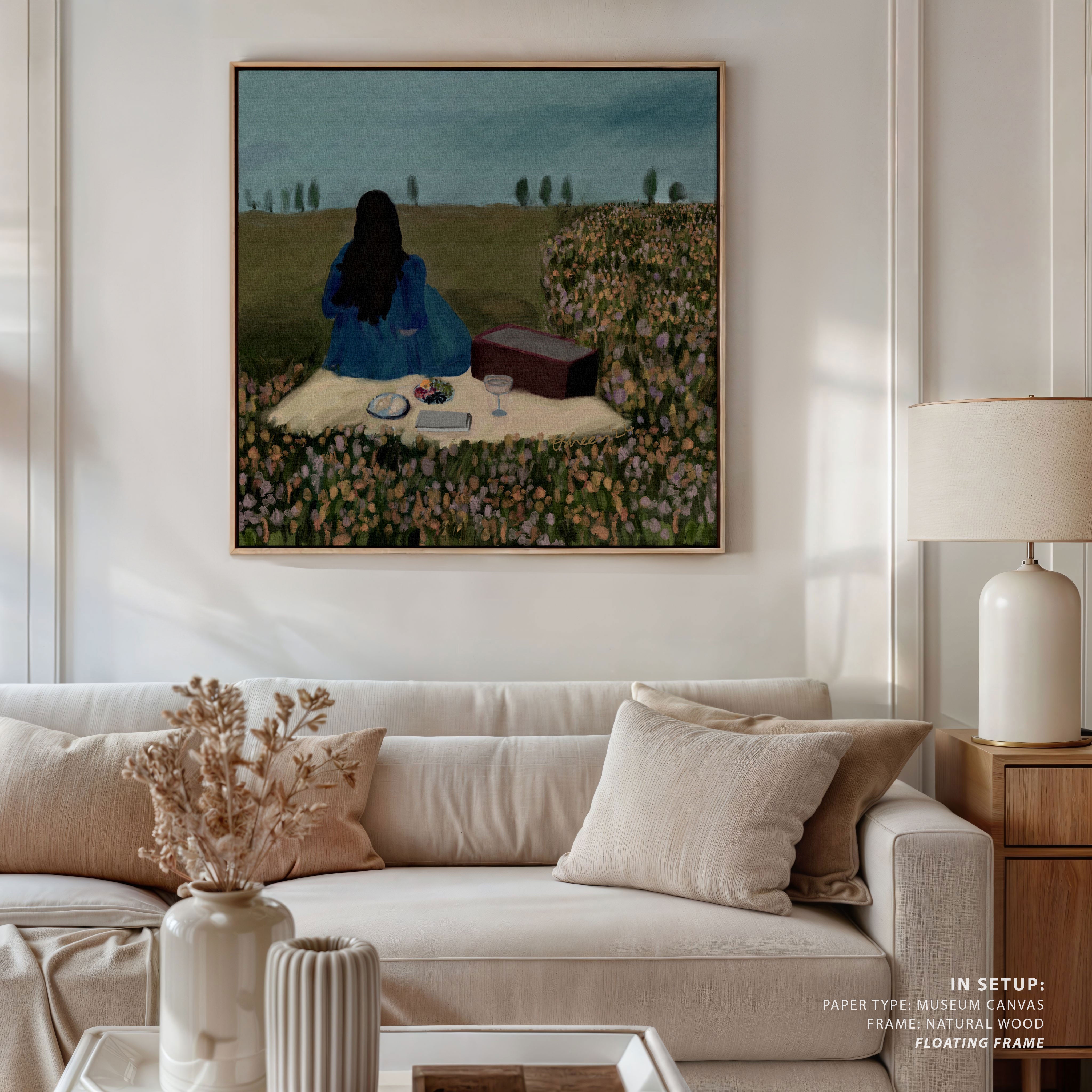 Bring a sense of intimacy and reflective calm into your space with this captivating artwork, Solo Picnic Date, by Osheen. Drawing inspiration from quiet moments, human connection with nature, and the subtleties of everyday life, each piece reflects the artist’s profound appreciation for stillness and observation.