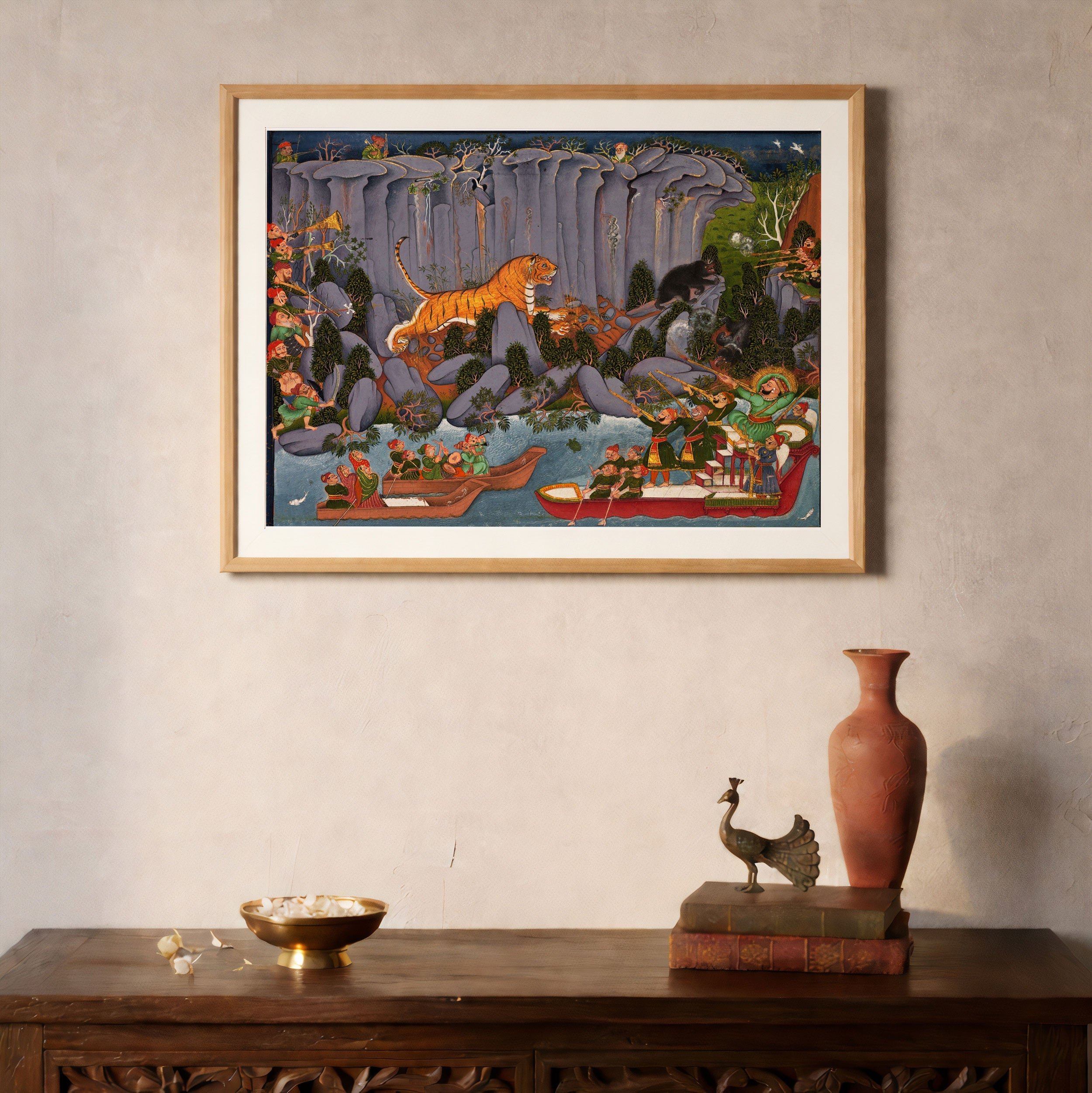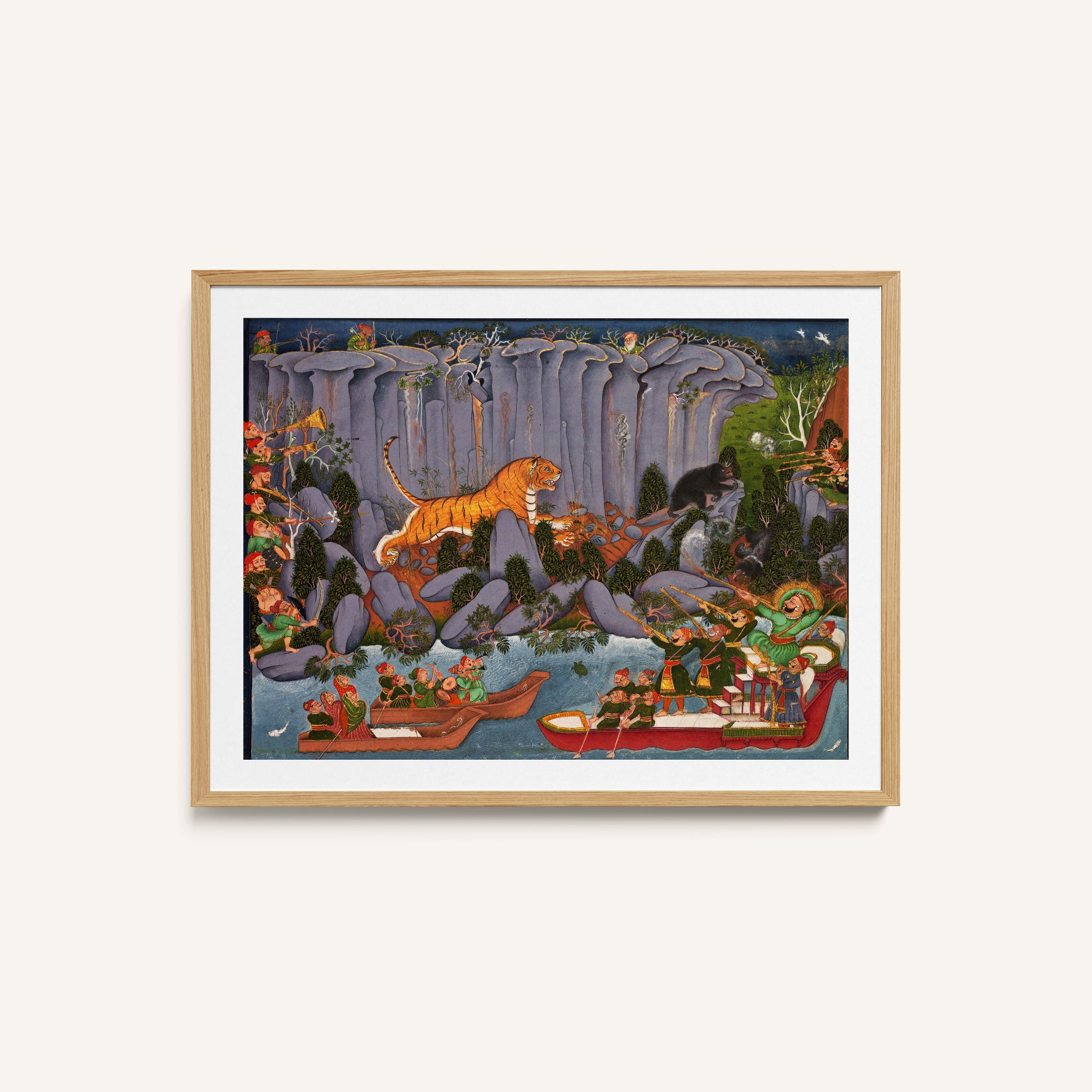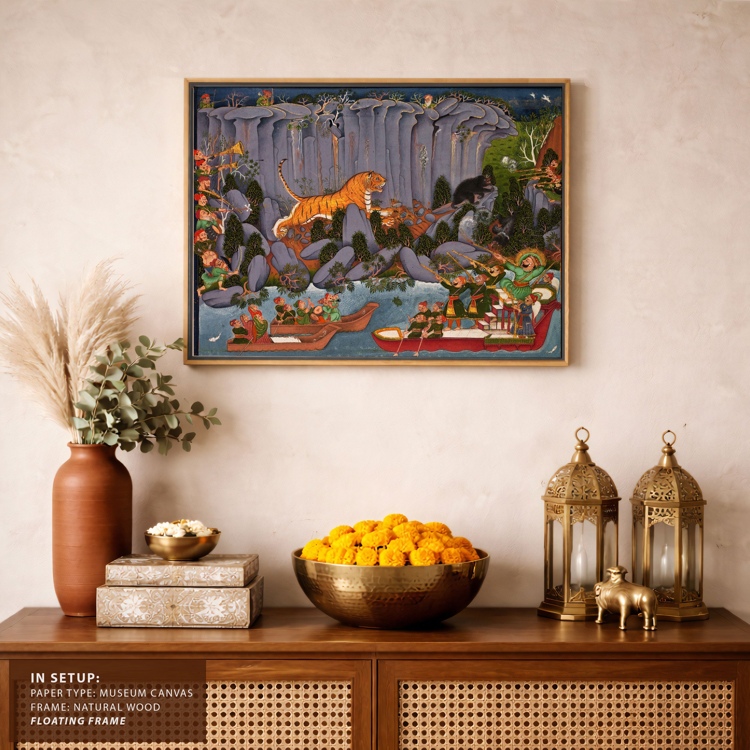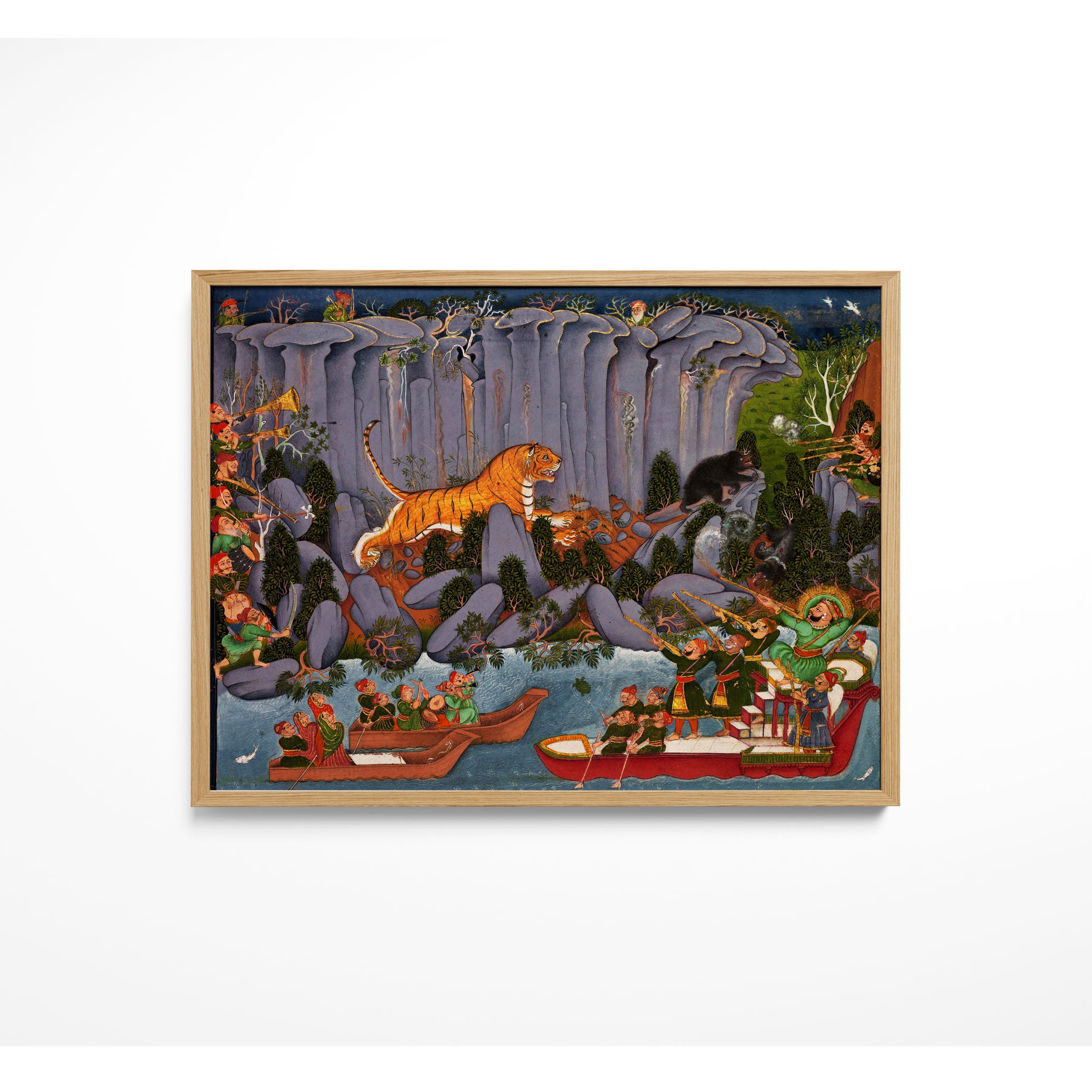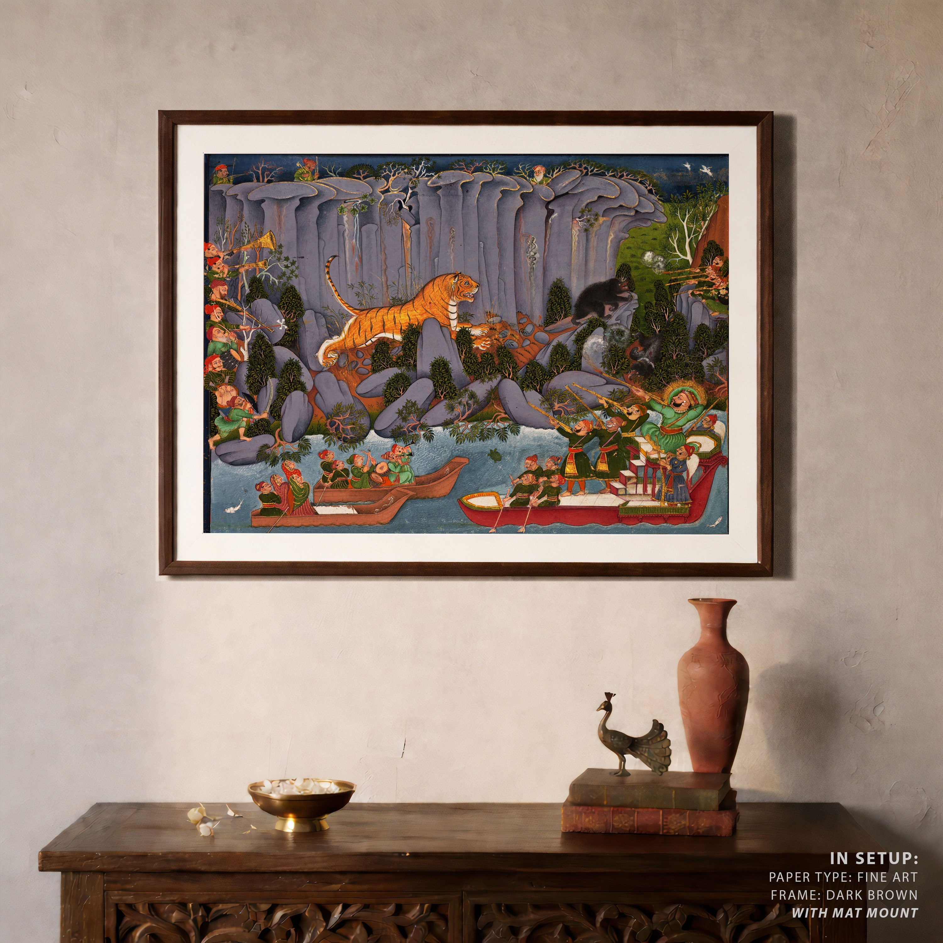 Bring elegance and cultural harmony into your space with this beautiful artwork, Tiger Hunt by Ram Singh, from our Classical Indian Art Collection. Rooted in India’s rich classical and miniature painting traditions, this artwork showcases expressive figures, symbolic motifs, ornate architectural details, and serene natural landscapes, all rendered with refined craftsmanship and thoughtful precision. Its narrative depth and decorative richness make it ideal for traditional, heritage, eclectic, and contemporary interiors, adding warmth, character, and a timeless sense of history and storytelling to every interior.