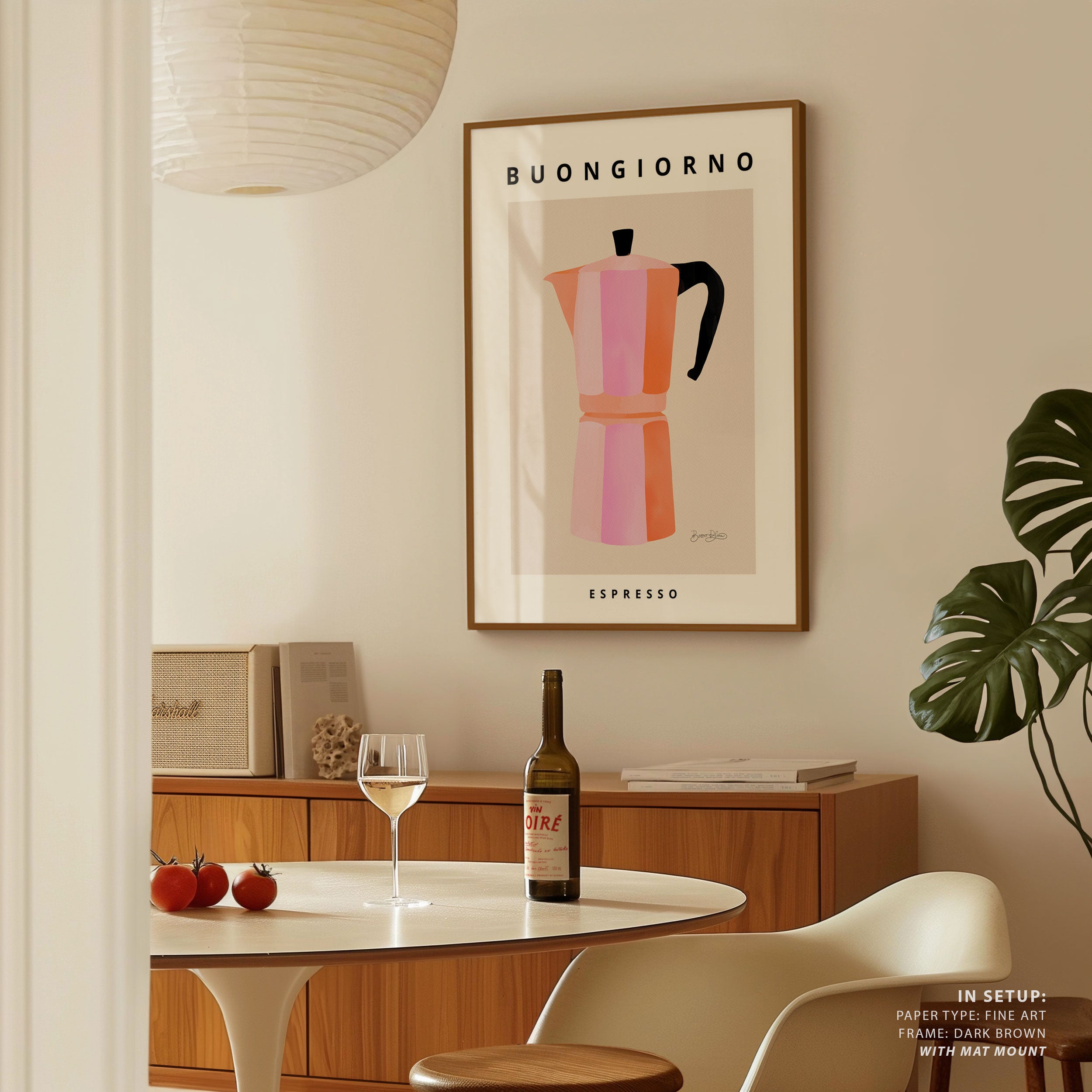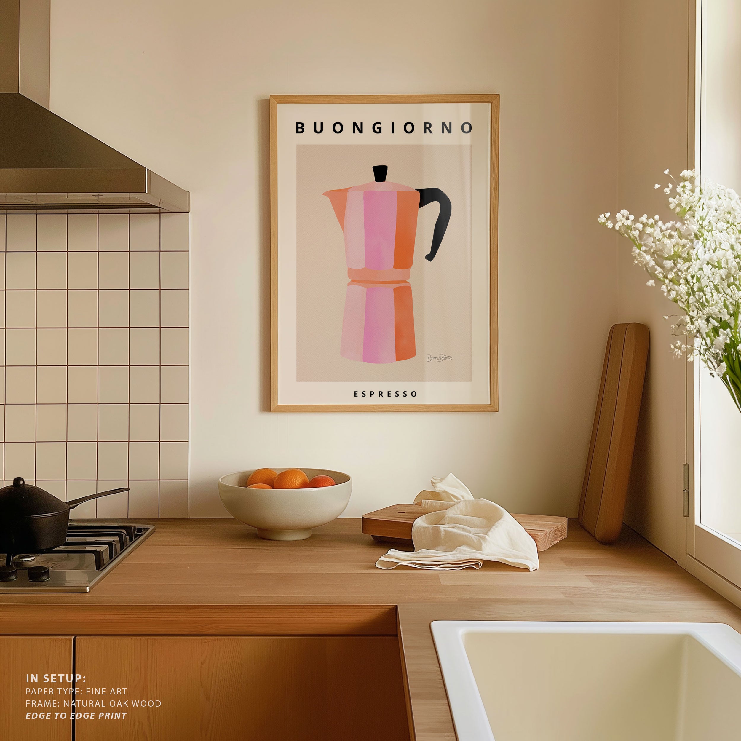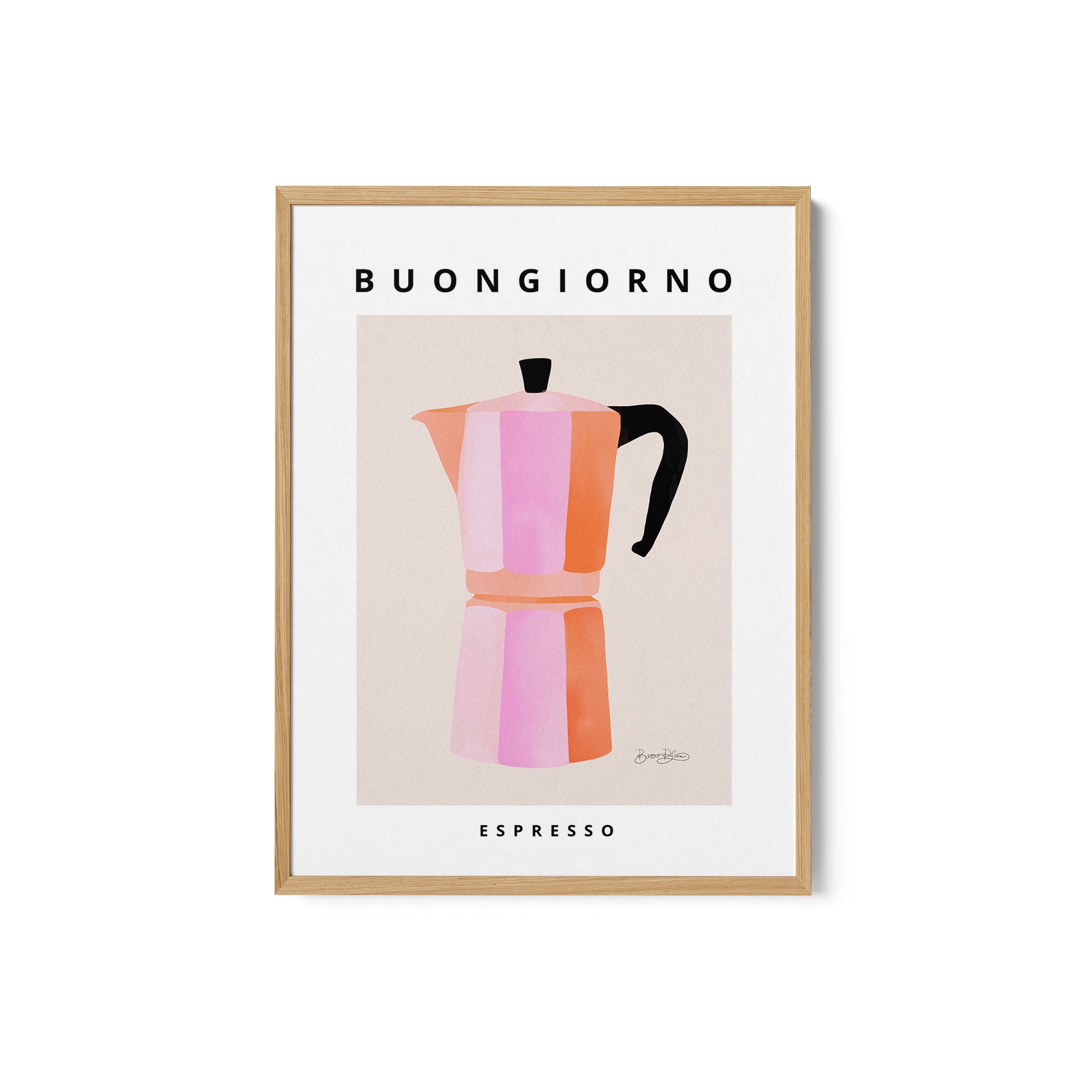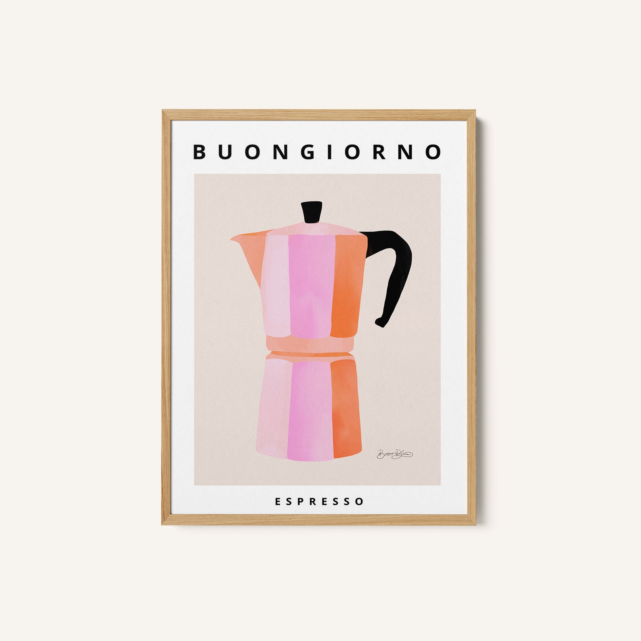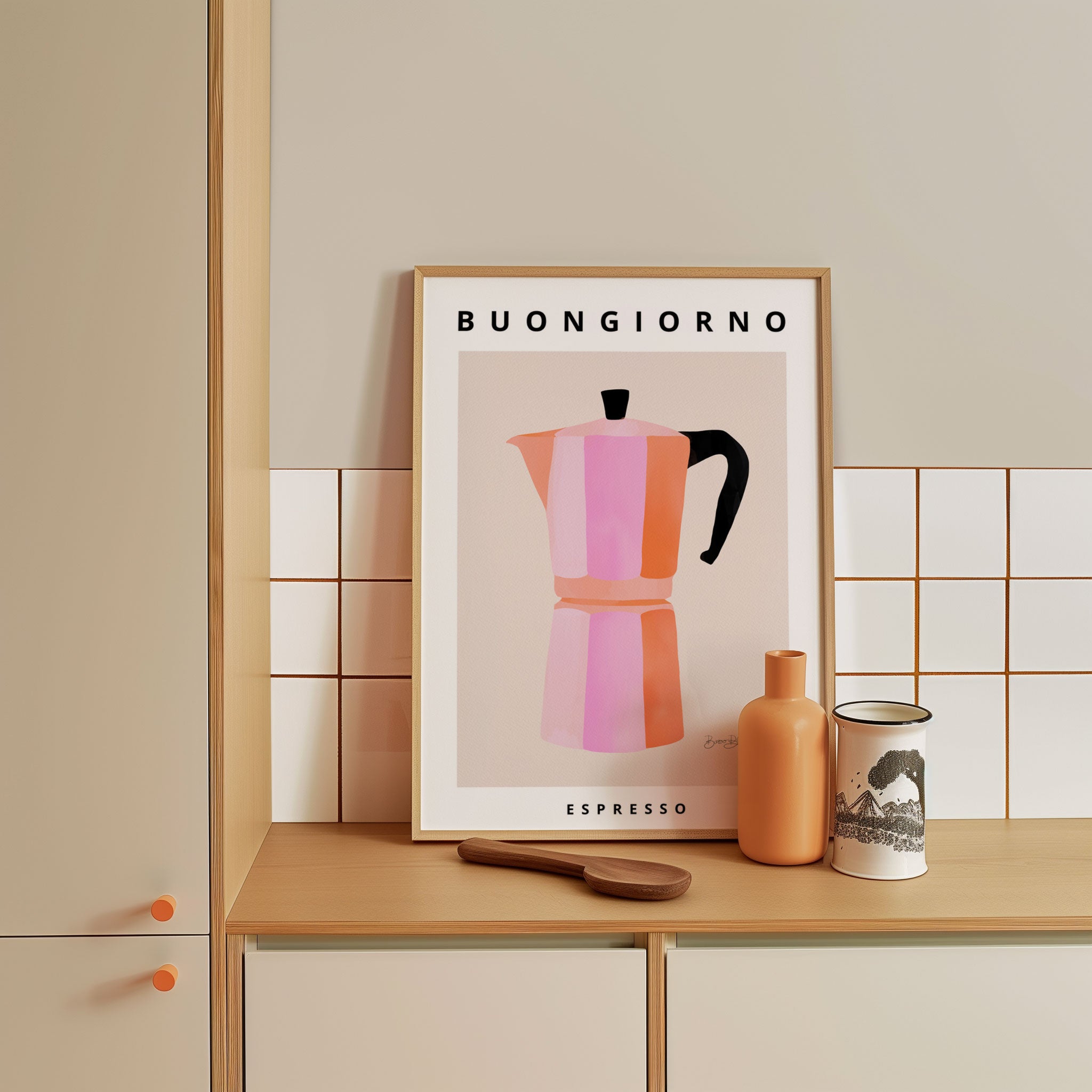Turn your kitchen or café into a haven of slow mornings and gentle ambiance with this trendy wall art print. Buongiorno Espresso 2 from our Kitchen and Café Art Prints Collection, featuring clean, pop-art‑style typography. The playful yet graphic design tone fits right in with today’s trending food‑and‑drink decor, matching lines of witty kitchen quotes and minimal illustrations that instantly tell you this is all about coffee, tea or juice.