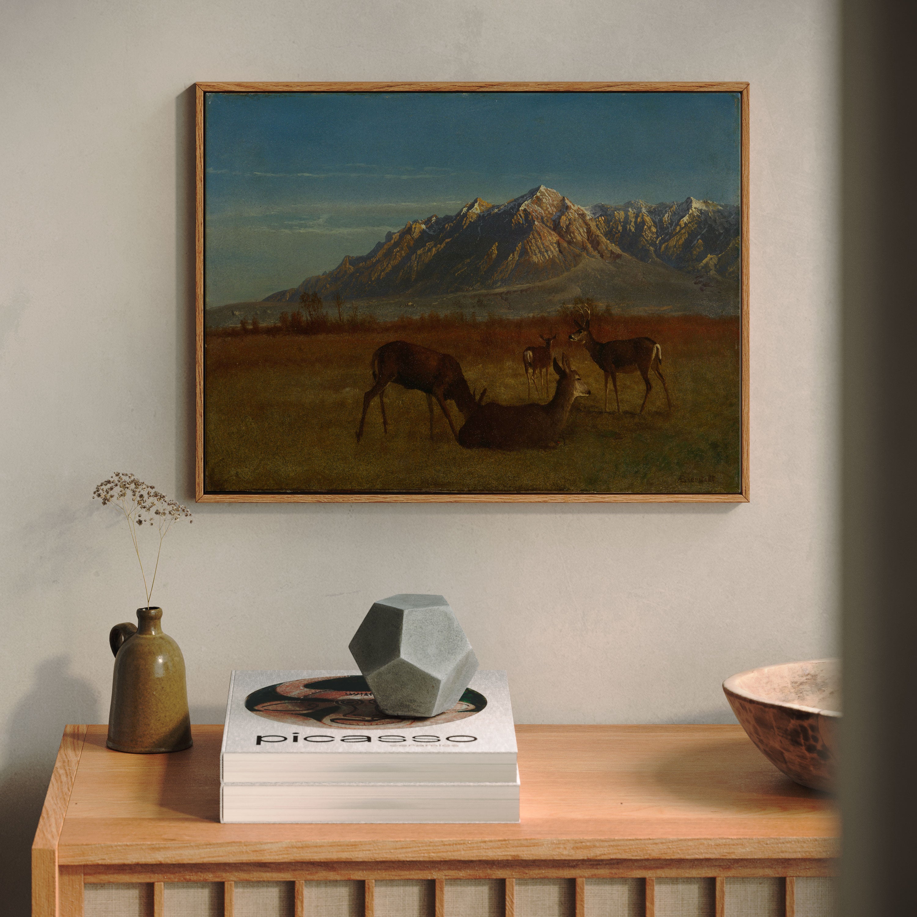 Bring elegance and harmony into your space with this beautiful artwork, Deer in Mountain Home (1879), from our Art Prints Collection. Inspired by the majestic vision of Albert Bierstadt, each piece reveals the breathtaking grandeur of unspoiled landscapes through radiant light, sweeping horizons, and meticulously rendered natural detail. Whether capturing misty mountain passes, serene lakes glowing with reflected sky, or forests illuminated beneath dramatic clouds, these paintings fill any interior with a sense of tranquility, wonder, and timeless refinement perfect for creating an inviting, artful atmosphere in your home.
