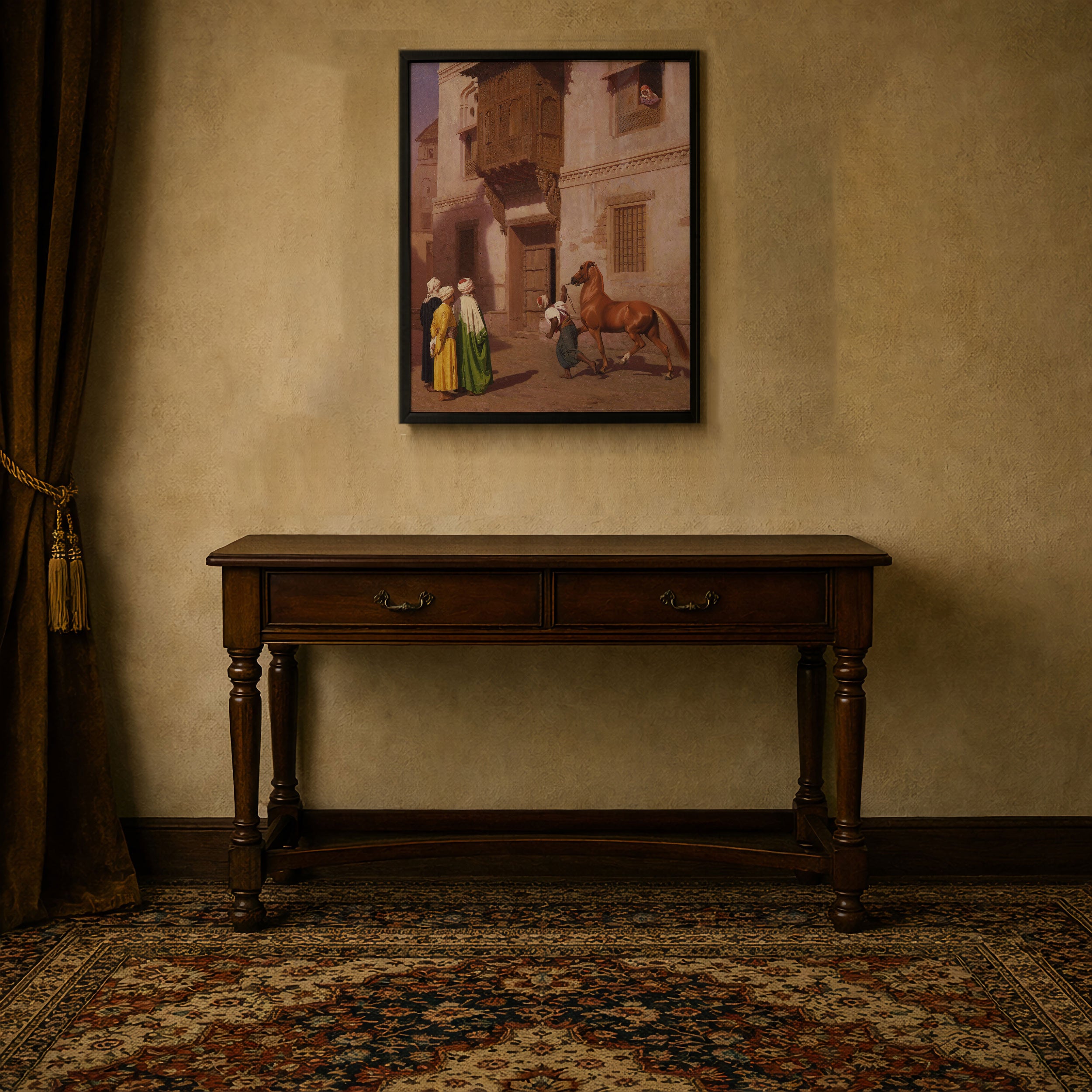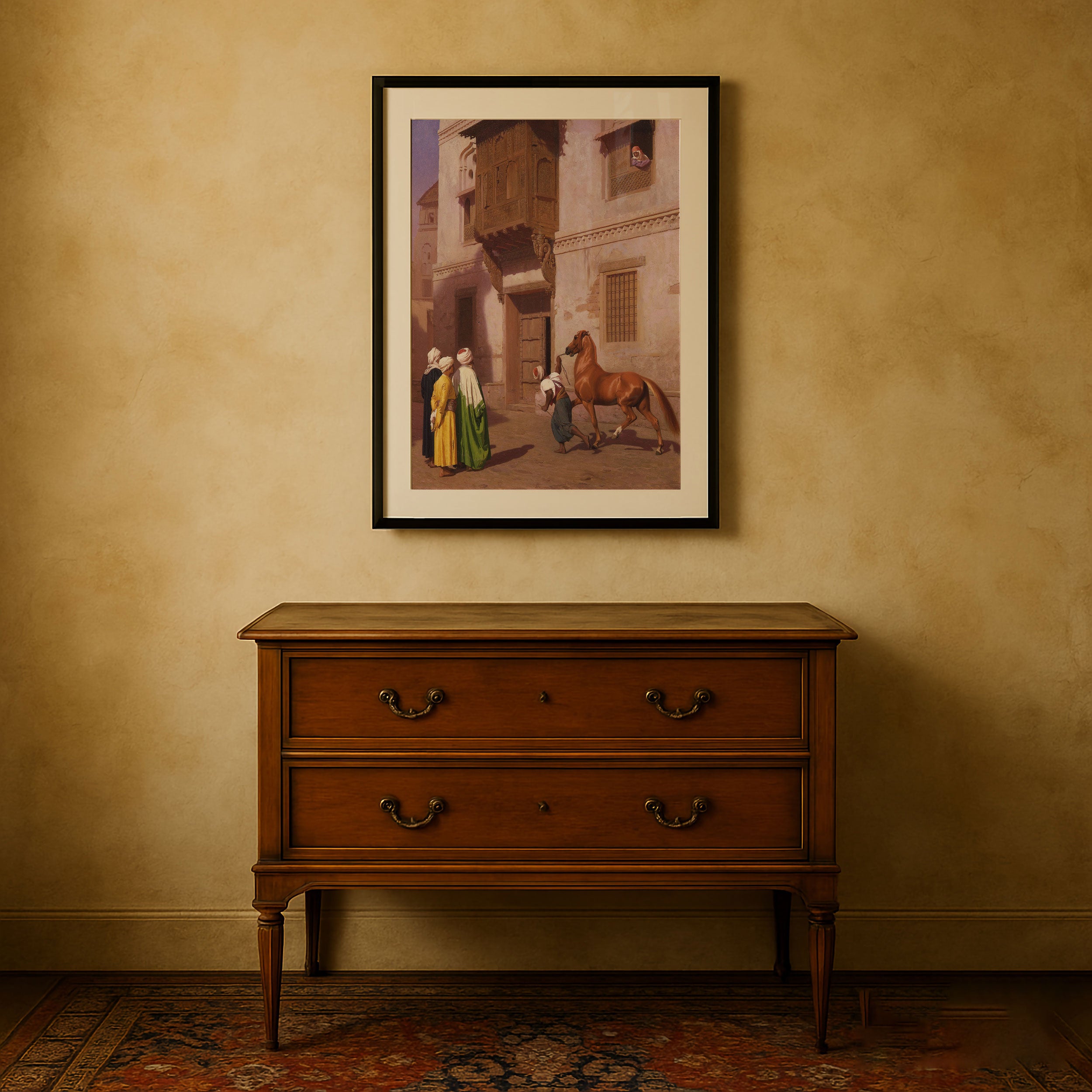 Bring elegance and harmony into your space with this beautiful artwork, The Horse Market, from our Jean Leone Gerome Art Prints Collection. This piece reveals a quiet yet compelling interplay of deep tones, soft contours, and expressive brushwork that conveys both intimacy and strength. Subtle painting details, classic art textures, and refined color layering enhance its timeless appeal. Its gentle contrasts and inviting atmosphere bring a refined and contemplative touch to any interior, enriching your space with the timeless poetry of this iconic artistic style.