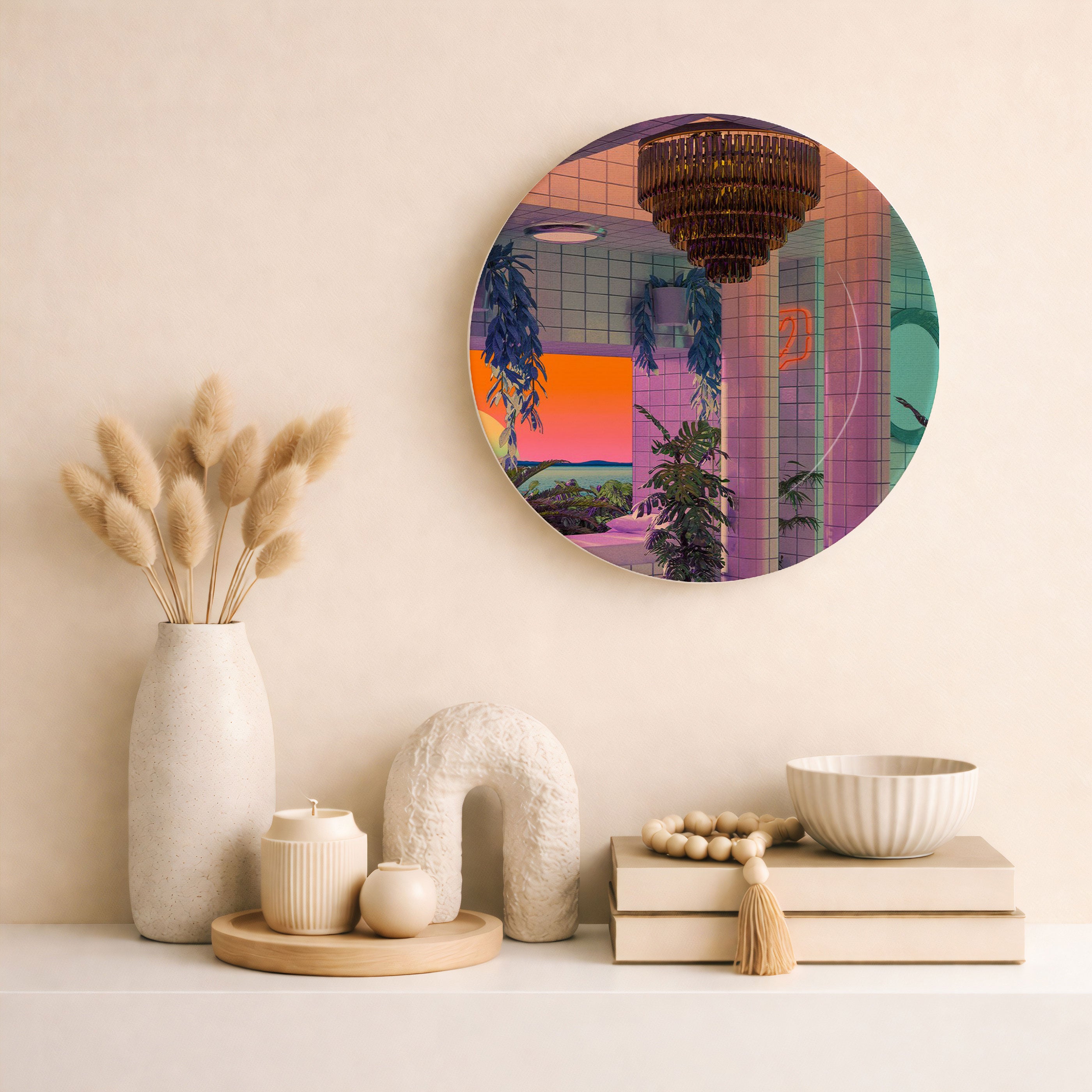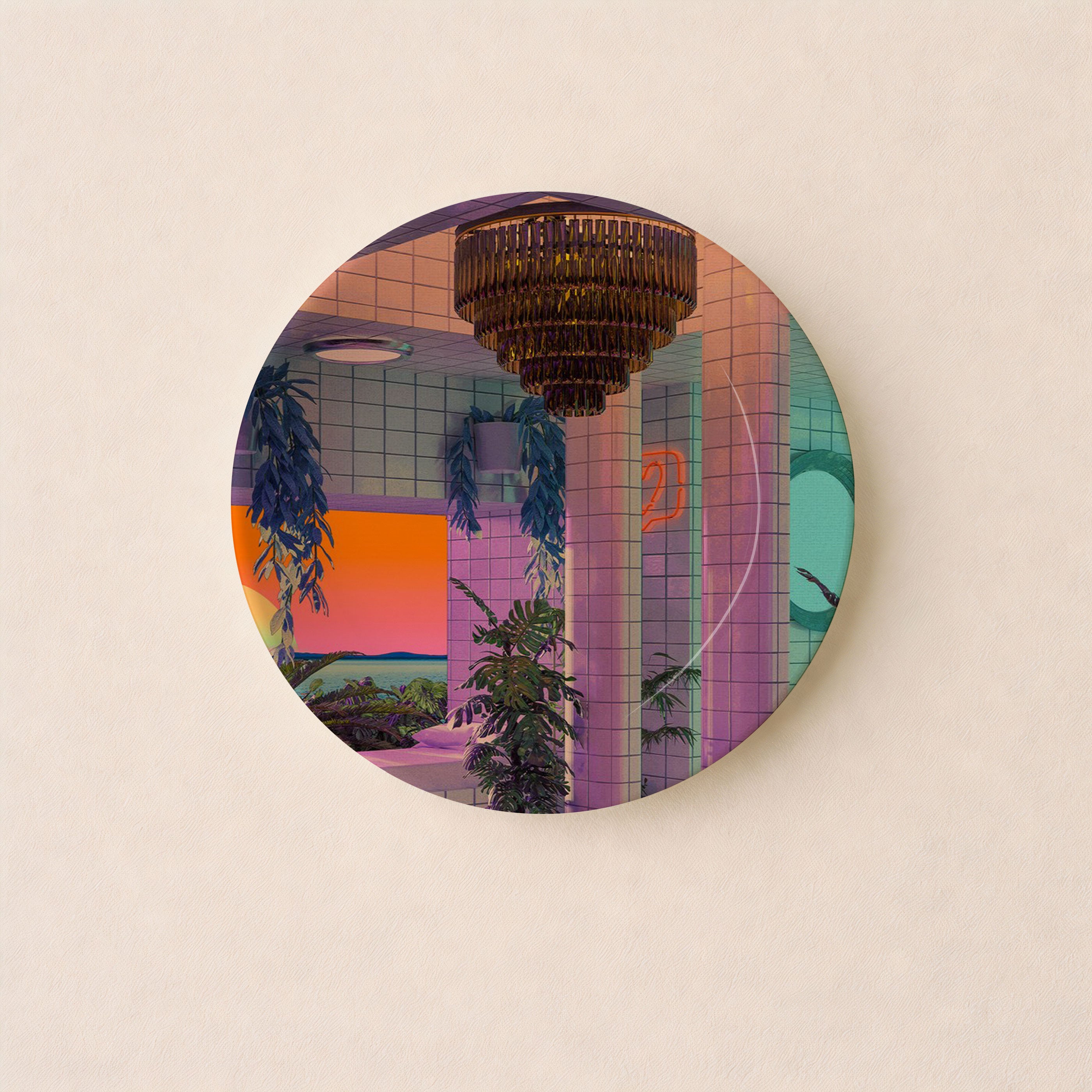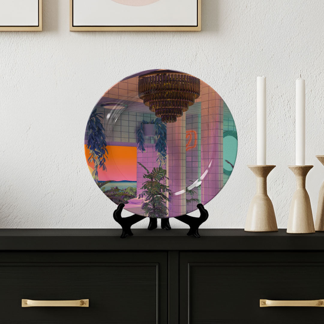 Add a bold and artistic vibe to your living space with this stylish decorative ceramic plate. Vaporwave Pool from our Decorative Art Plates Collection, features a striking, design-forward aesthetic with graphic detailing and vibrant color play. The bold yet elegant tone fits perfectly with today’s trending home and wall décor styles seamlessly blending into modern interiors, artful arrangements, or curated gallery walls.