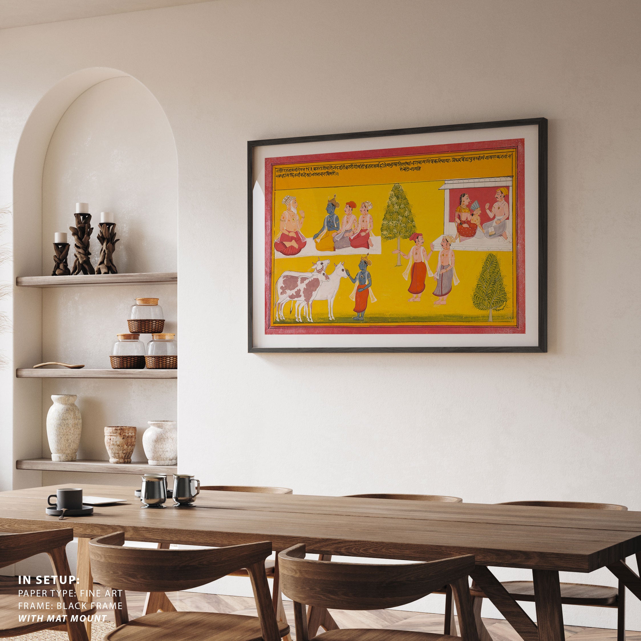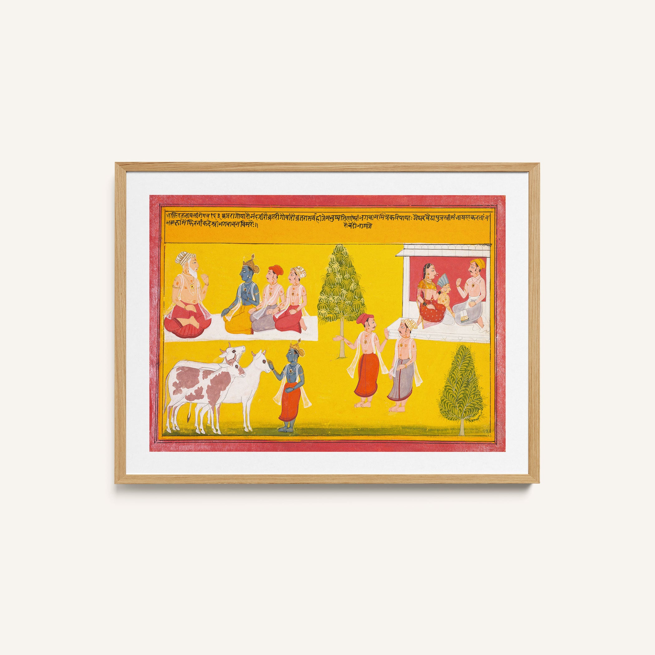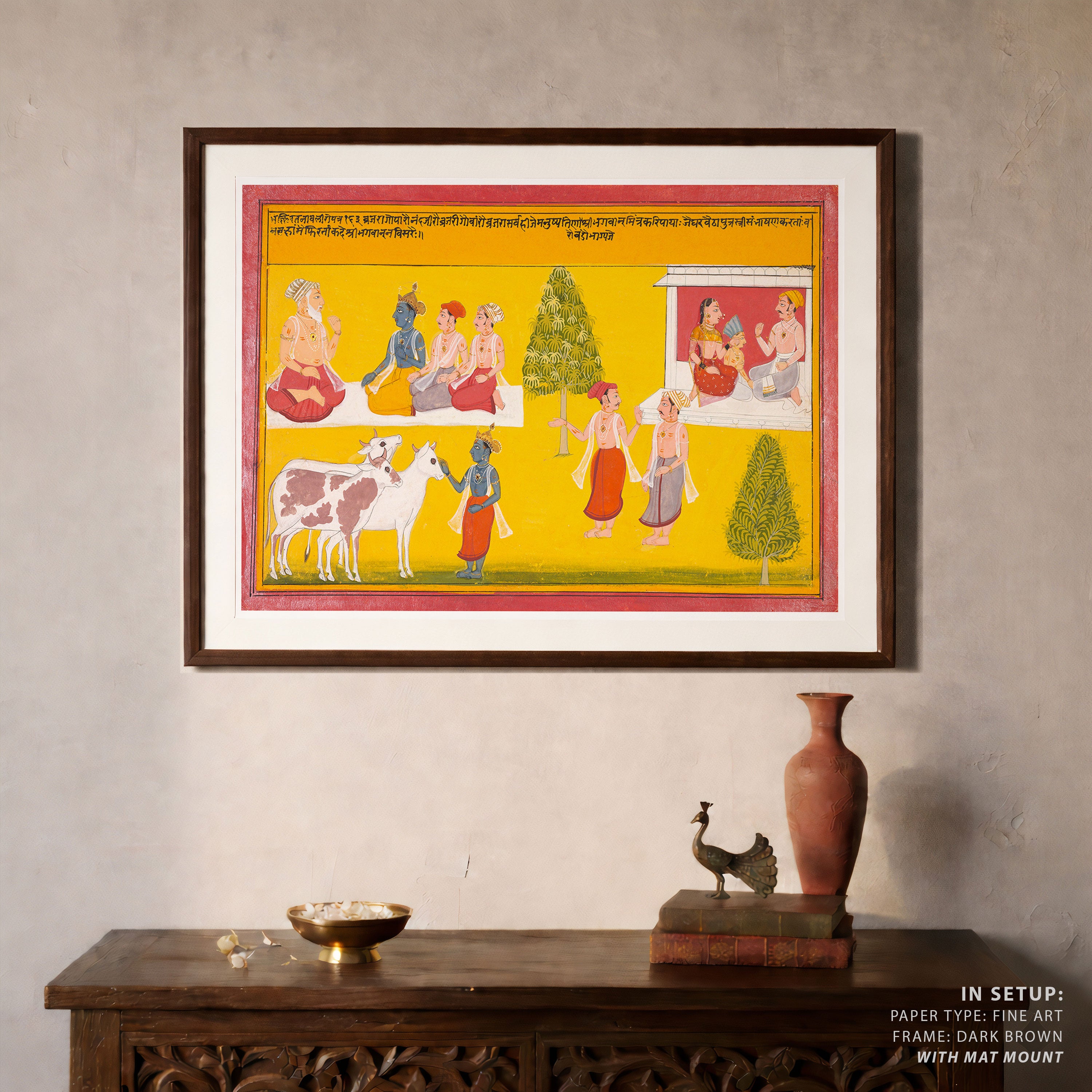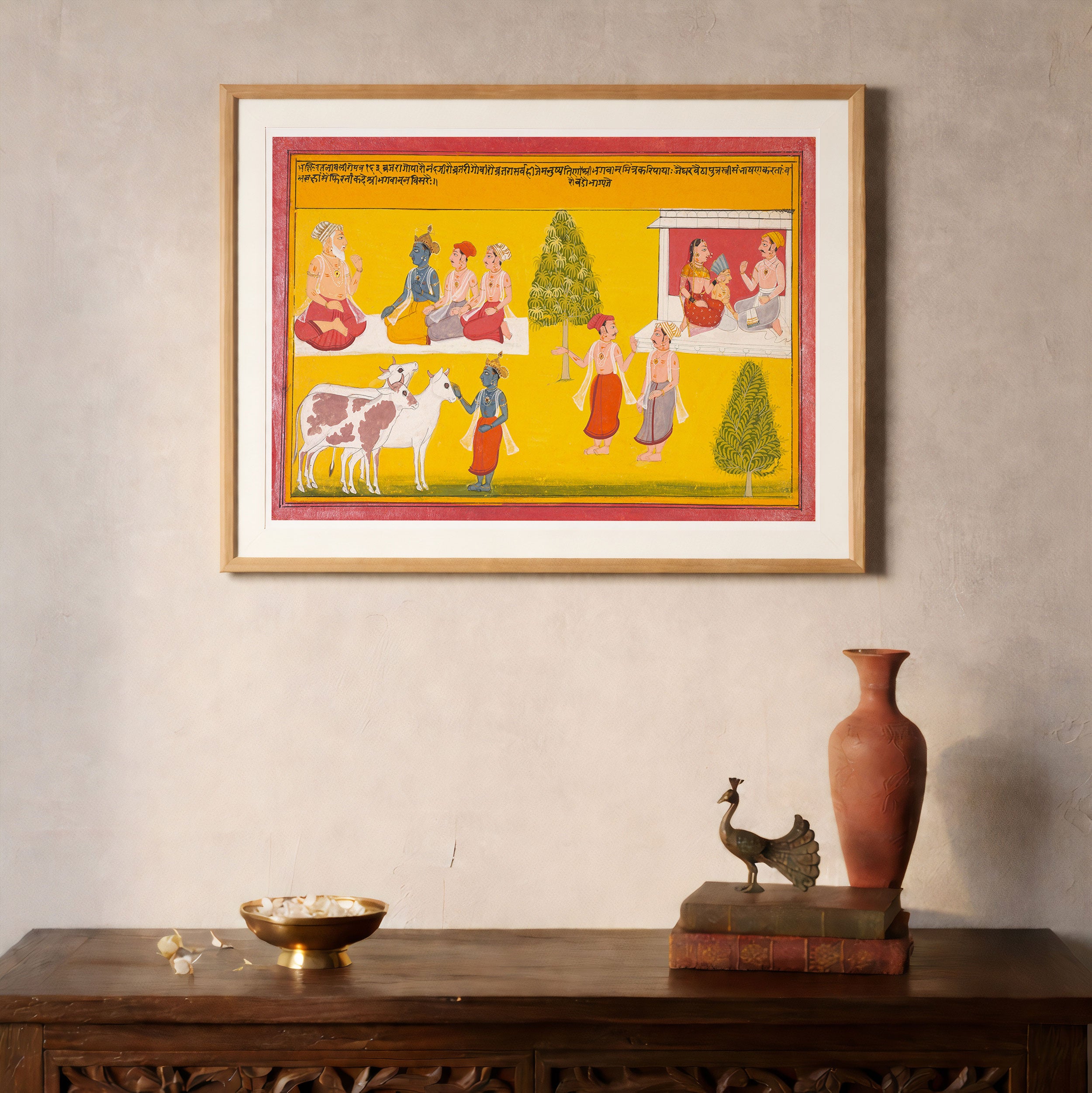 Bring elegance and cultural harmony into your space with this beautiful artwork, Friends of Krishna, from our Classical Indian Art Collection. Rooted in India’s rich classical and miniature painting traditions, this artwork showcases expressive figures, symbolic motifs, ornate architectural details, and serene natural landscapes, all rendered with refined craftsmanship and thoughtful precision. Its narrative depth and decorative richness make it ideal for traditional, heritage, eclectic, and contemporary interiors, adding warmth, character, and a timeless sense of history and storytelling to every interior.