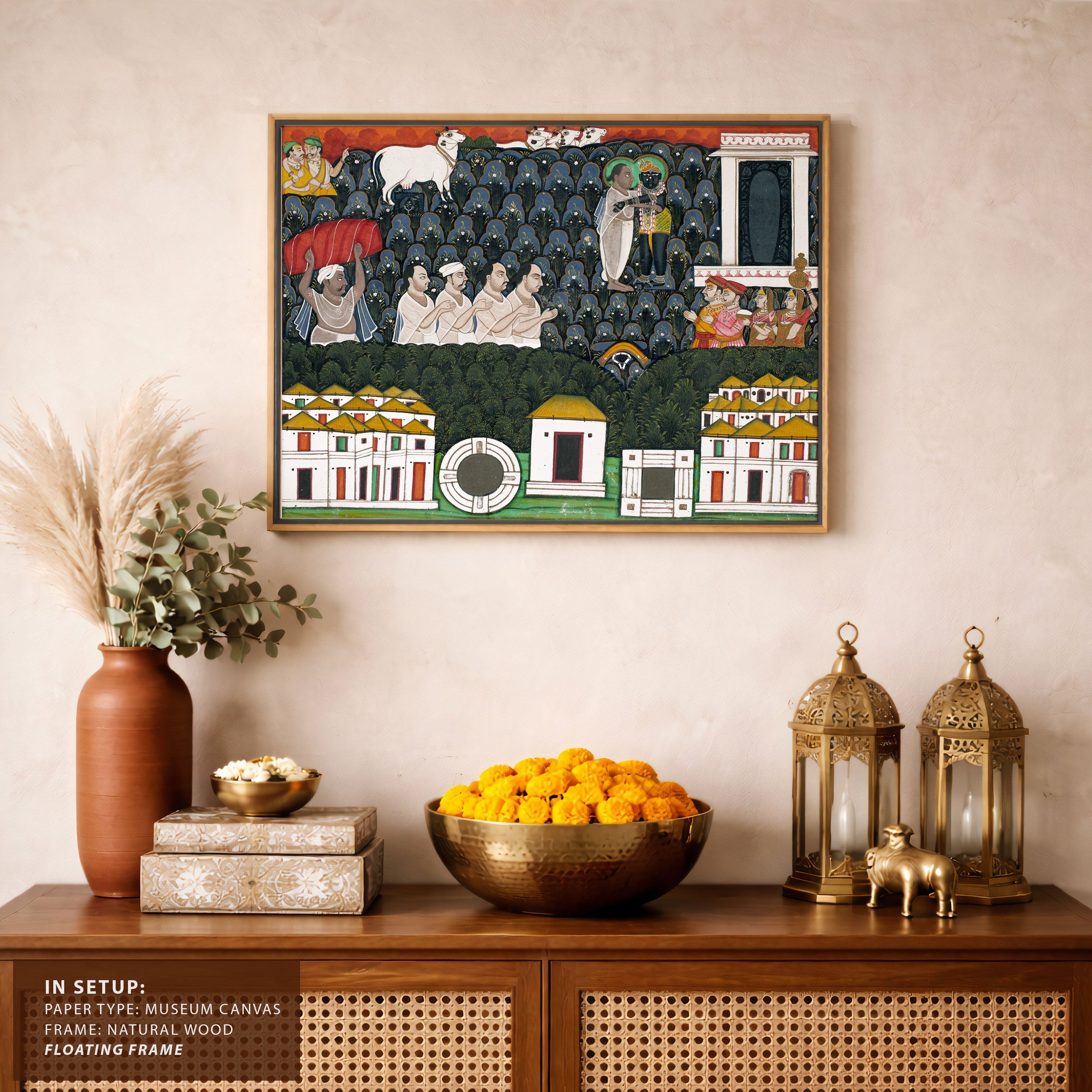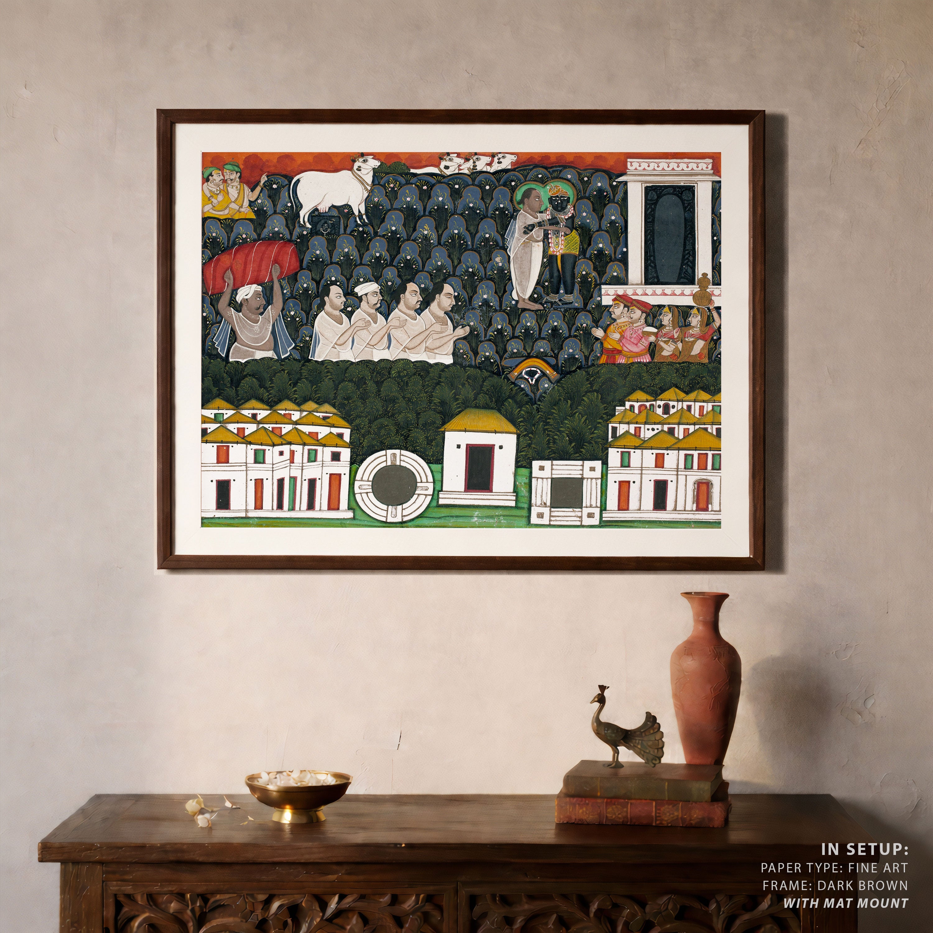 Bring elegance and cultural harmony into your space with this beautiful artwork, Pratham Milan, Shrinathji Revealing Himself to Vallabhacharya, from our Classical Indian Art Collection. Rooted in India’s rich classical and miniature painting traditions, this artwork showcases expressive figures, symbolic motifs, ornate architectural details, and serene natural landscapes, all rendered with refined craftsmanship and thoughtful precision. Its narrative depth and decorative richness make it ideal for traditional, heritage, eclectic, and contemporary interiors, adding warmth, character, and a timeless sense of history and storytelling to every interior.