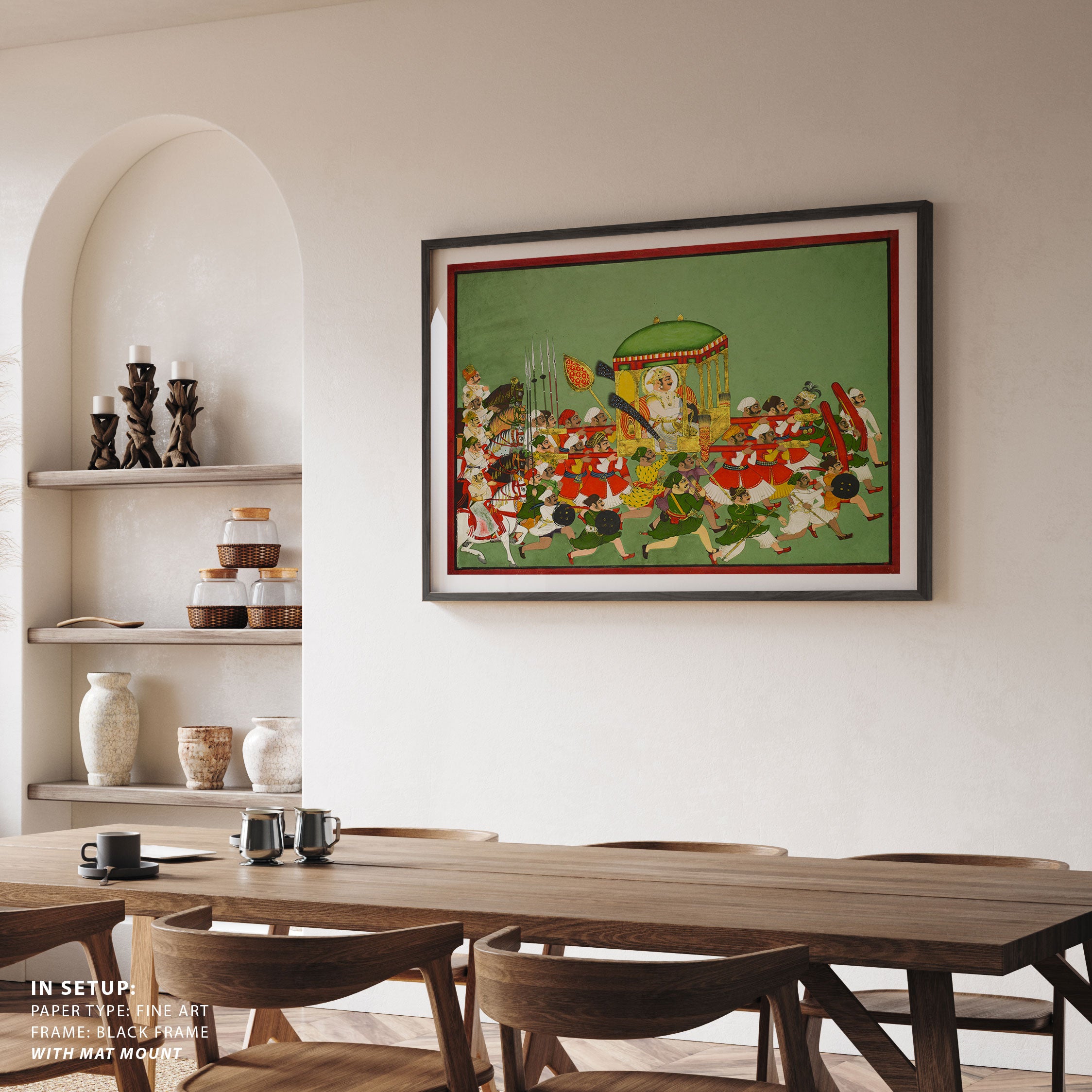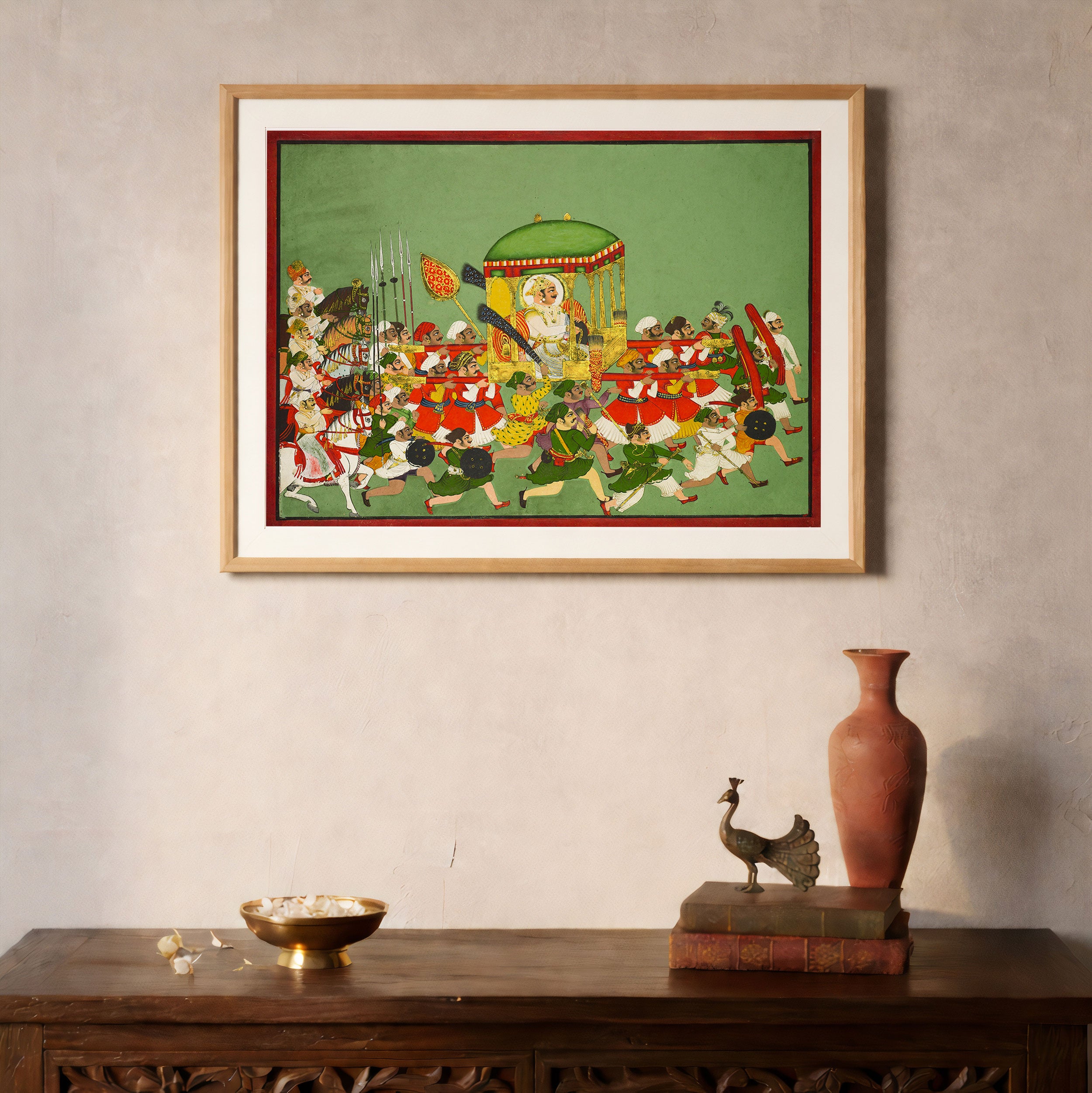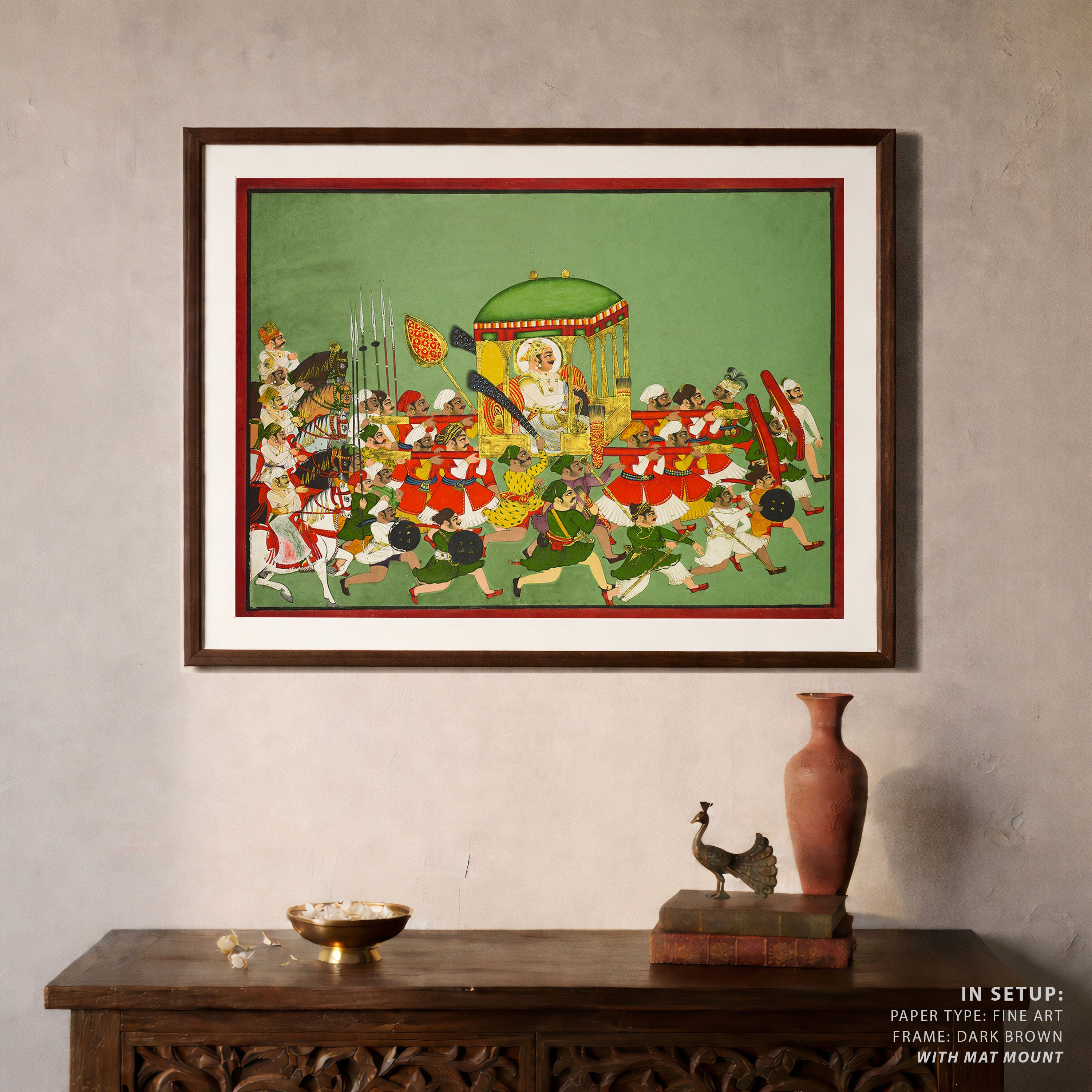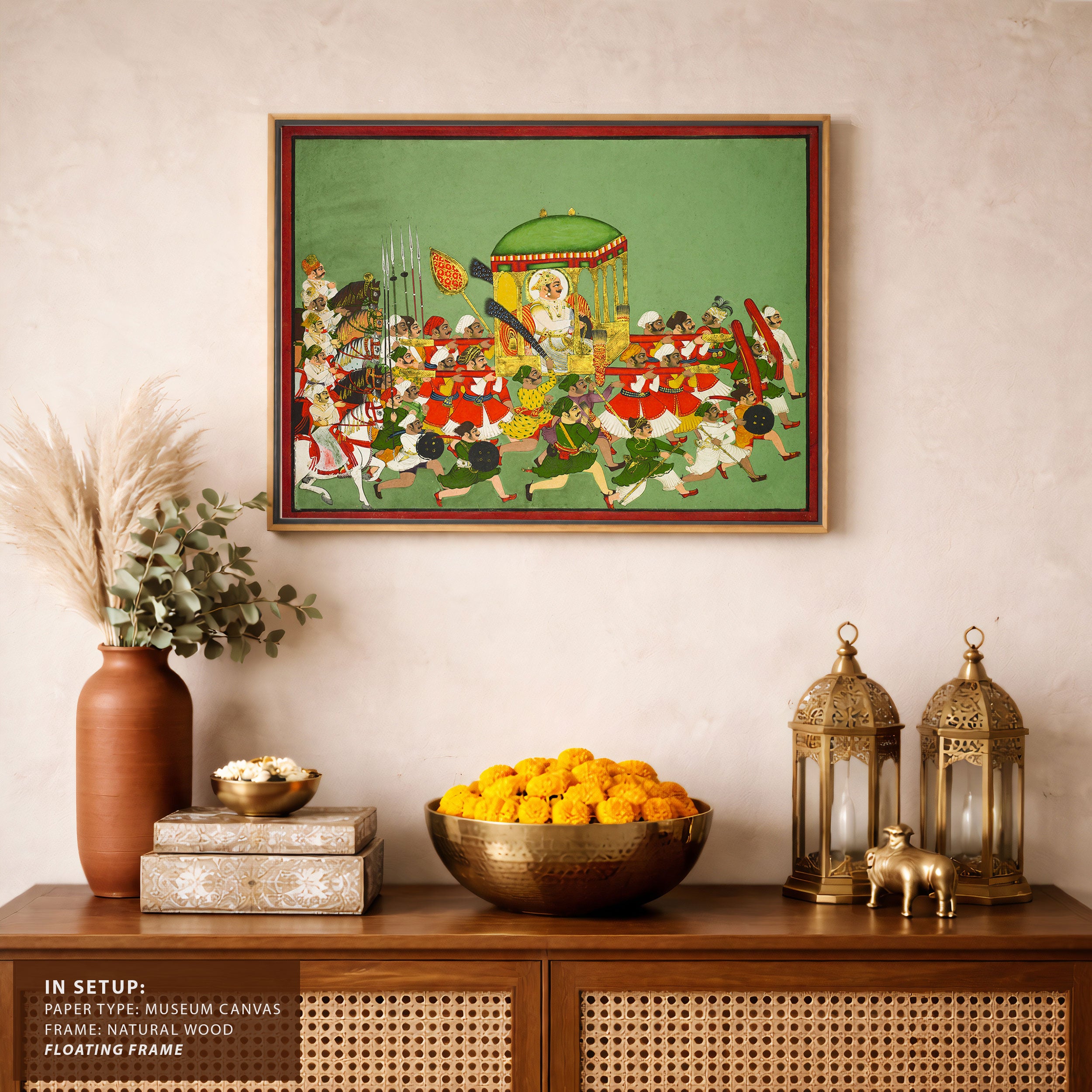 Bring elegance and cultural harmony into your space with this beautiful artwork, The Royal Procession of Maharao Chattar Sal, from our Classical Indian Art Collection. Rooted in India’s rich classical and miniature painting traditions, this artwork showcases expressive figures, symbolic motifs, ornate architectural details, and serene natural landscapes, all rendered with refined craftsmanship and thoughtful precision. Its narrative depth and decorative richness make it ideal for traditional, heritage, eclectic, and contemporary interiors, adding warmth, character, and a timeless sense of history and storytelling to every interior.
