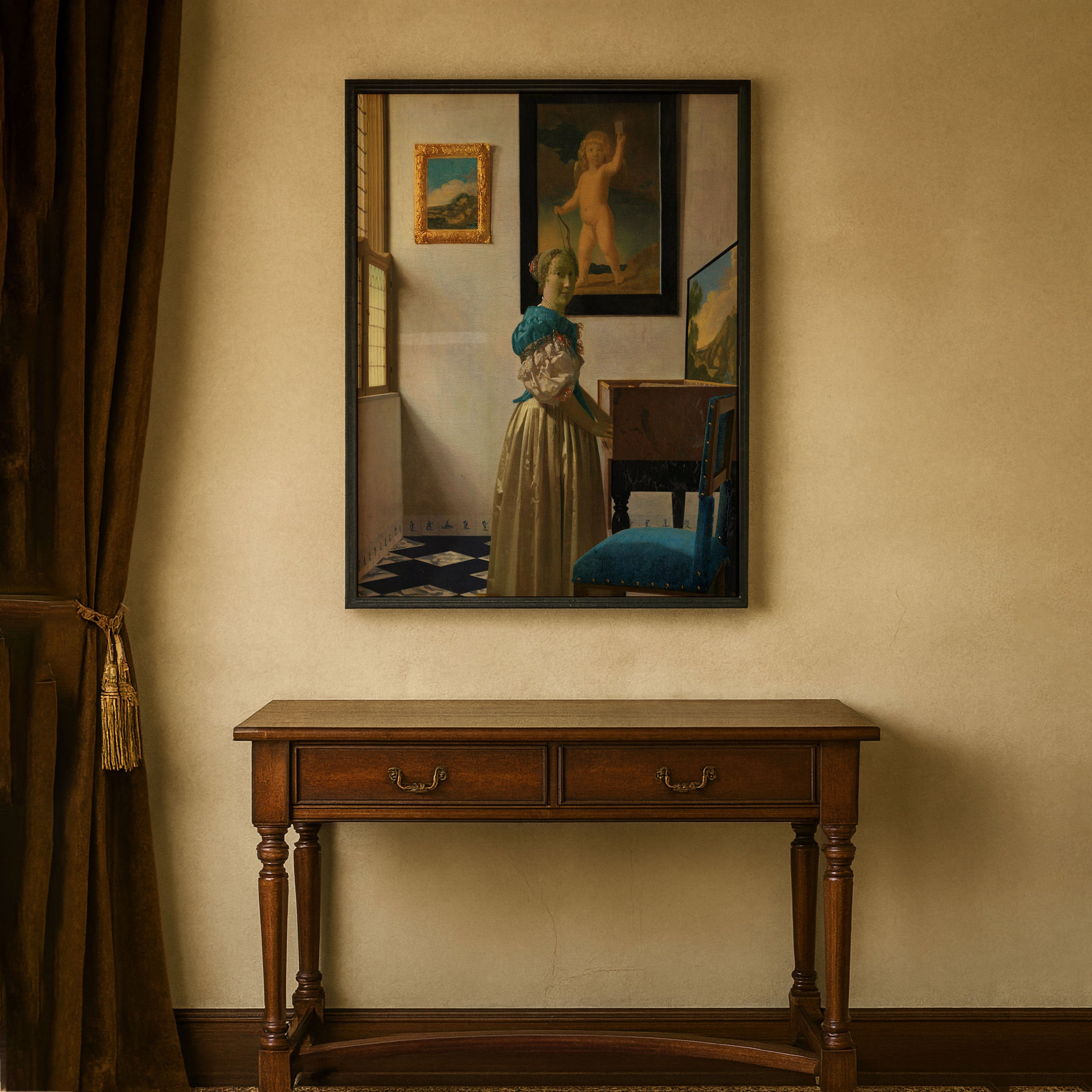 Bring elegance and harmony into your space with this beautiful artwork, Jonge Vrouw Staande Bij Een Virginaal 1670-72, from our Johannes Vermeer Art Prints Collection. This piece reveals a quiet yet compelling interplay of deep tones, soft contours, and expressive brushwork that conveys both intimacy and strength. Subtle painting details, classic art textures, and refined color layering enhance its timeless appeal. Its gentle contrasts and inviting atmosphere bring a refined and contemplative touch to any interior, enriching your space with the timeless poetry of this iconic artistic style.