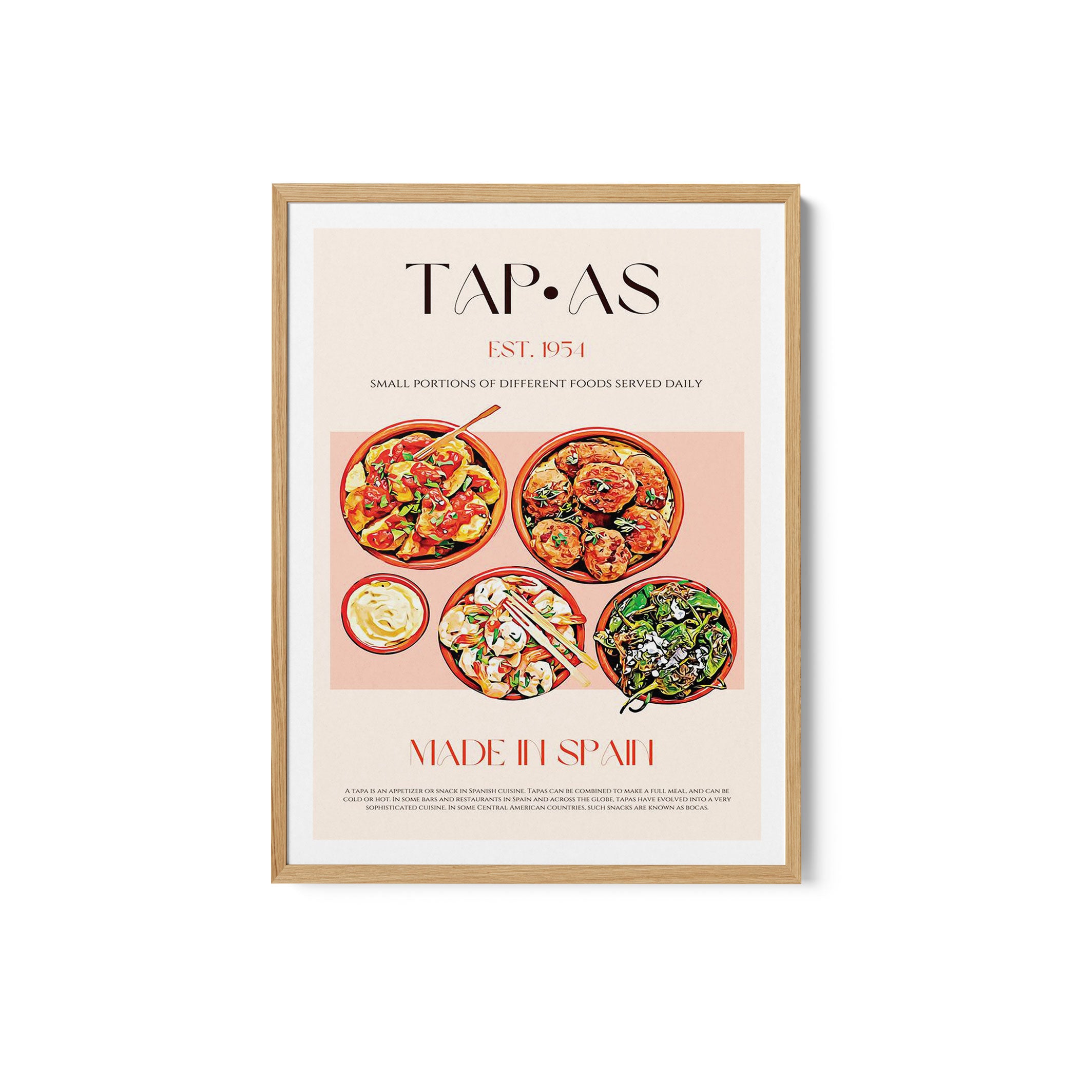 Transform your kitchen, café, or favorite serving space into a corner of creative flair with this trendy wall art print. Flavorful Spanish Bites from our Kitchen and Cafe Art Collection features an artfully inspired illustration that exudes a bold yet minimalist vibe. This modern artwork brings a stylish, design-forward mood that pairs perfectly with today’s love for culinary spaces that reflect art, individuality, and taste. Ideal for anyone who appreciates beauty, self-expression, and contemporary decor in the heart of the kitchen or the soul of a café.