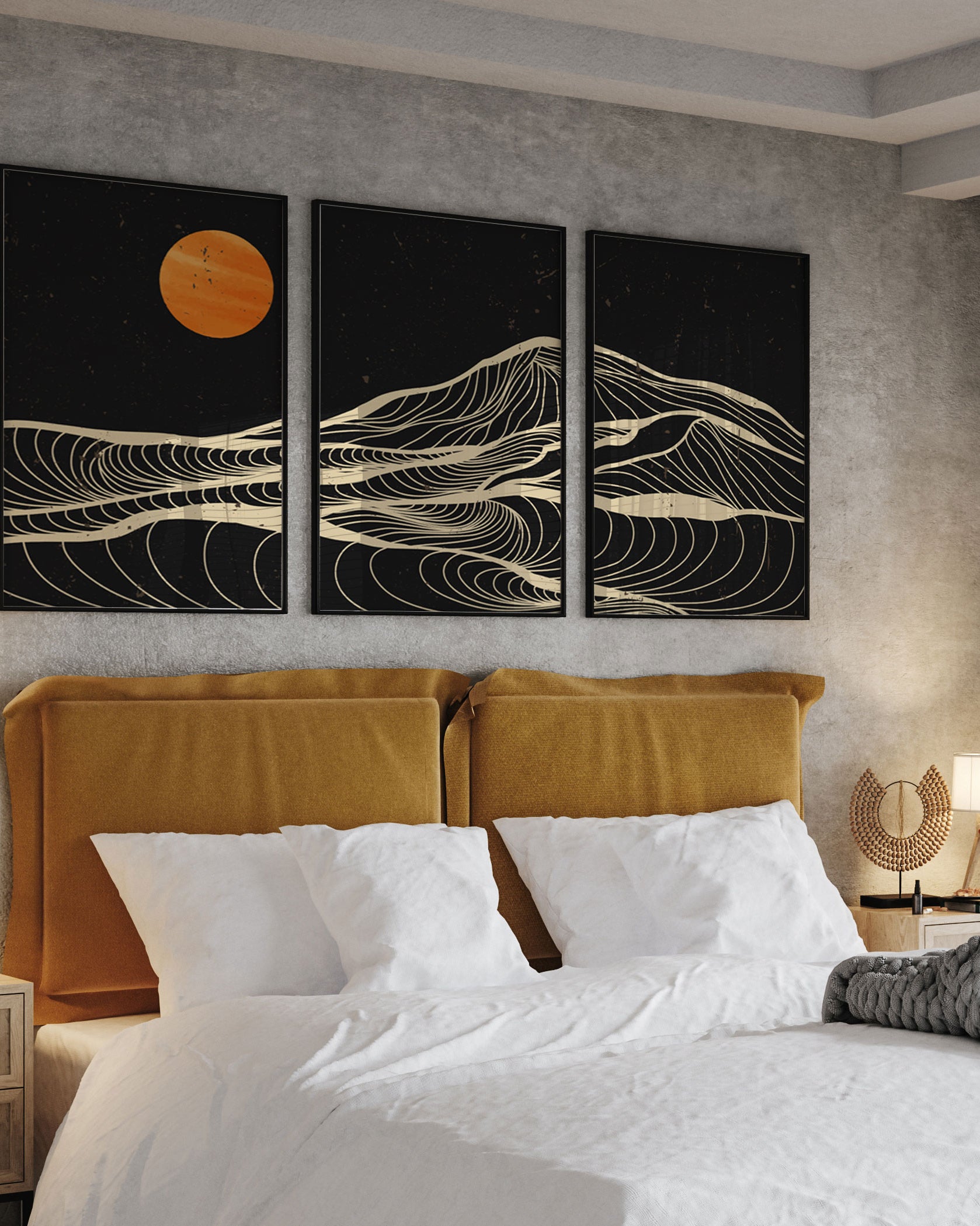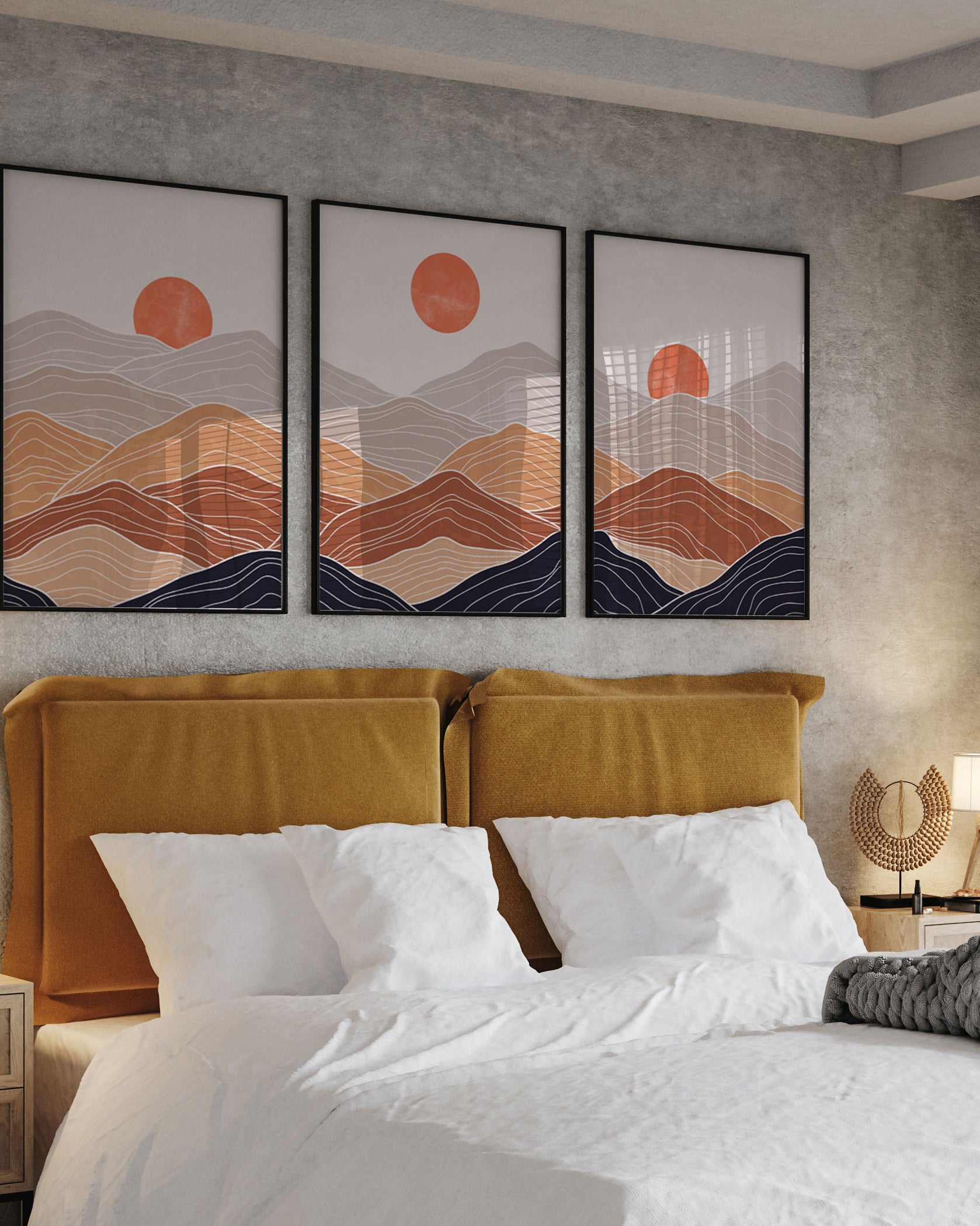 Orange bridges the energy of red and the warmth of yellow, making it a powerful yet comforting colour in interiors. In wall art, orange adds movement, warmth, and personality while pairing beautifully with neutrals, beige, white, black, and earthy tones.