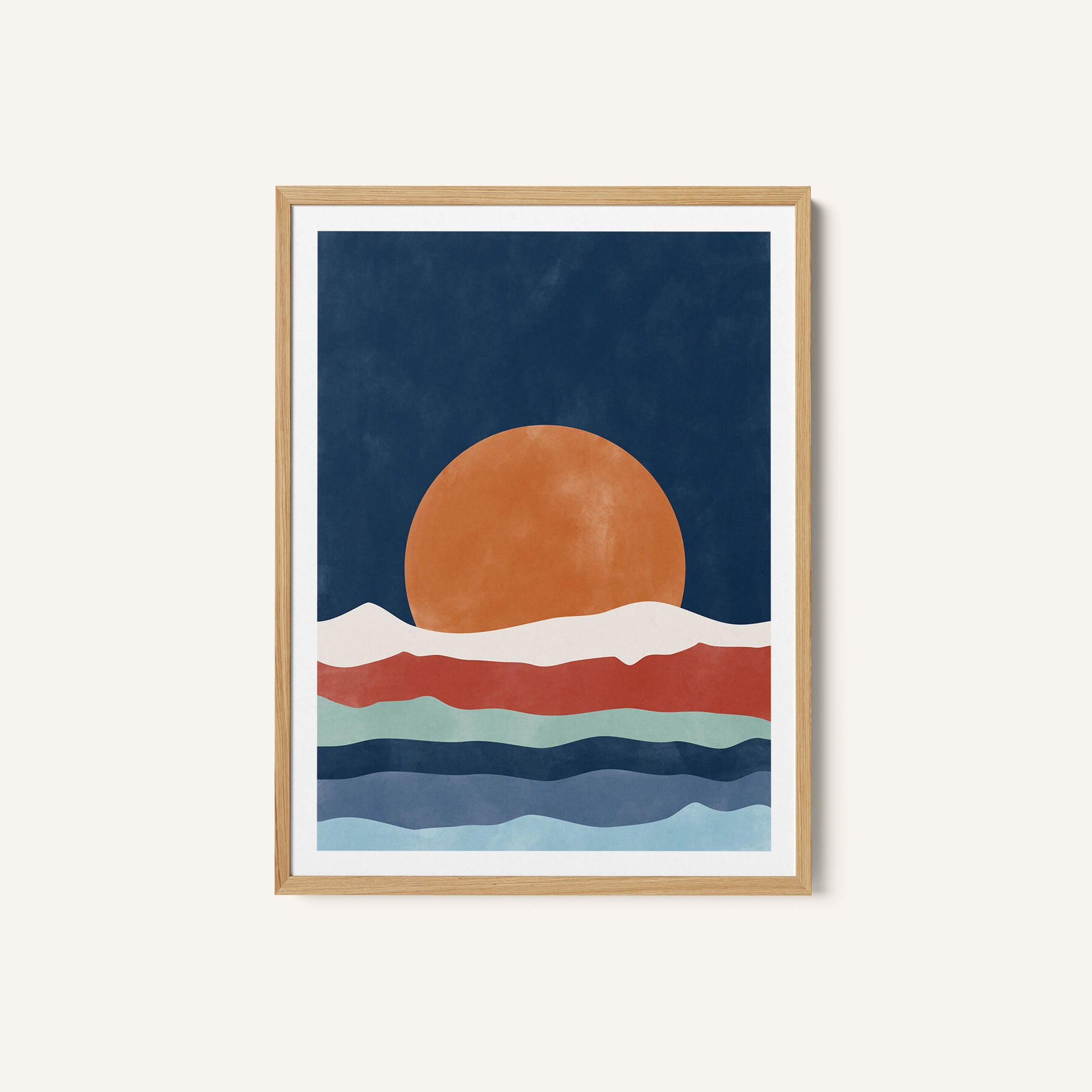 Large Orange Sun Setting Over Stylized Waves