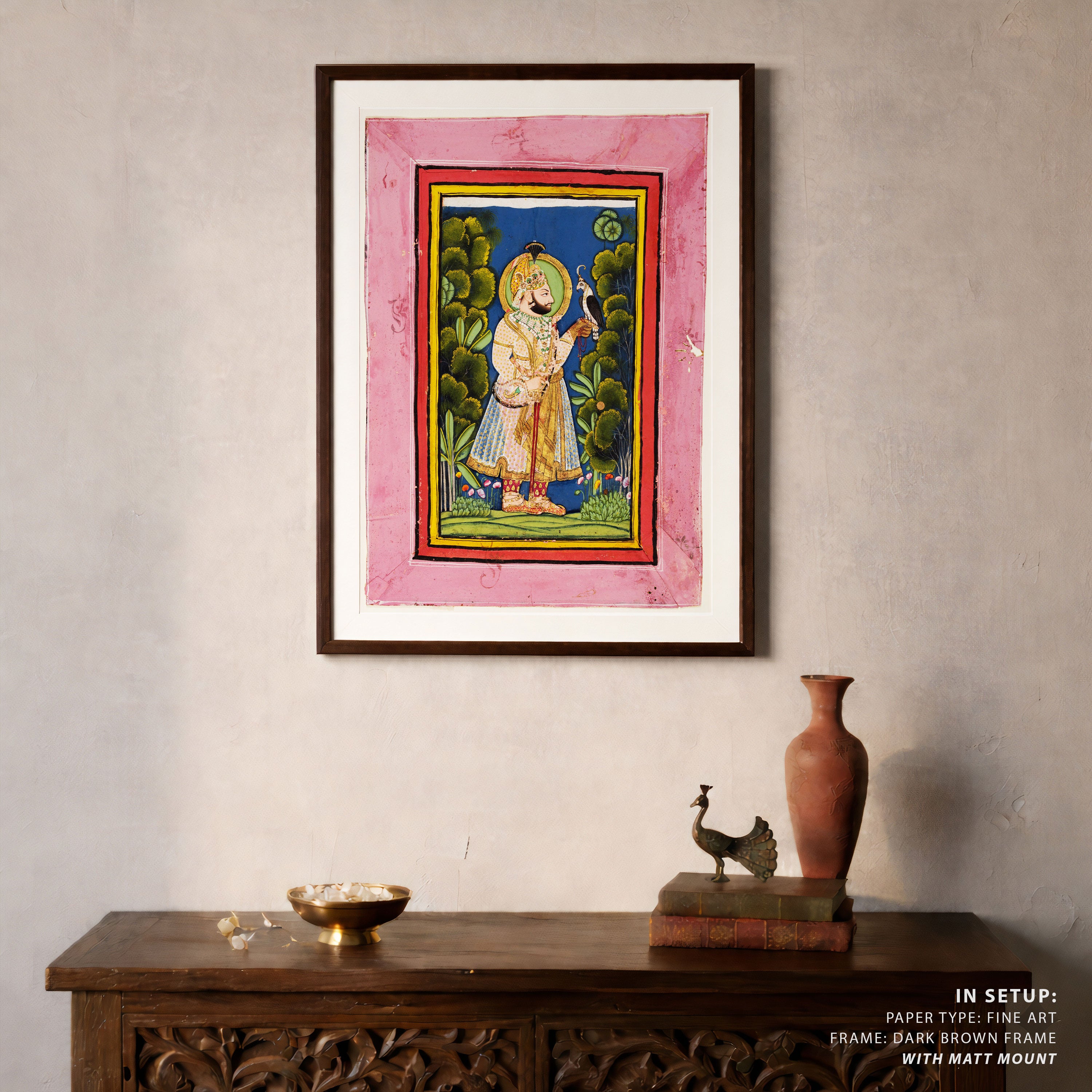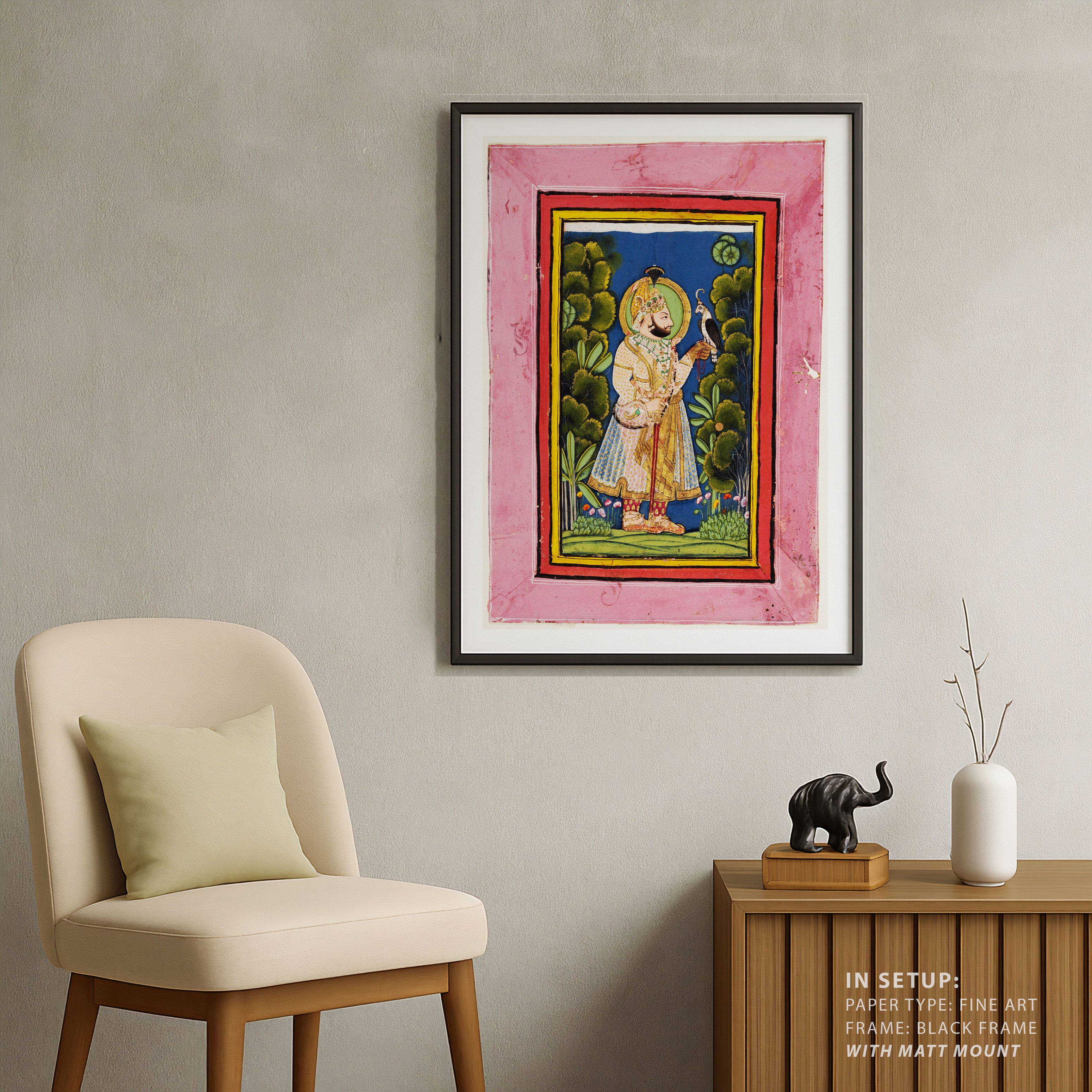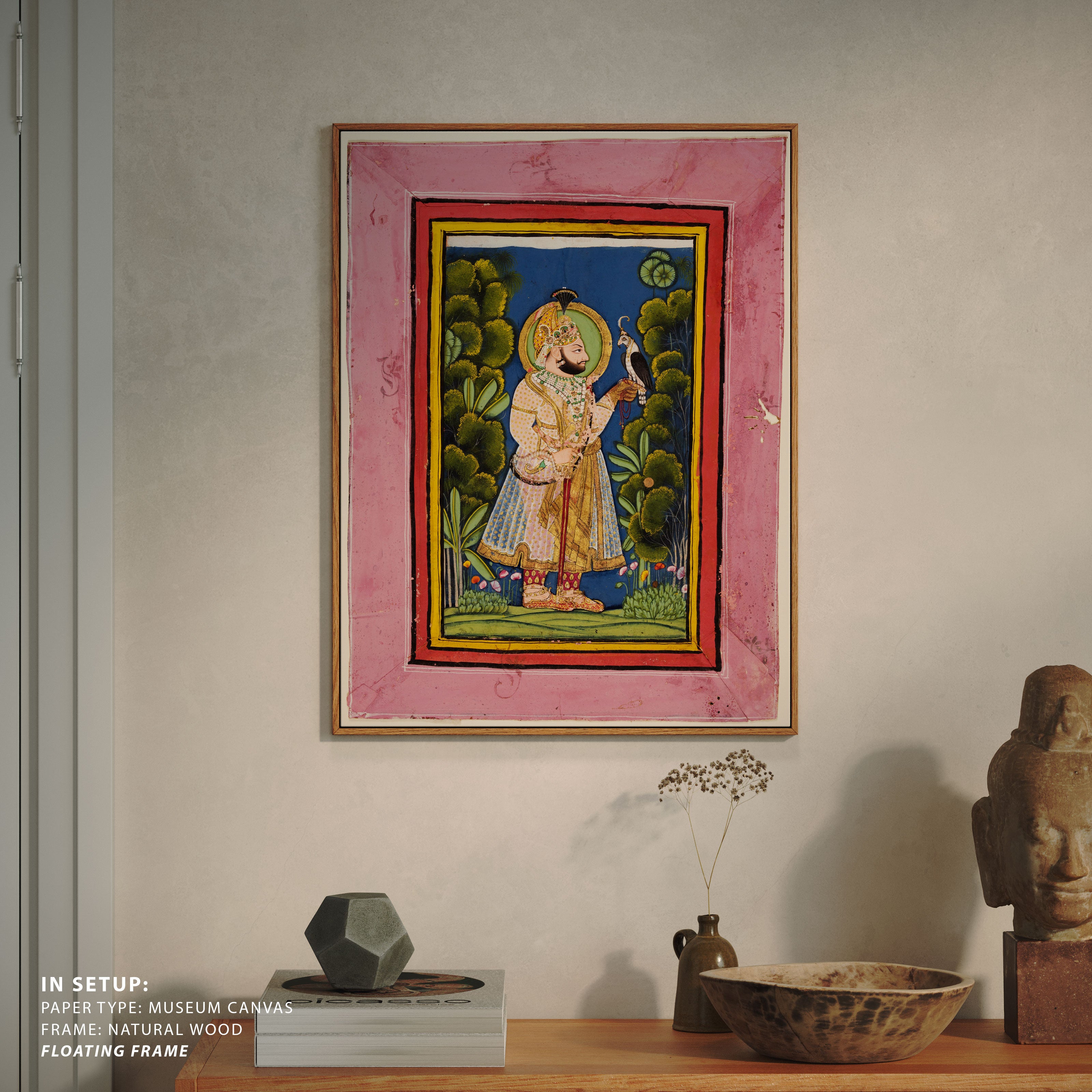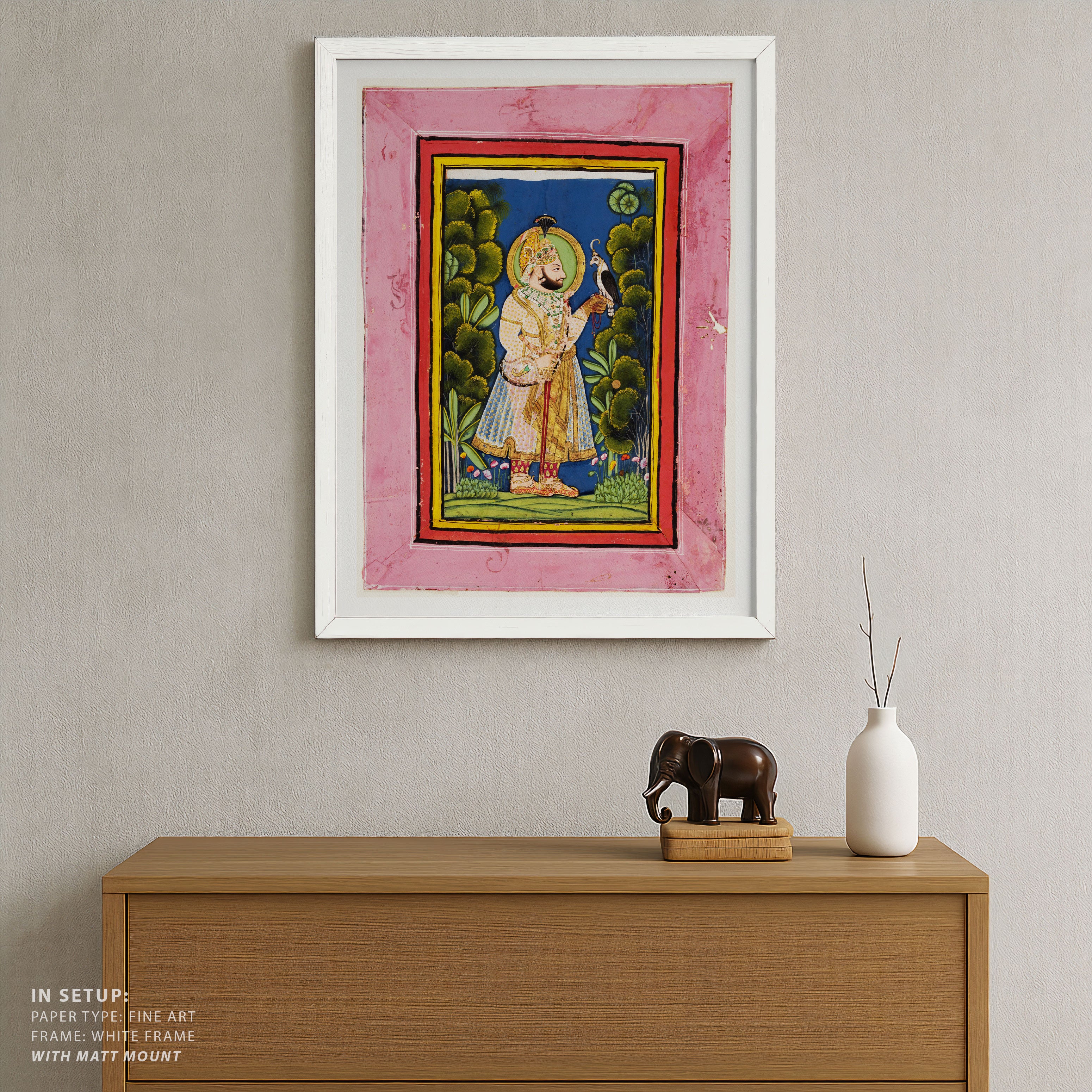 Bring elegance and cultural harmony into your space with this beautiful artwork, Maharana Jawan Singh with Falcon, from our Classical Indian Art Collection. This timeless artwork features expressive figures, symbolic motifs, intricate detailing, and harmonious compositions inspired by India’s rich artistic traditions. Perfect for traditional, heritage, eclectic, and contemporary interiors, Indian folk and classical wall art adds depth, warmth, and a sense of history and storytelling to every interior.