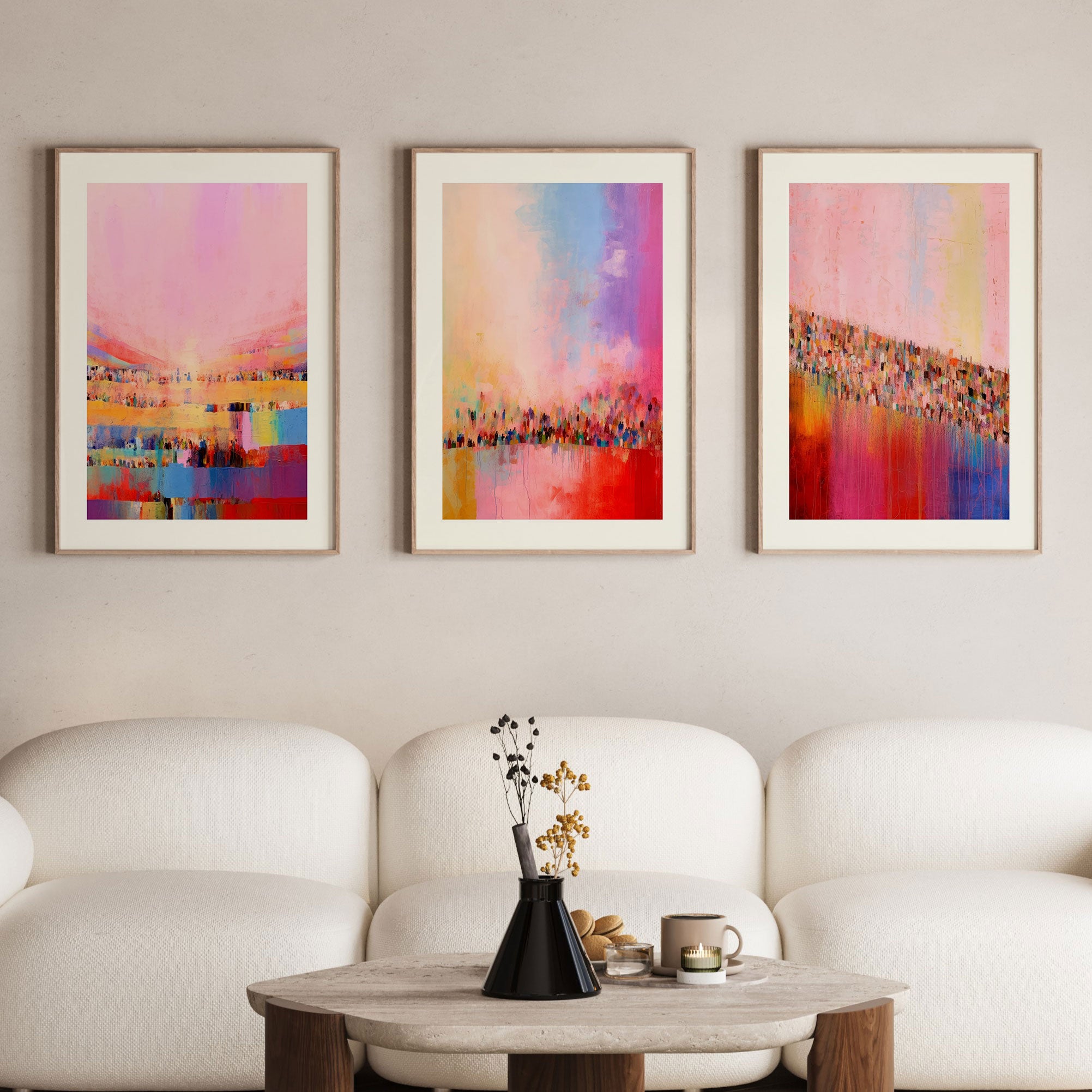 Pink is a colour associated with warmth, creativity, and calm. In interiors, it softens strong lines and adds subtle contrast without overpowering the décor. Pink wall art pairs beautifully with white, beige, grey, black, and wooden elements, making it a versatile choice for modern UK homes.
