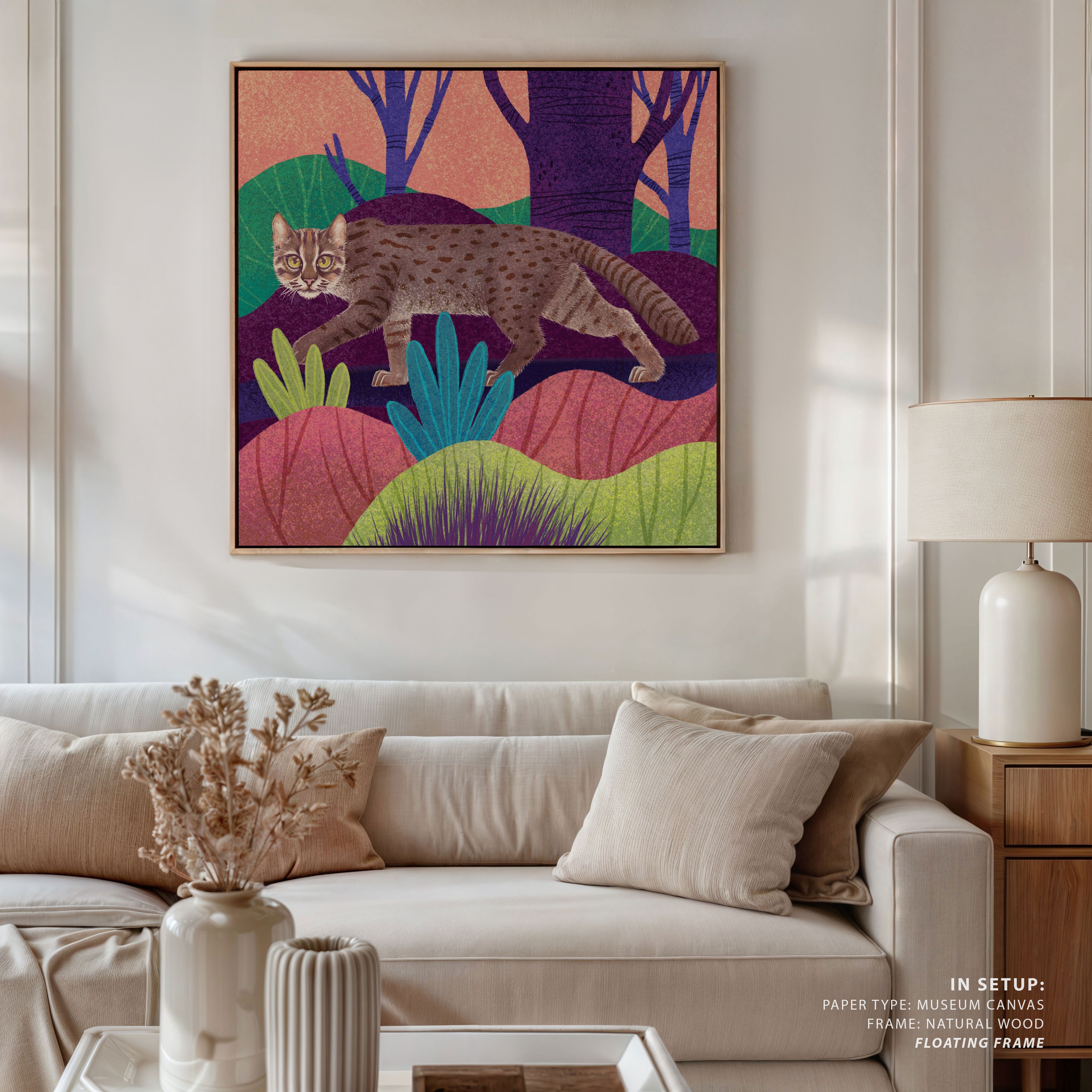 Bring a sense of wonder and thoughtful storytelling into your space with this striking artwork, Wild Cat - Rusty Spotted Cat, by Rohan Dahotre. Inspired by nature, wildlife, and the raw beauty of the natural world, each piece reflects the artist’s deep connection with the wilderness and his commitment to wildlife awareness and conservation.