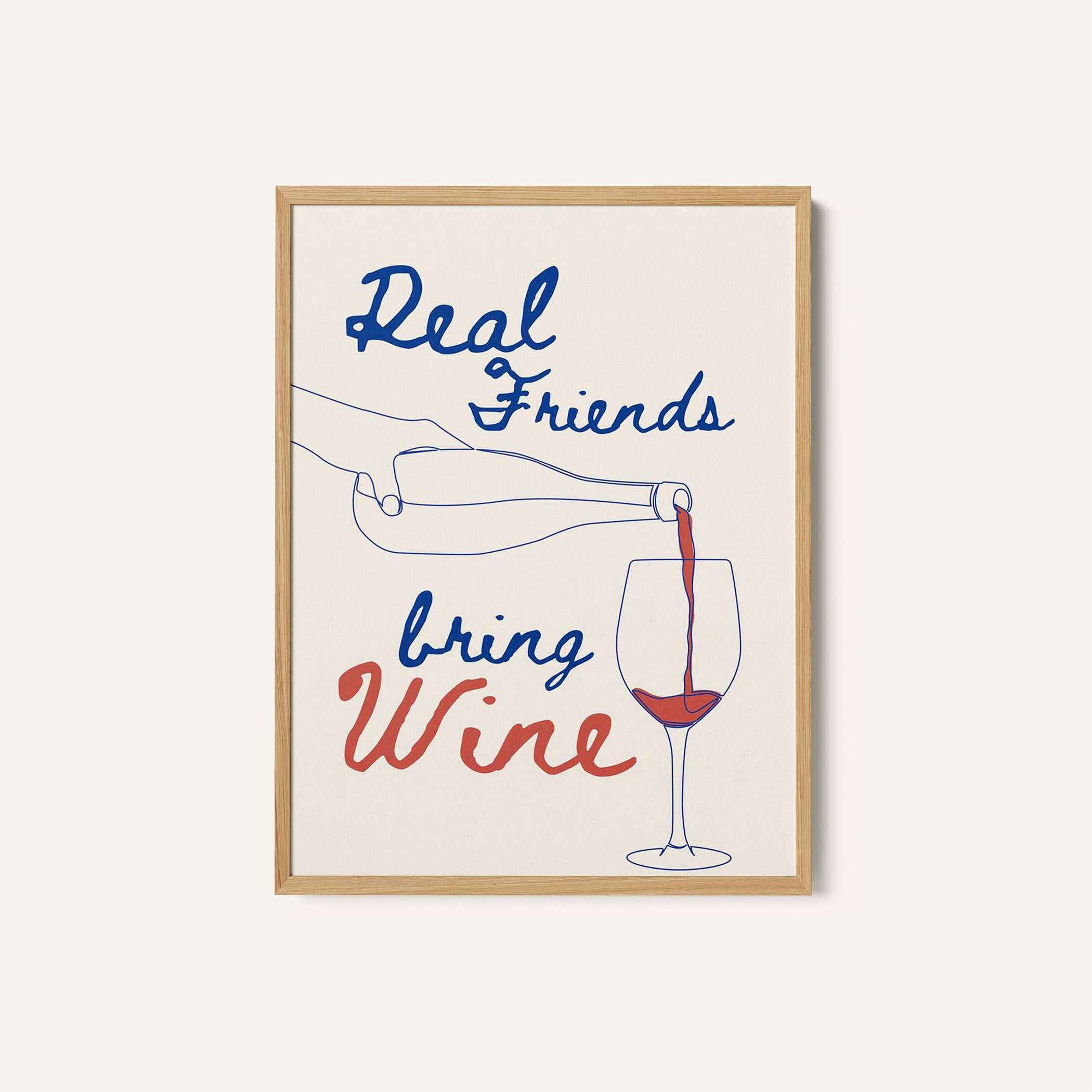 Transform your kitchen, café, or favorite serving space into a corner of creative flair with this trendy wall art print. Real Friends Bring Wine from our Kitchen and Cafe Art Collection features an artfully inspired illustration that exudes a bold yet minimalist vibe. This modern artwork brings a stylish, design-forward mood that pairs perfectly with today’s love for culinary spaces that reflect art, individuality, and taste. Ideal for anyone who appreciates beauty, self-expression, and contemporary decor in the heart of the kitchen or the soul of a café.