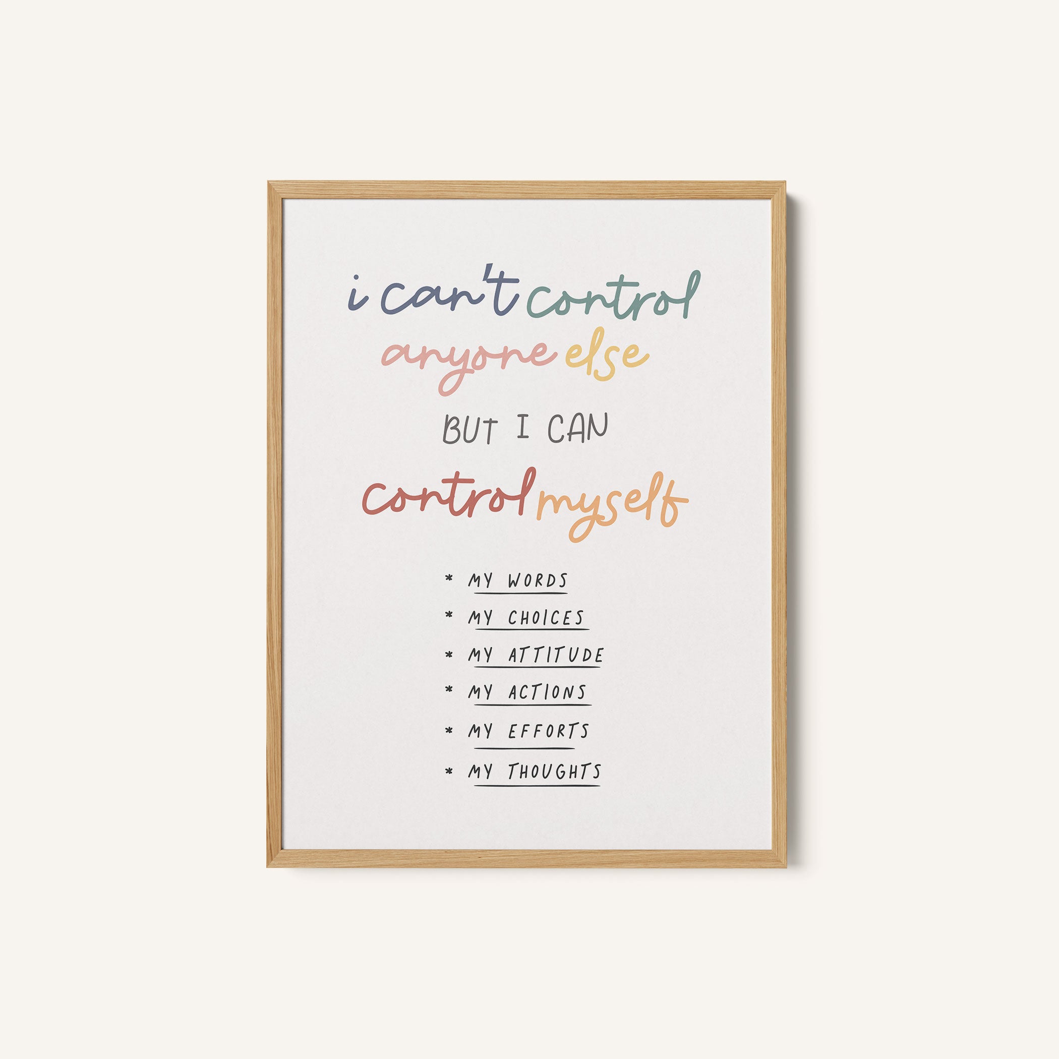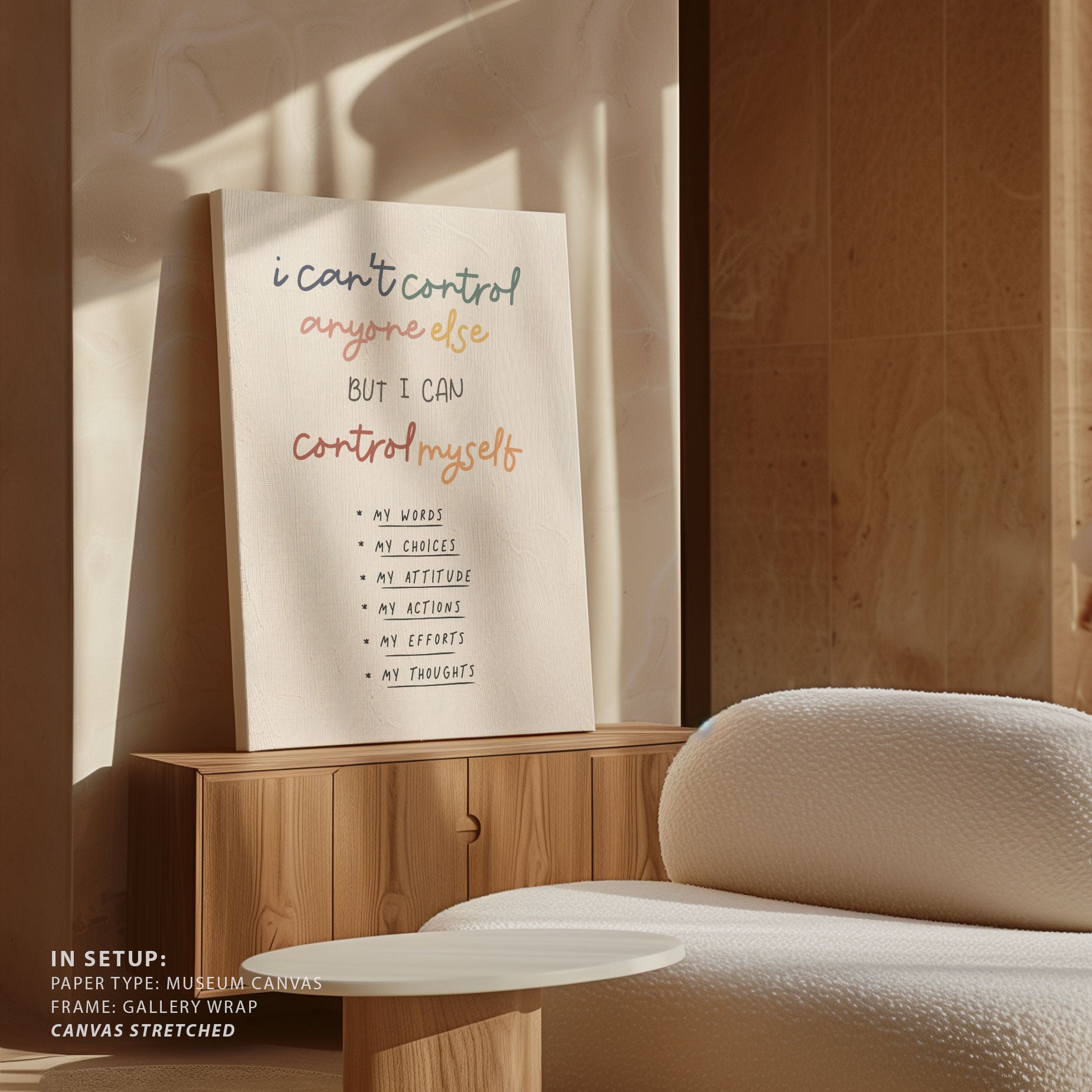 Transport your space to a simpler, quieter era with this quote art print. Control Myself 04 from our Quotes and Text Collection, reimagined as a poetic visual expression. Picture bold, elegant lettering framed against a soft, minimal backdrop, warm tones blending with faded hues. The message feels peaceful and timeless, as if you’re looking through a window to another place and day.