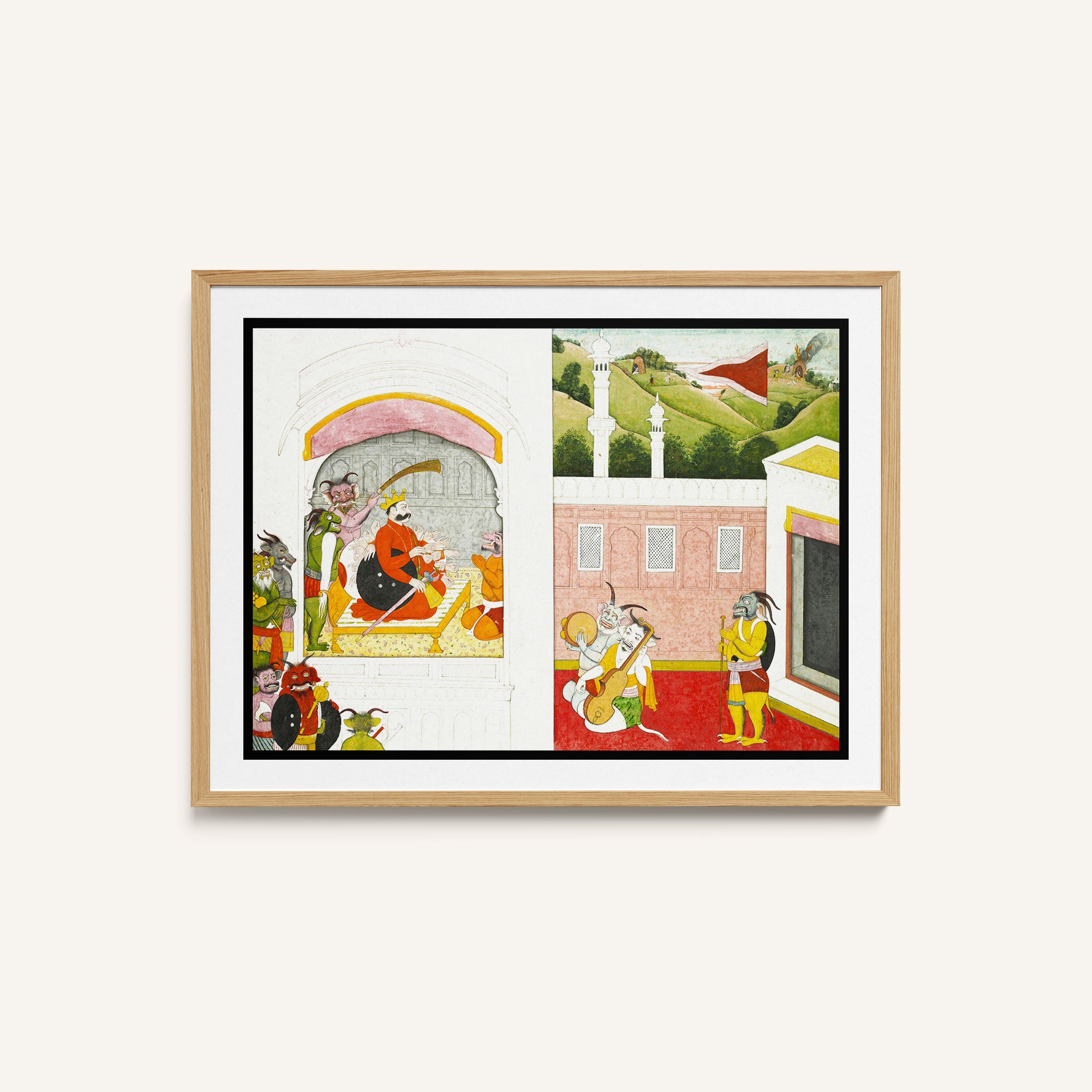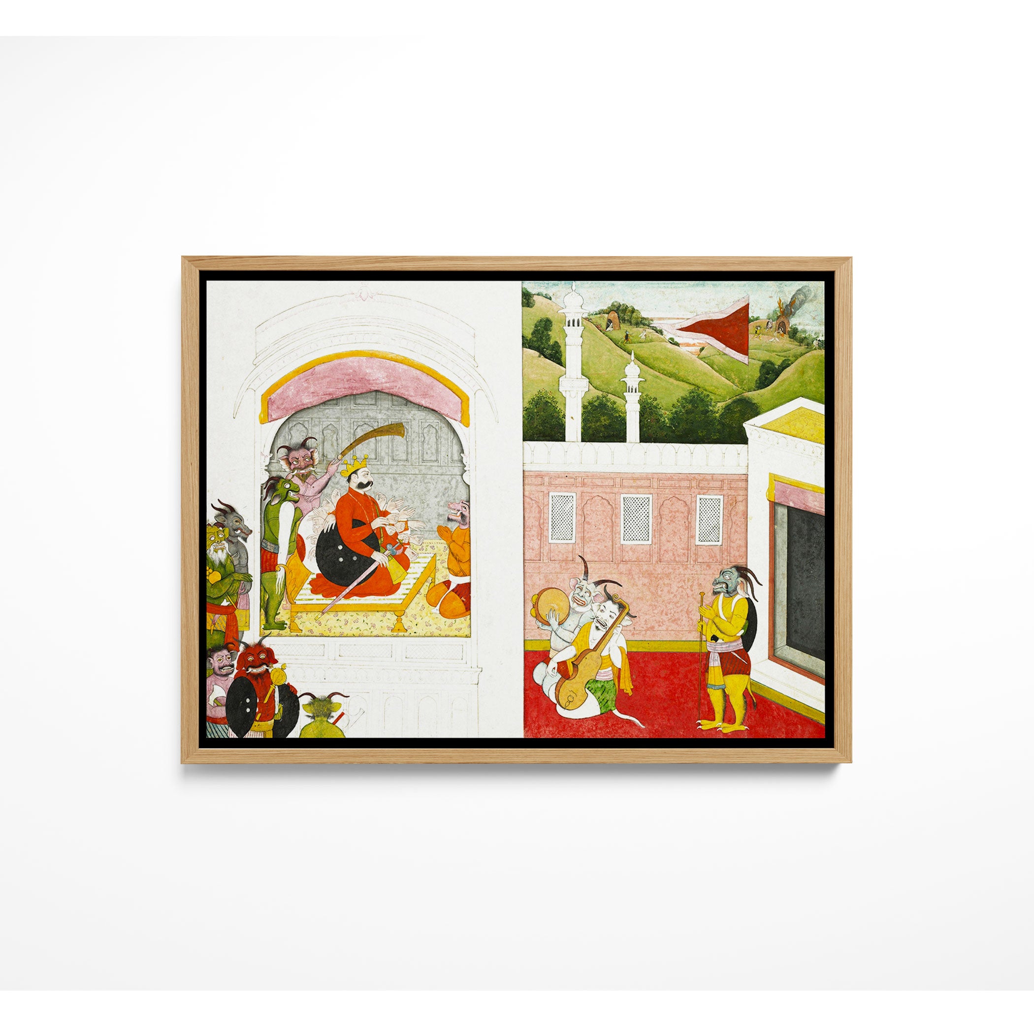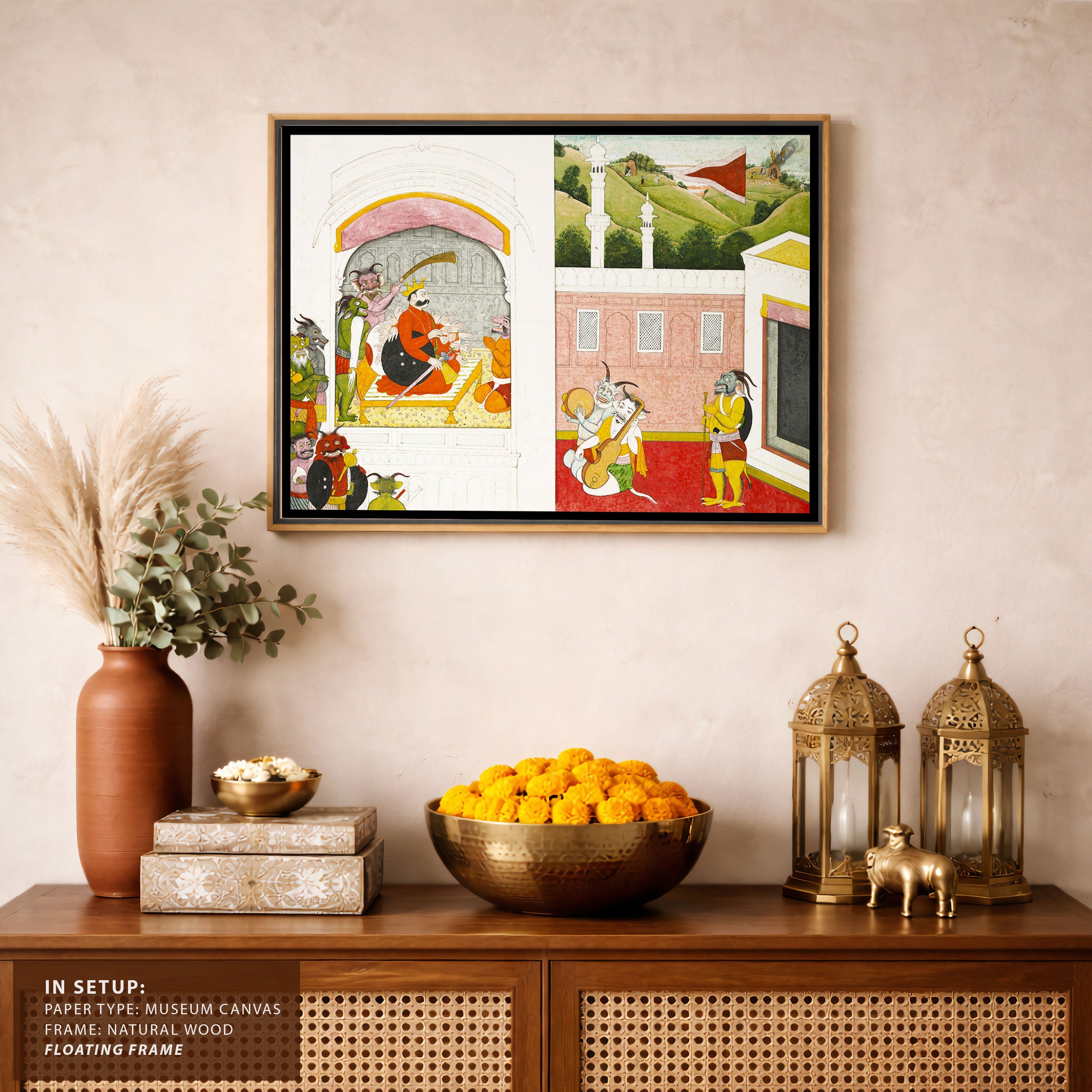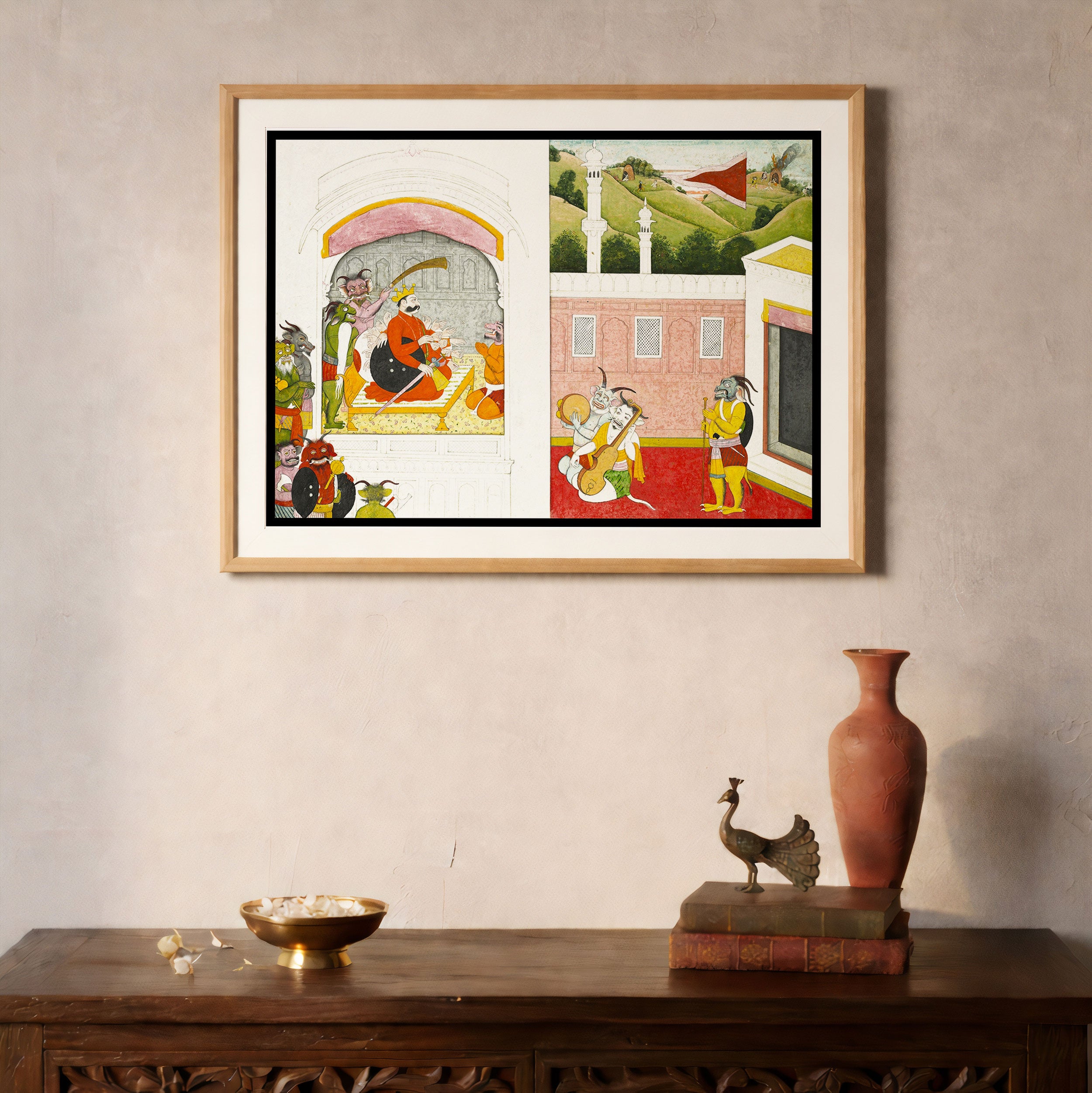 Bring elegance and cultural harmony into your space with this beautiful artwork, King Bana Enjoying Music in His Court, from our Classical Indian Art Collection. Rooted in India’s rich classical and miniature painting traditions, this artwork showcases expressive figures, symbolic motifs, ornate architectural details, and serene natural landscapes, all rendered with refined craftsmanship and thoughtful precision. Its narrative depth and decorative richness make it ideal for traditional, heritage, eclectic, and contemporary interiors, adding warmth, character, and a timeless sense of history and storytelling to every interior.