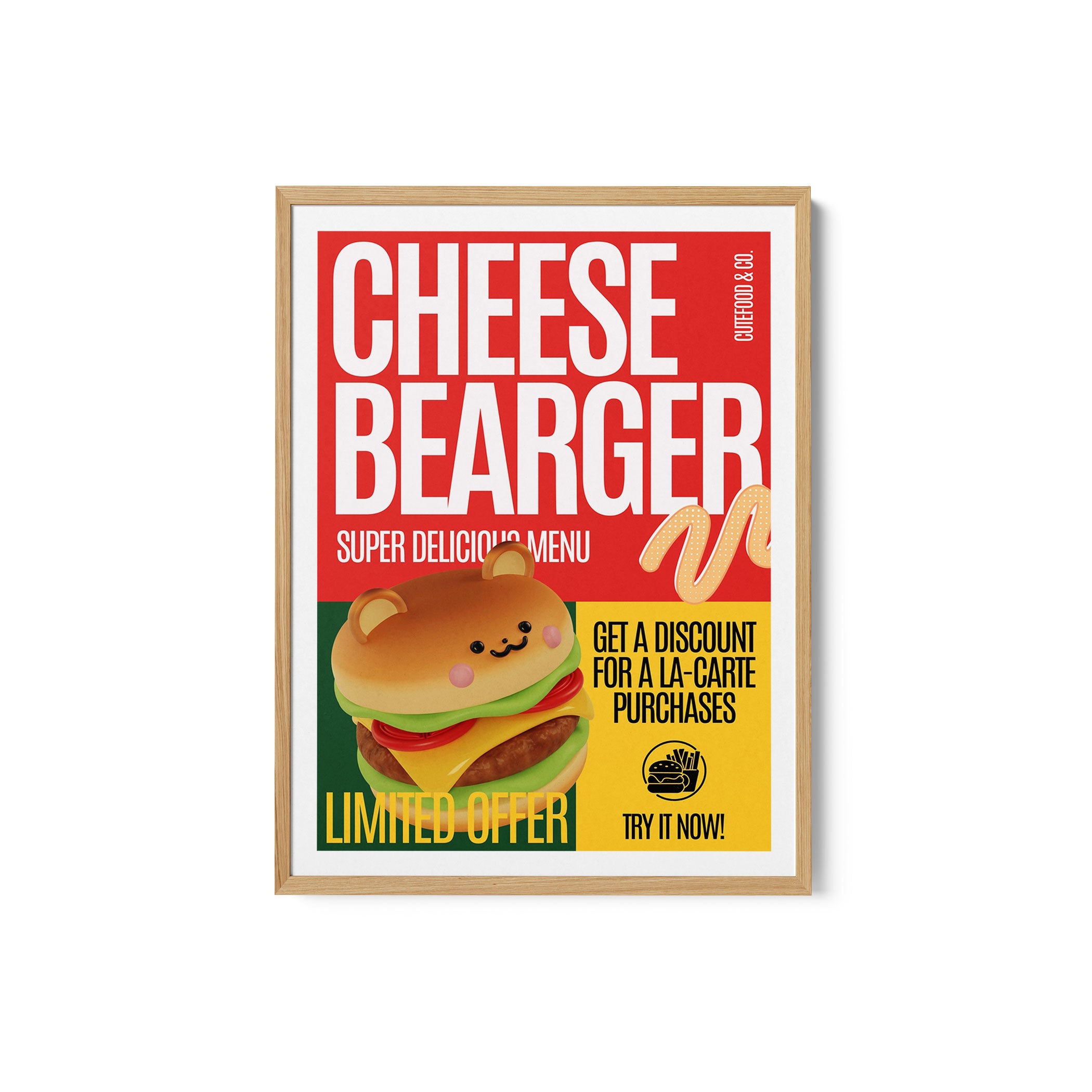Turn your kitchen or café into a haven of slow mornings and gentle ambiance with this trendy wall art print. Cheese Burger Offer from our Kitchen and Café Art Prints Collection, featuring clean, pop-art‑style typography. The playful yet graphic design tone fits right in with today’s trending food‑and‑drink decor, matching lines of witty kitchen quotes and minimal illustrations that instantly tell you this is all about coffee, tea or juice.
