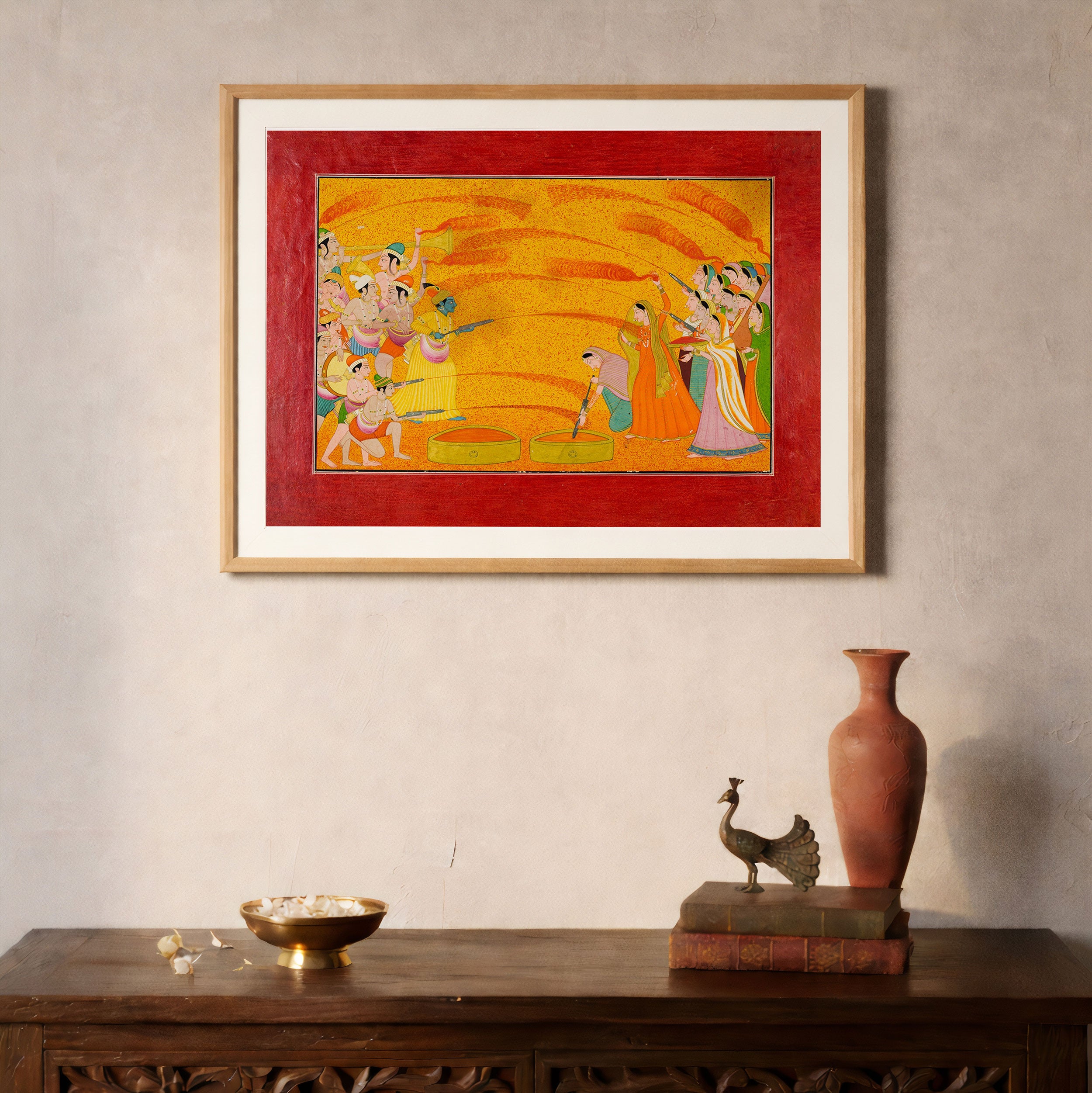 Bring elegance and cultural harmony into your space with this beautiful artwork, Krishna Celebrates Holi, from our Classical Indian Art Collection. Rooted in India’s rich classical and miniature painting traditions, this artwork showcases expressive figures, symbolic motifs, ornate architectural details, and serene natural landscapes, all rendered with refined craftsmanship and thoughtful precision. Its narrative depth and decorative richness make it ideal for traditional, heritage, eclectic, and contemporary interiors, adding warmth, character, and a timeless sense of history and storytelling to every interior.