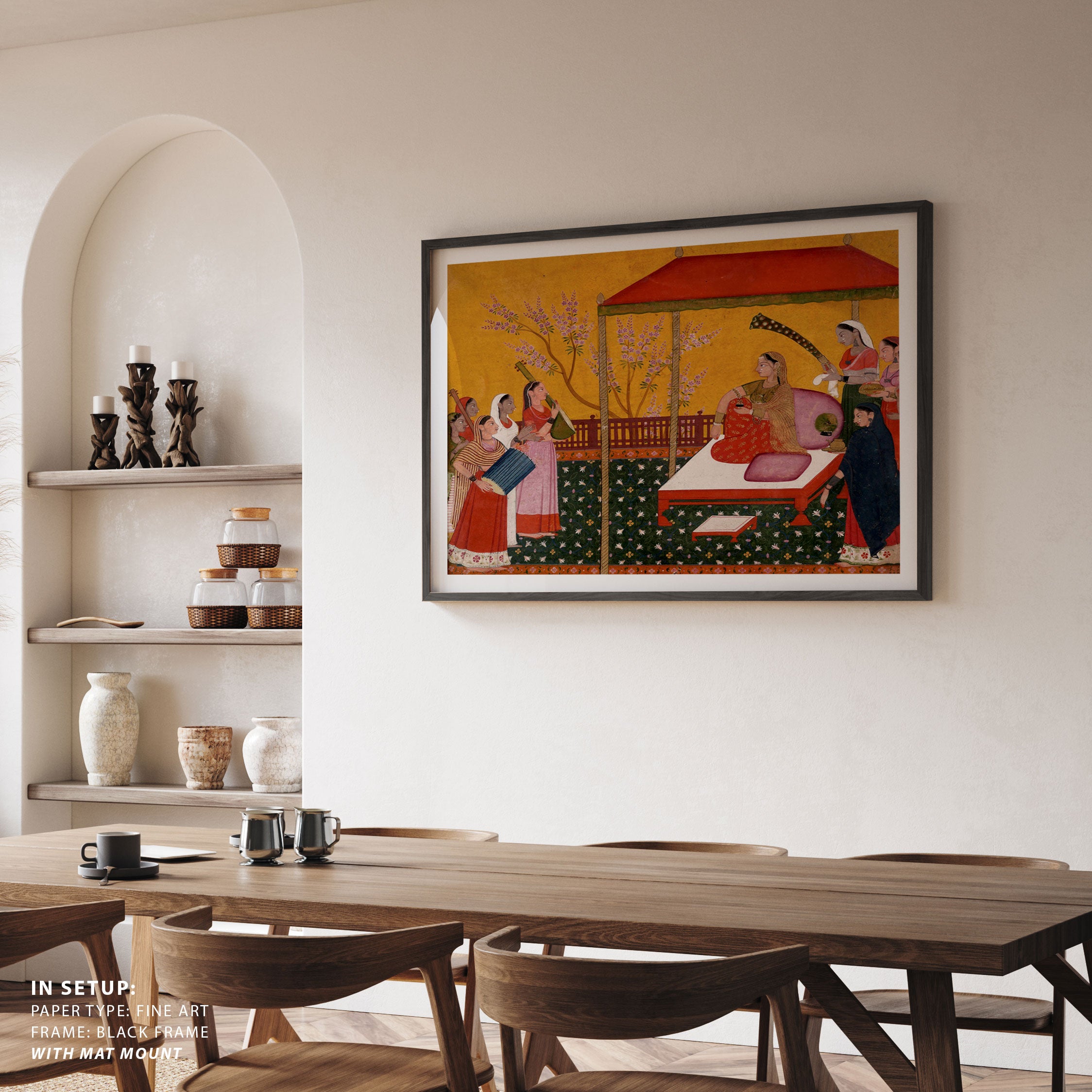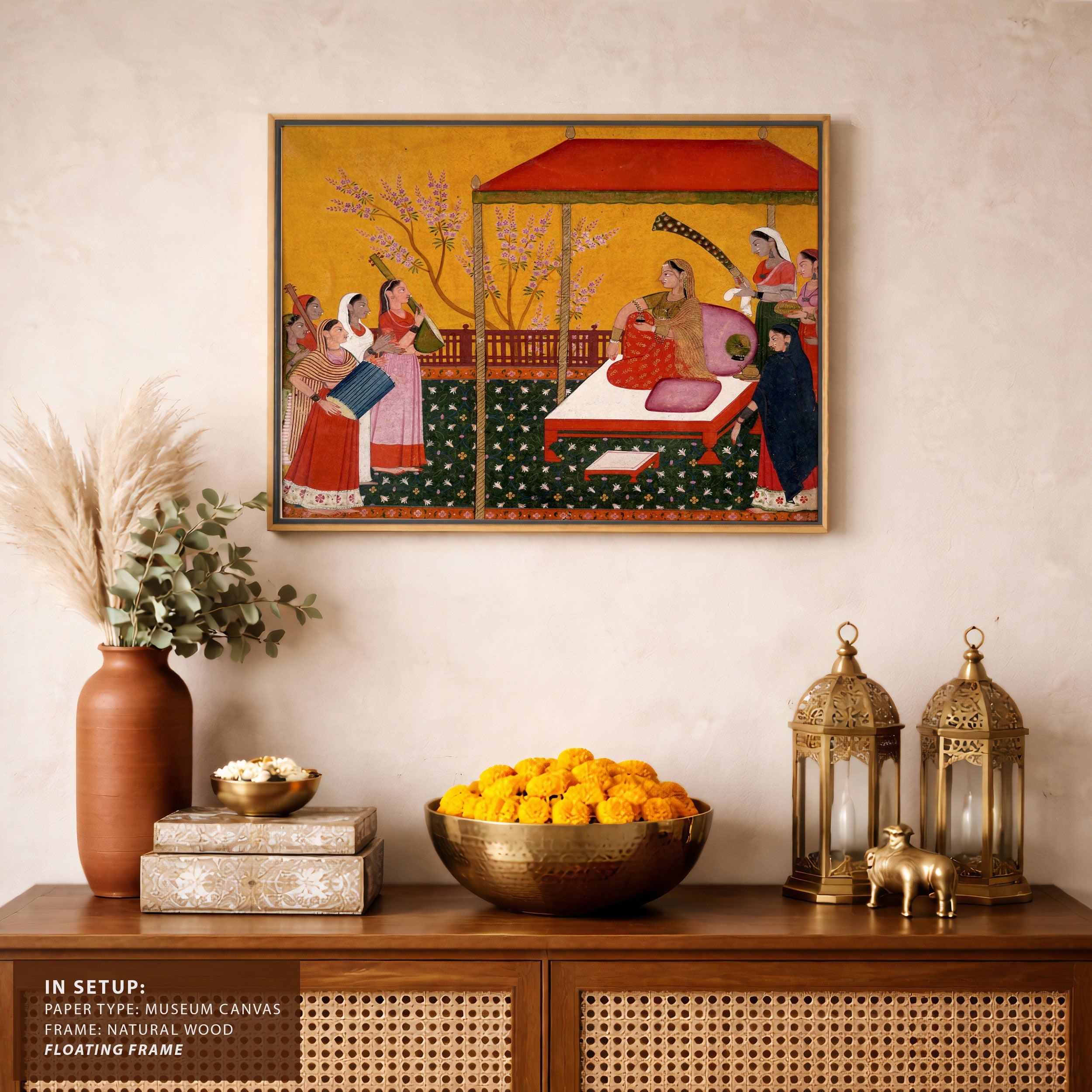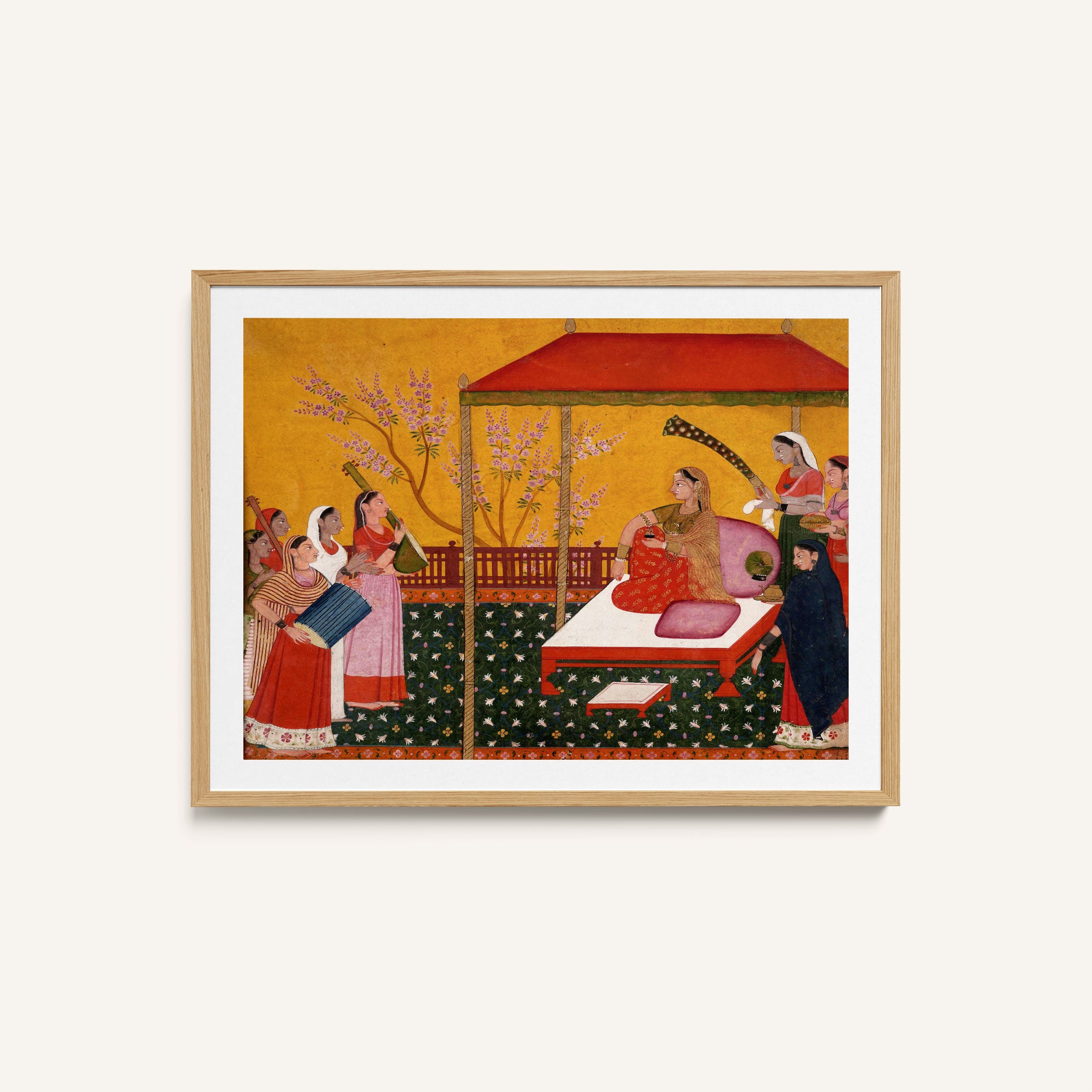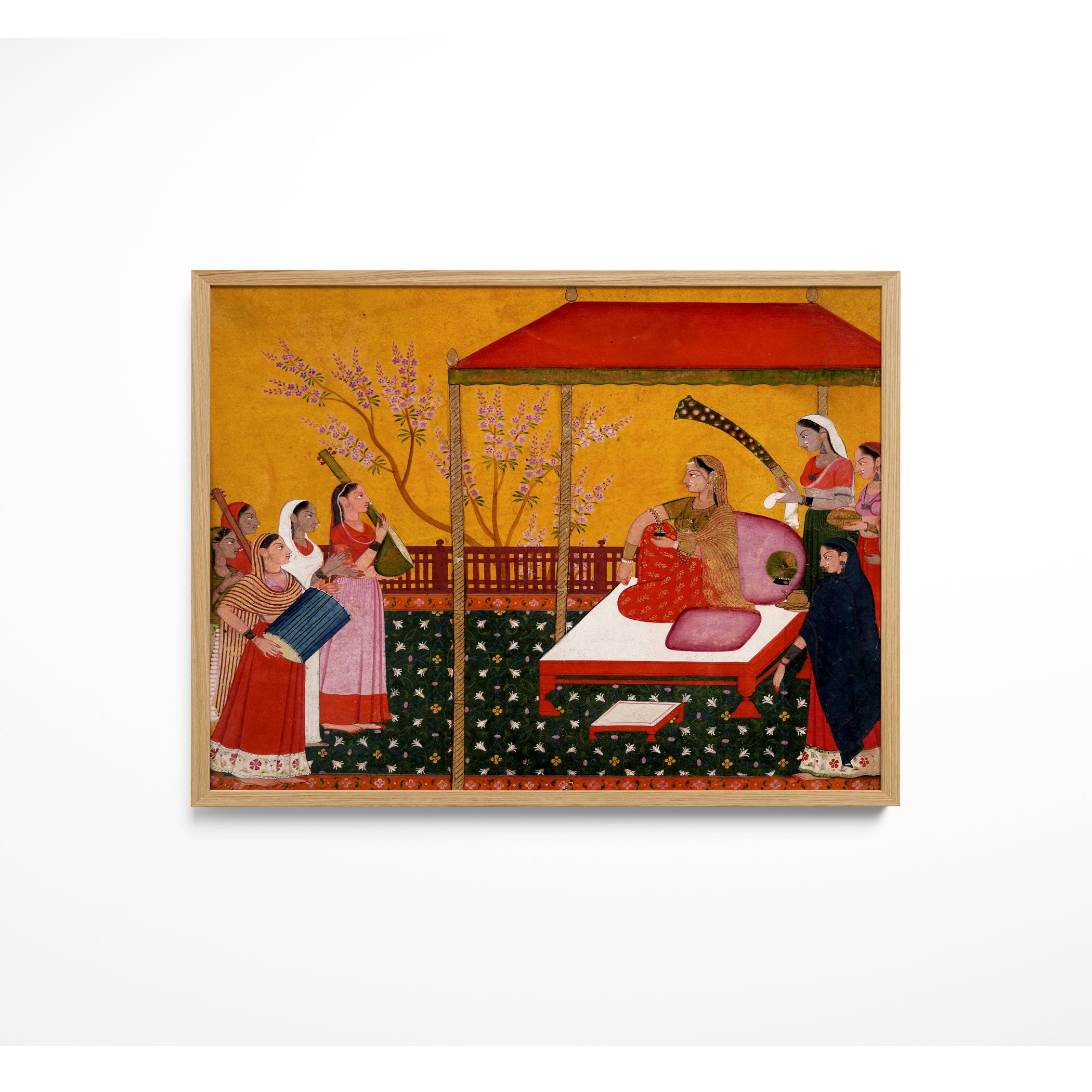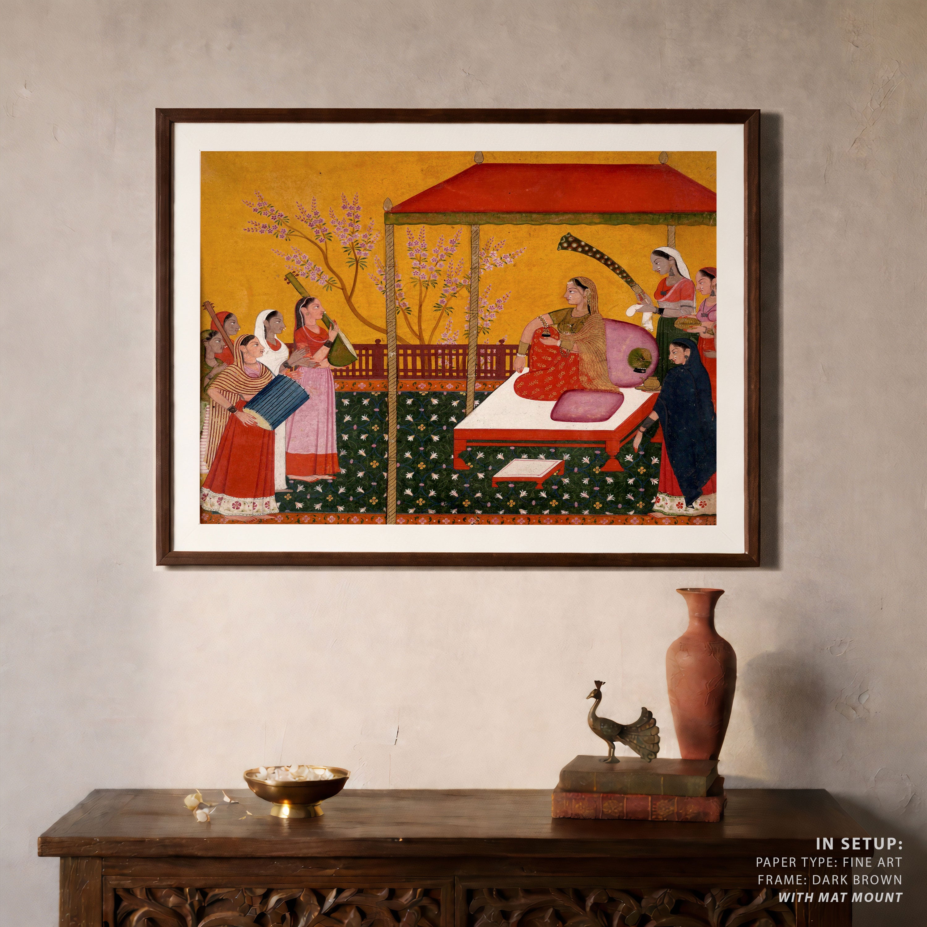 Bring elegance and cultural harmony into your space with this beautiful artwork, A Lady Seated on a Terrace Entertained by Her Female Attendants and Musicians, from our Classical Indian Art Collection. Rooted in India’s rich classical and miniature painting traditions, this artwork showcases expressive figures, symbolic motifs, ornate architectural details, and serene natural landscapes, all rendered with refined craftsmanship and thoughtful precision. Its narrative depth and decorative richness make it ideal for traditional, heritage, eclectic, and contemporary interiors, adding warmth, character, and a timeless sense of history and storytelling to every interior.