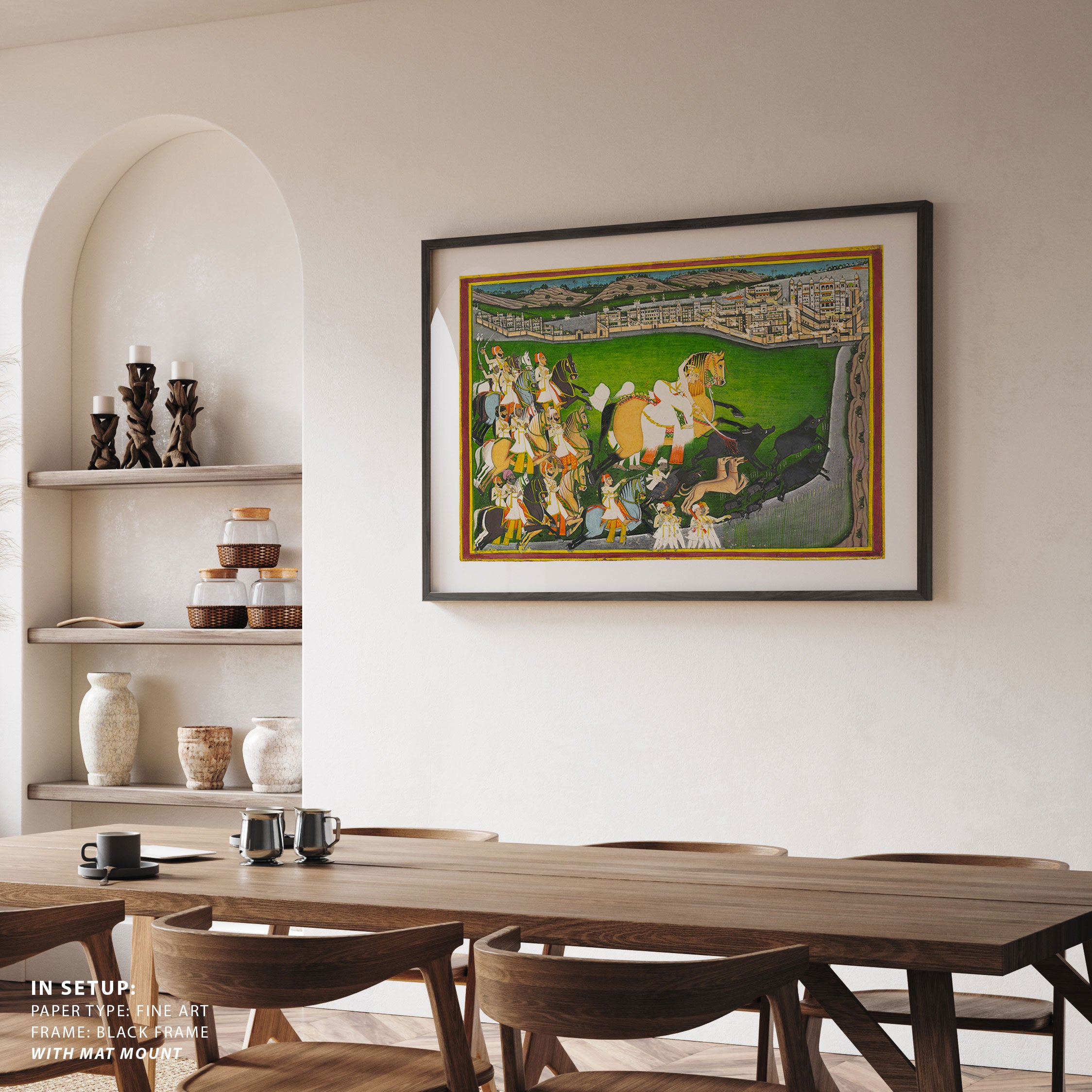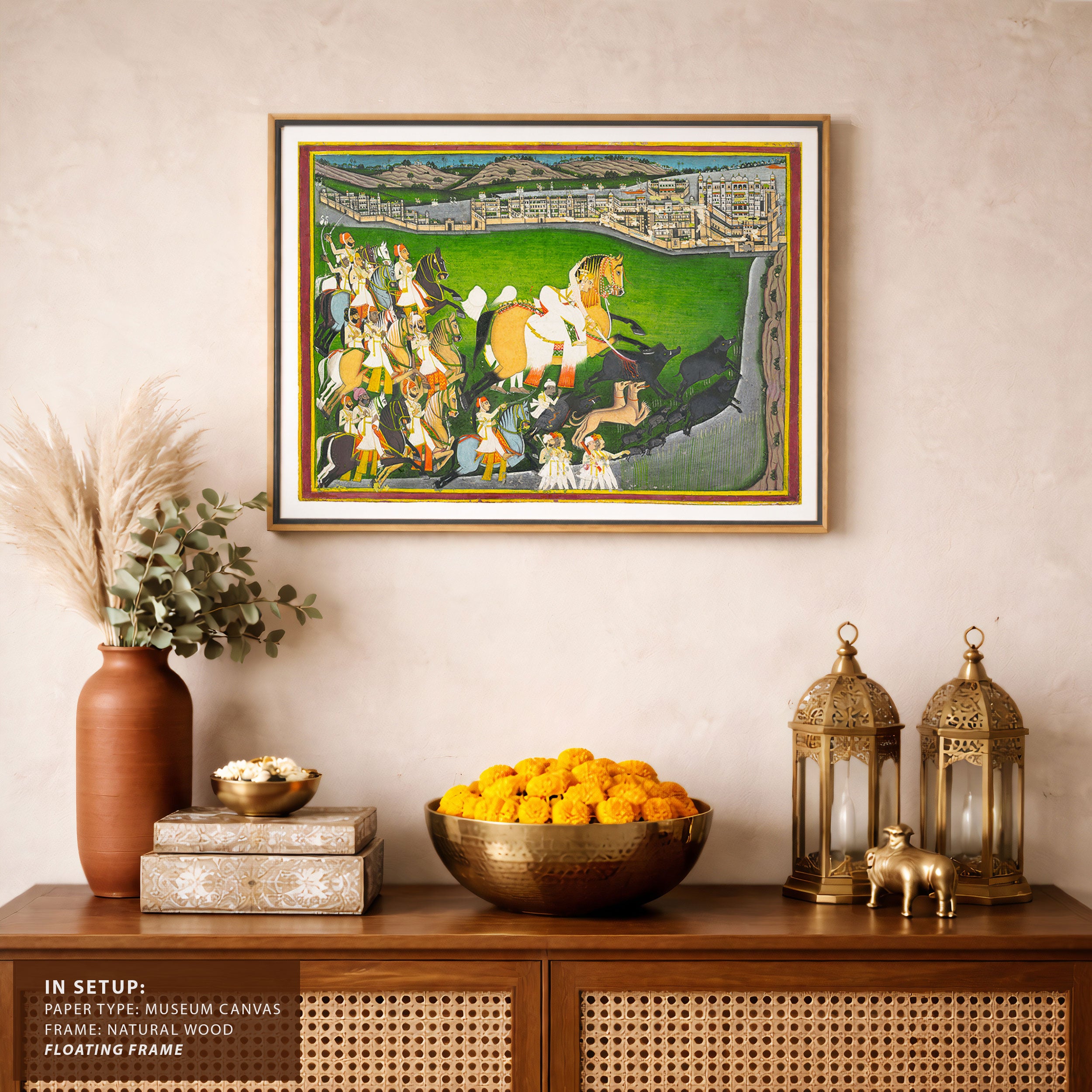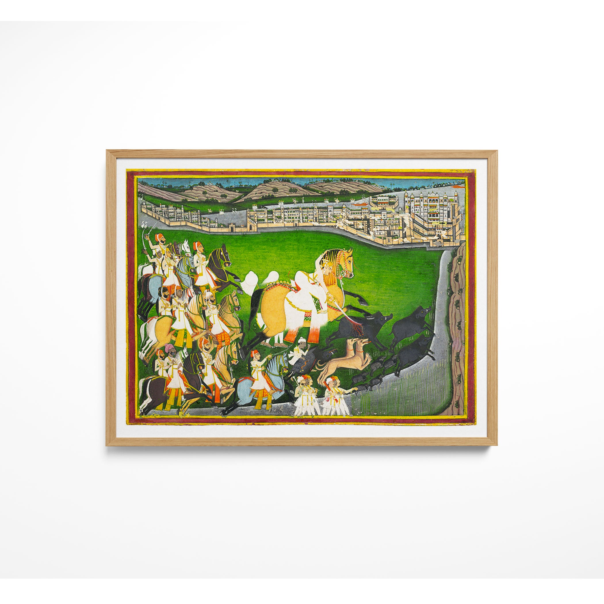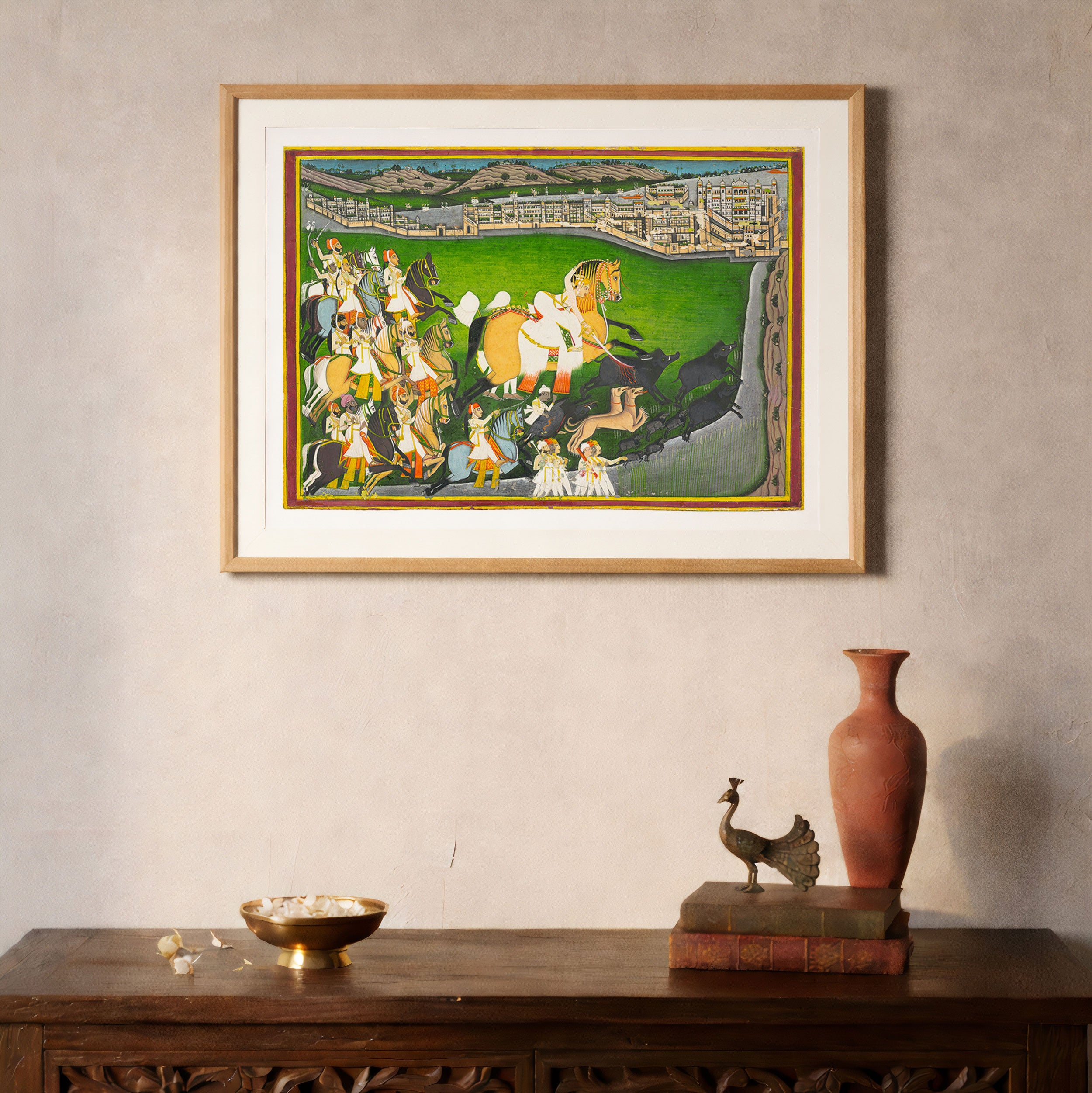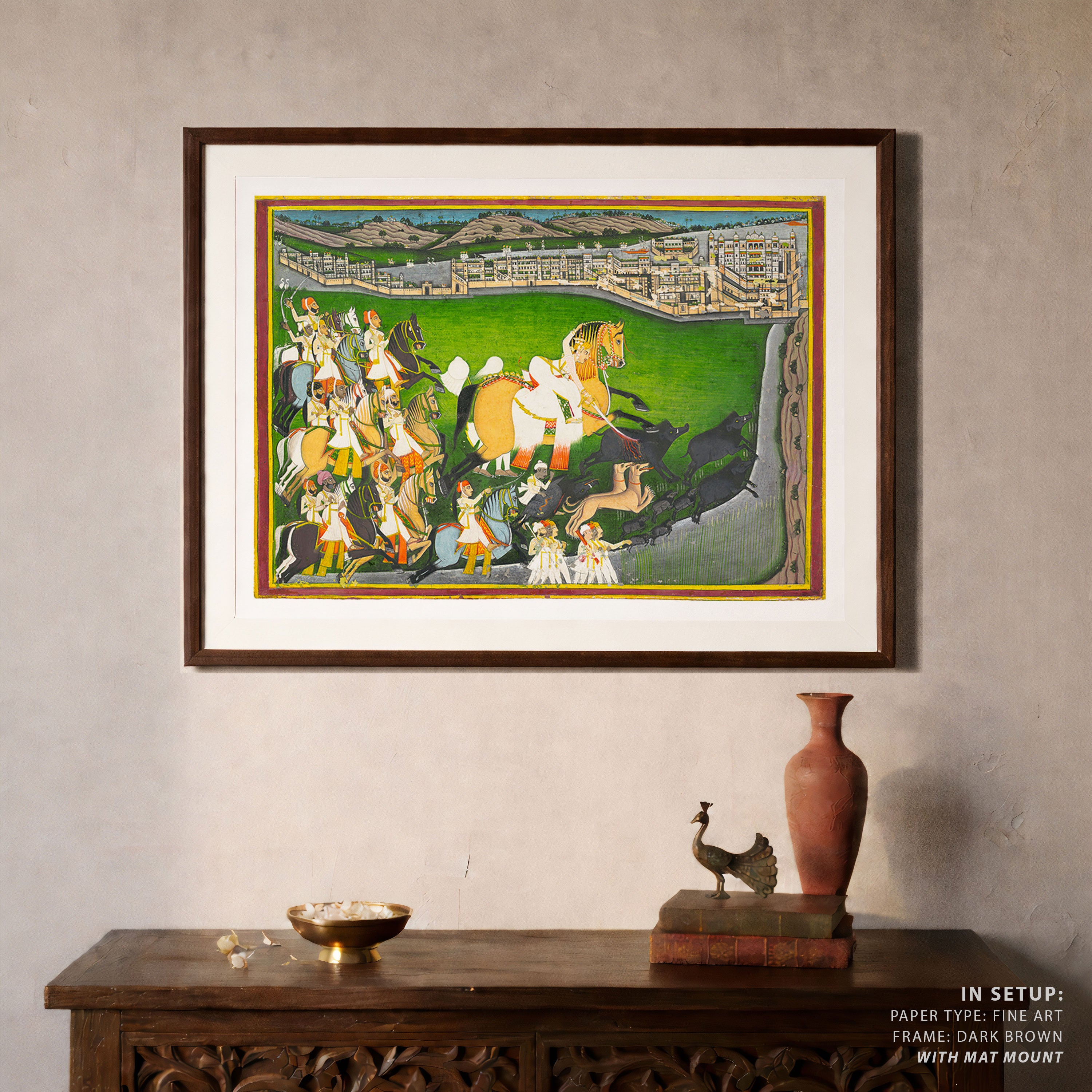 Bring elegance and cultural harmony into your space with this beautiful artwork, A Prince Hunting Boars with His Retinue, from our Classical Indian Art Collection. Rooted in India’s rich classical and miniature painting traditions, this artwork showcases expressive figures, symbolic motifs, ornate architectural details, and serene natural landscapes, all rendered with refined craftsmanship and thoughtful precision. Its narrative depth and decorative richness make it ideal for traditional, heritage, eclectic, and contemporary interiors, adding warmth, character, and a timeless sense of history and storytelling to every interior.