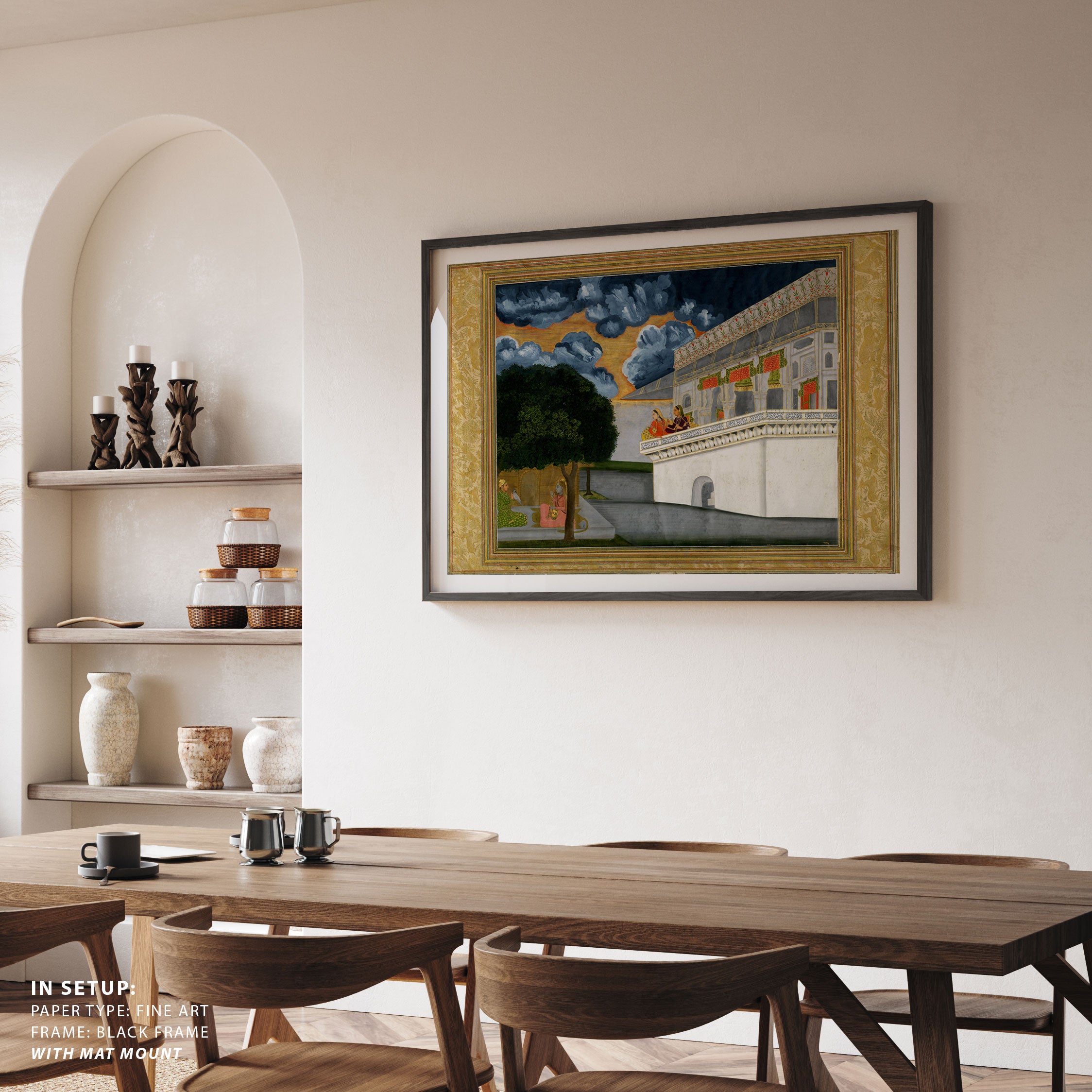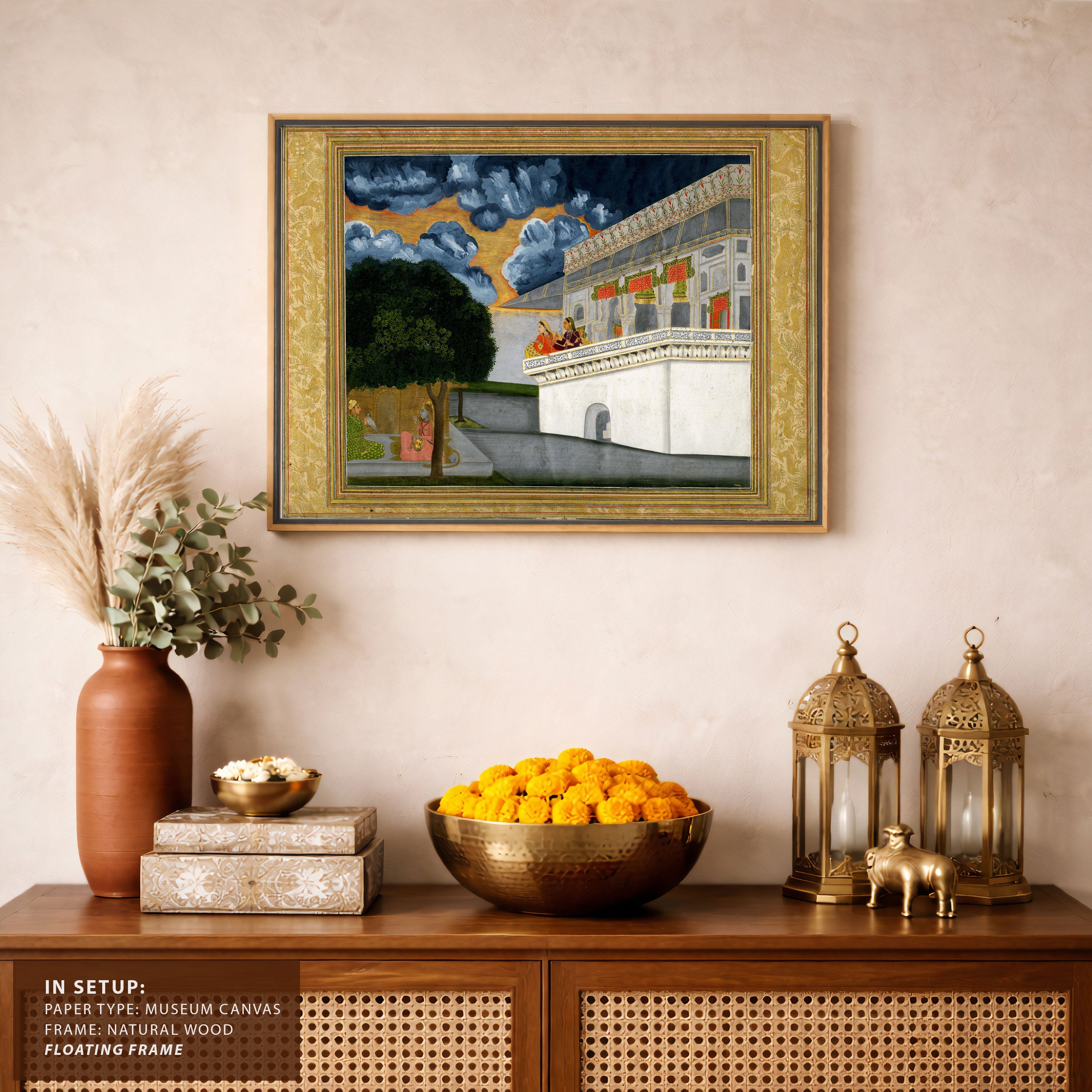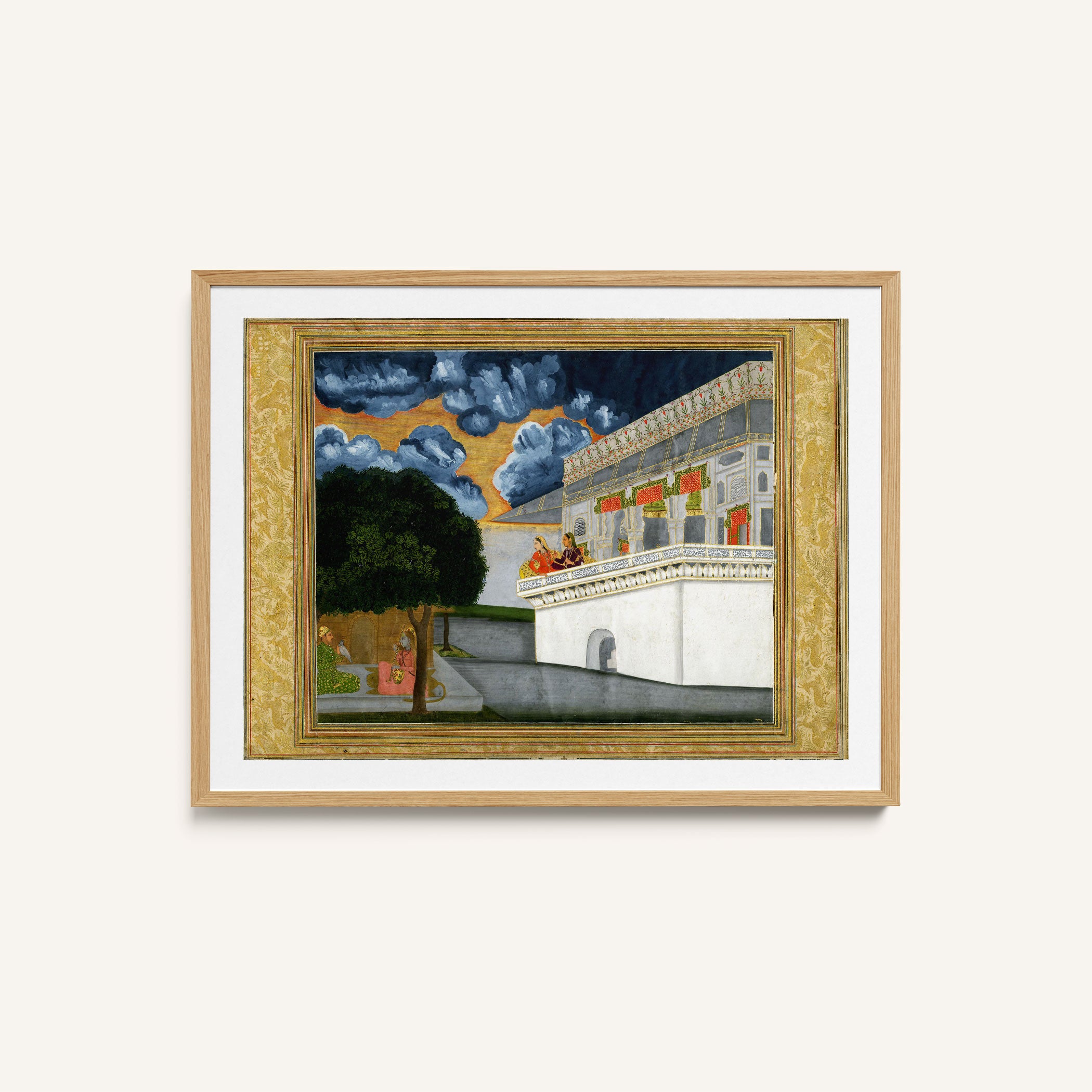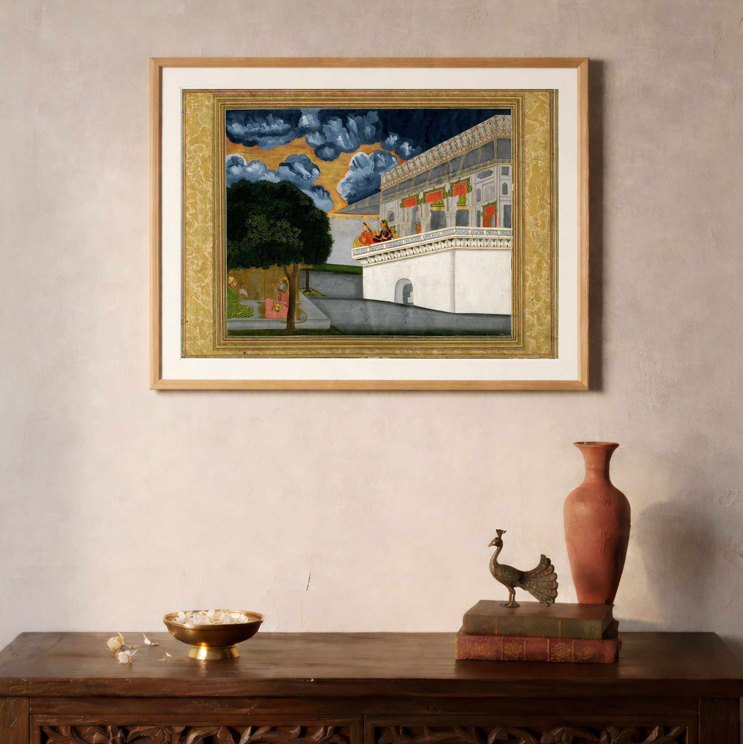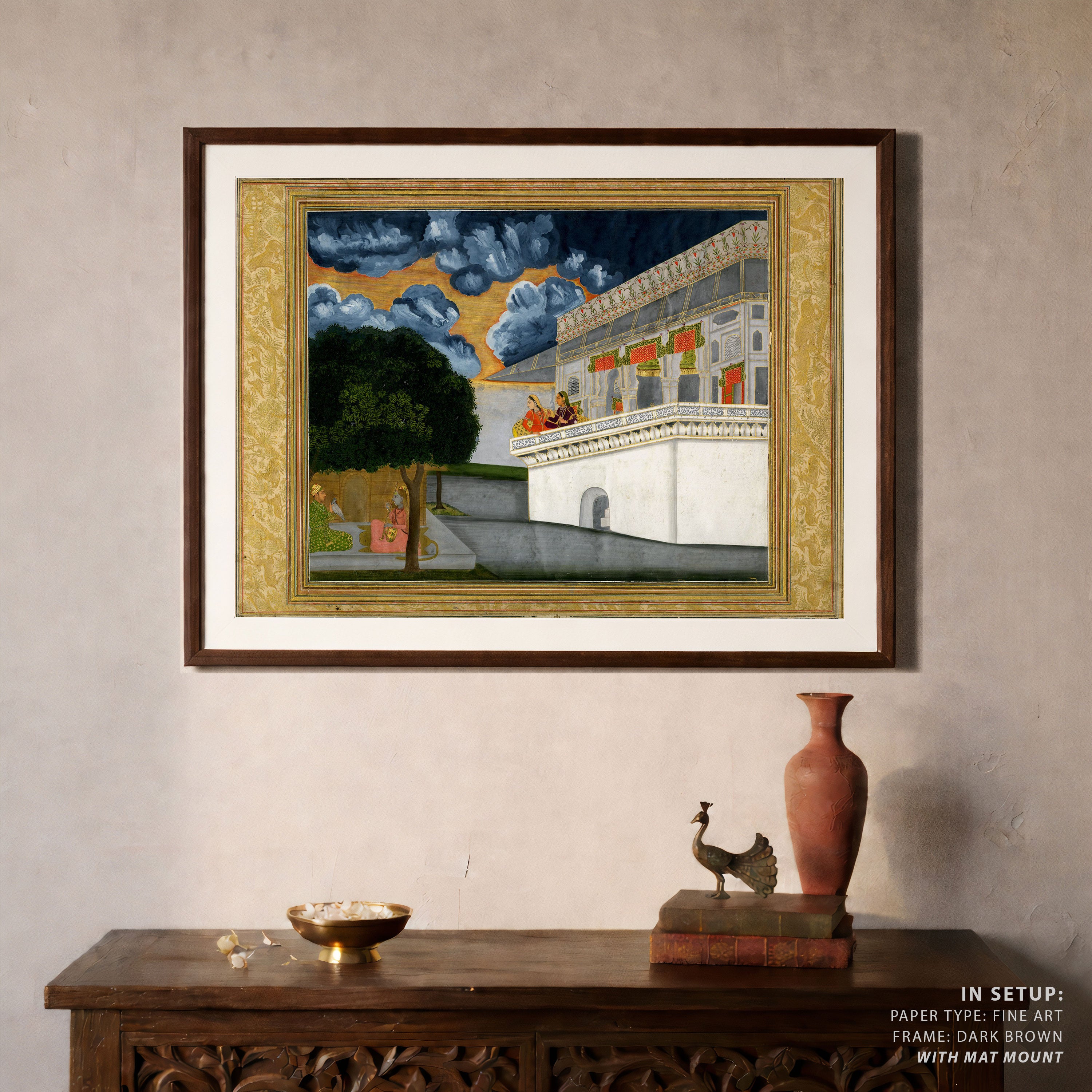 Bring elegance and cultural harmony into your space with this beautiful artwork, A Prince Listening to a Woman Playing the Vina with Two other Women Looking on, from our Classical Indian Art Collection. Rooted in India’s rich classical and miniature painting traditions, this artwork showcases expressive figures, symbolic motifs, ornate architectural details, and serene natural landscapes, all rendered with refined craftsmanship and thoughtful precision. Its narrative depth and decorative richness make it ideal for traditional, heritage, eclectic, and contemporary interiors, adding warmth, character, and a timeless sense of history and storytelling to every interior.
