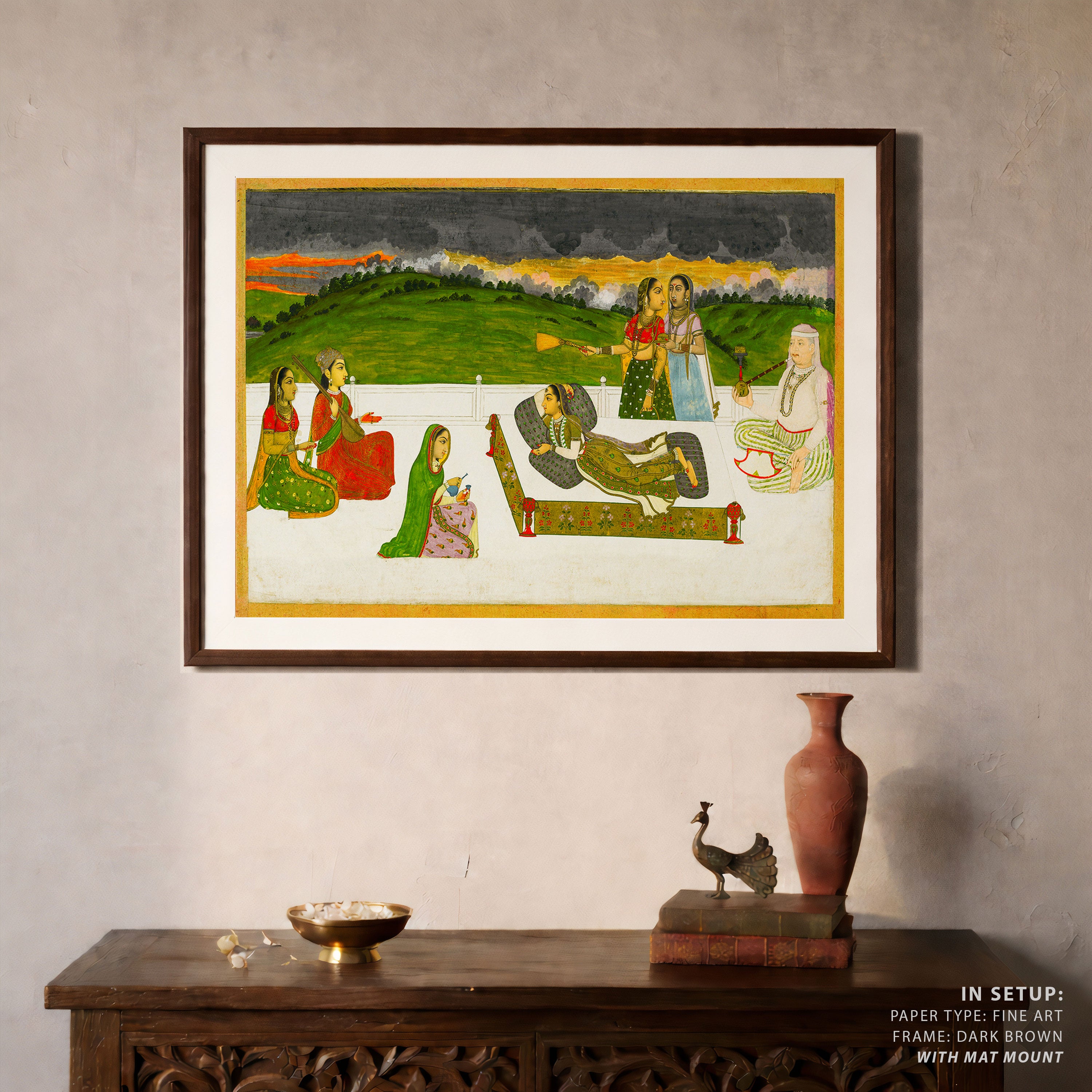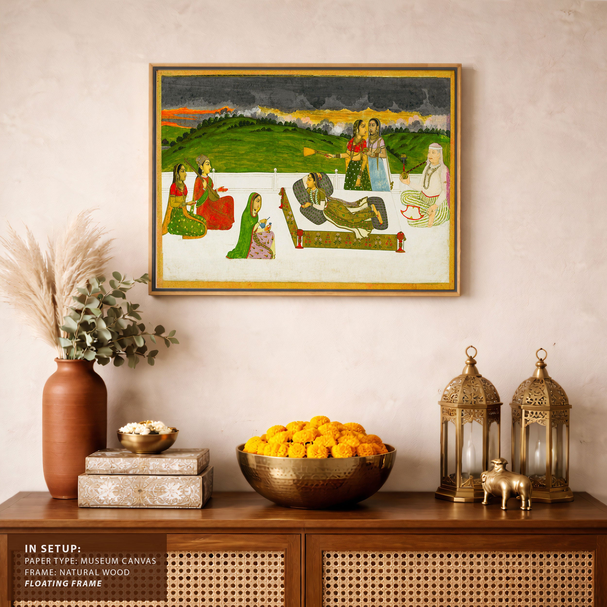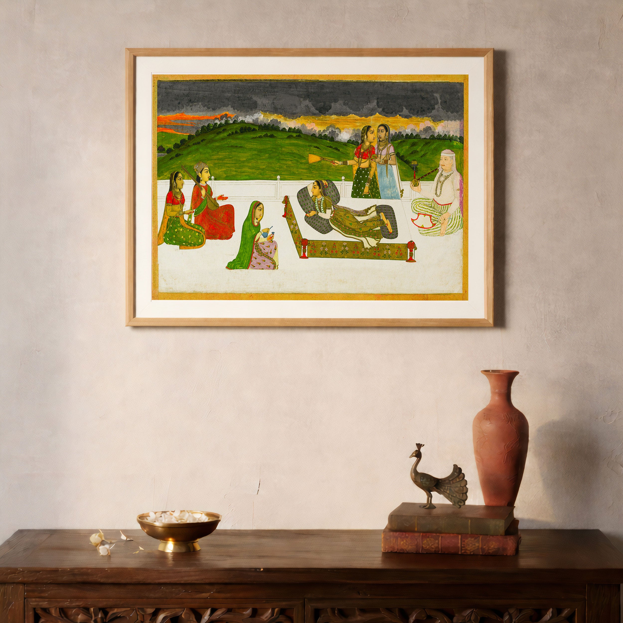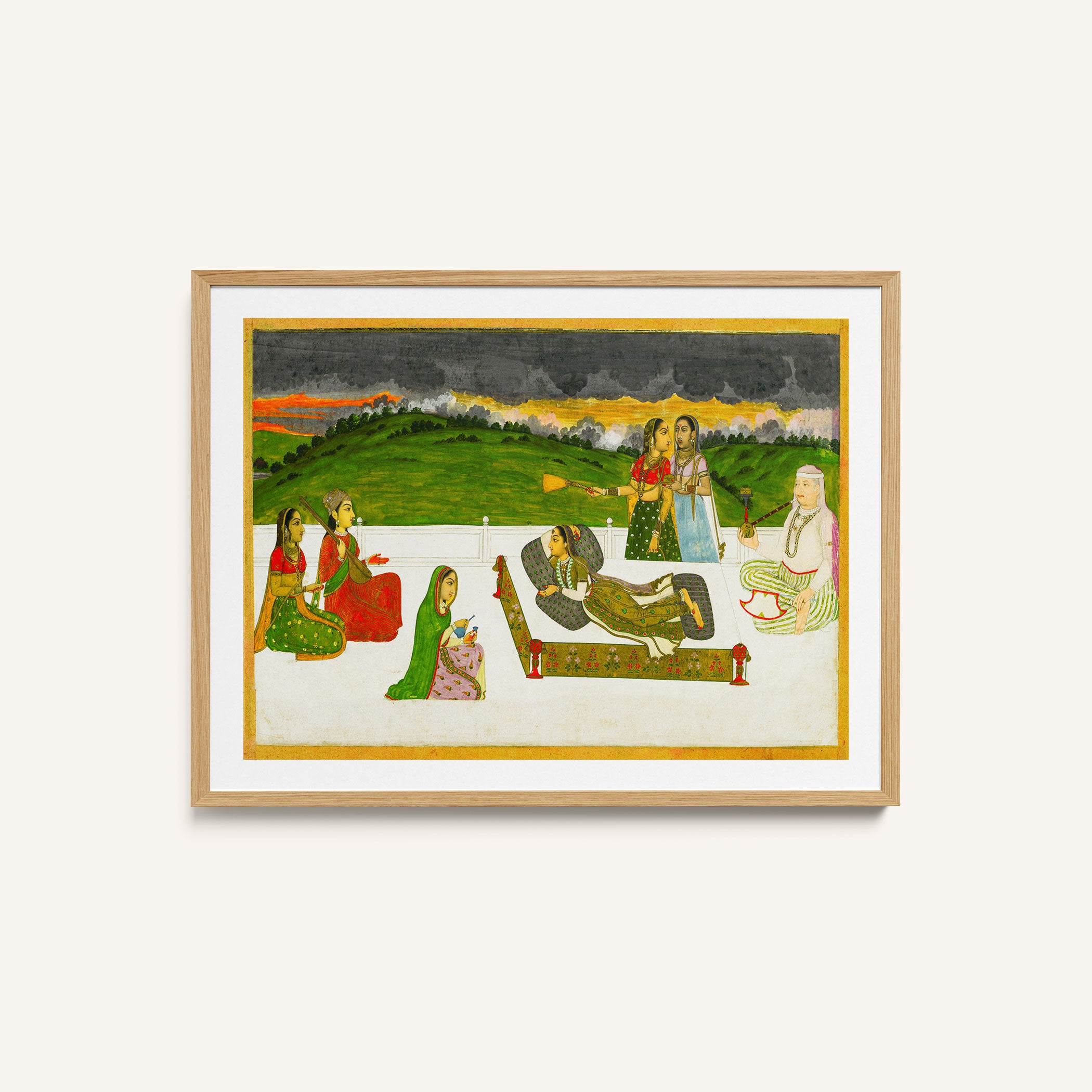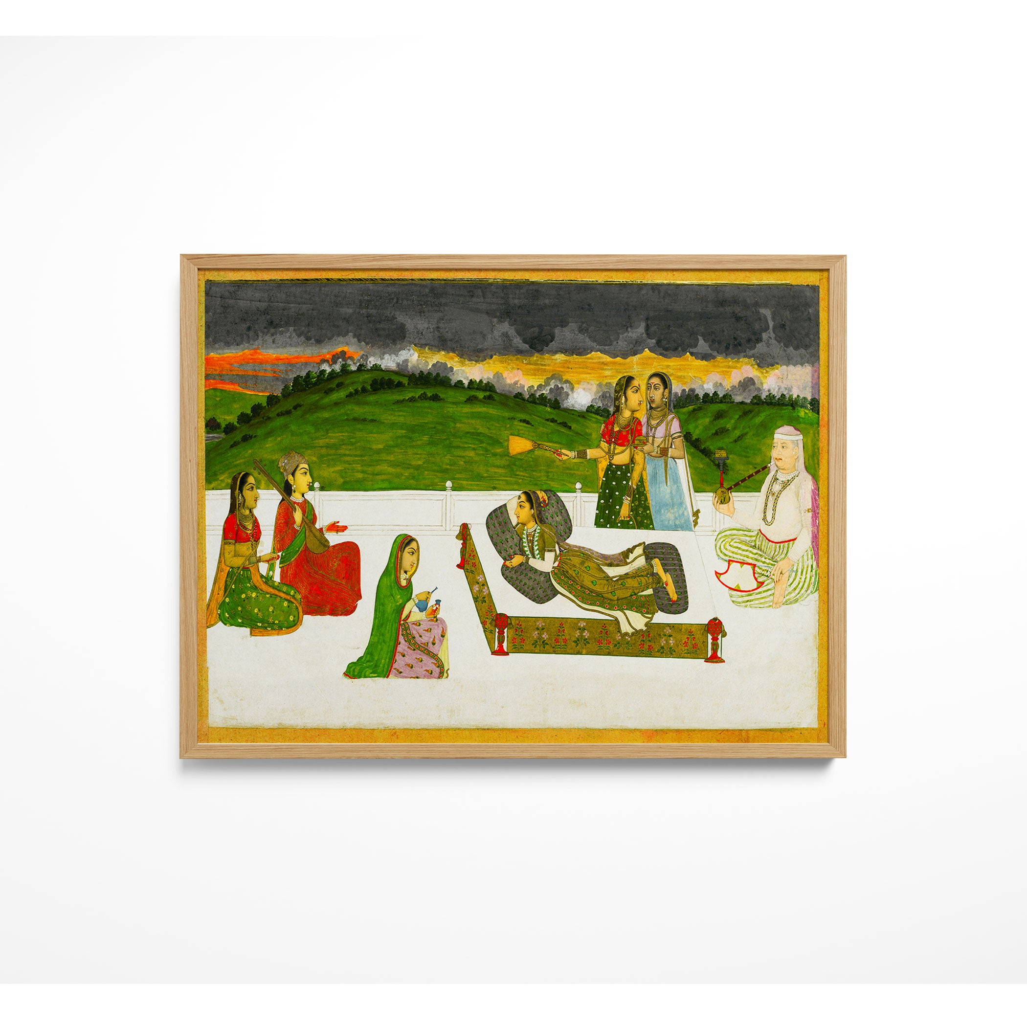 Bring elegance and cultural harmony into your space with this beautiful artwork, A Princess Reclining on a Terrace with Attendants, from our Classical Indian Art Collection. Rooted in India’s rich classical and miniature painting traditions, this artwork showcases expressive figures, symbolic motifs, ornate architectural details, and serene natural landscapes, all rendered with refined craftsmanship and thoughtful precision. Its narrative depth and decorative richness make it ideal for traditional, heritage, eclectic, and contemporary interiors, adding warmth, character, and a timeless sense of history and storytelling to every interior.