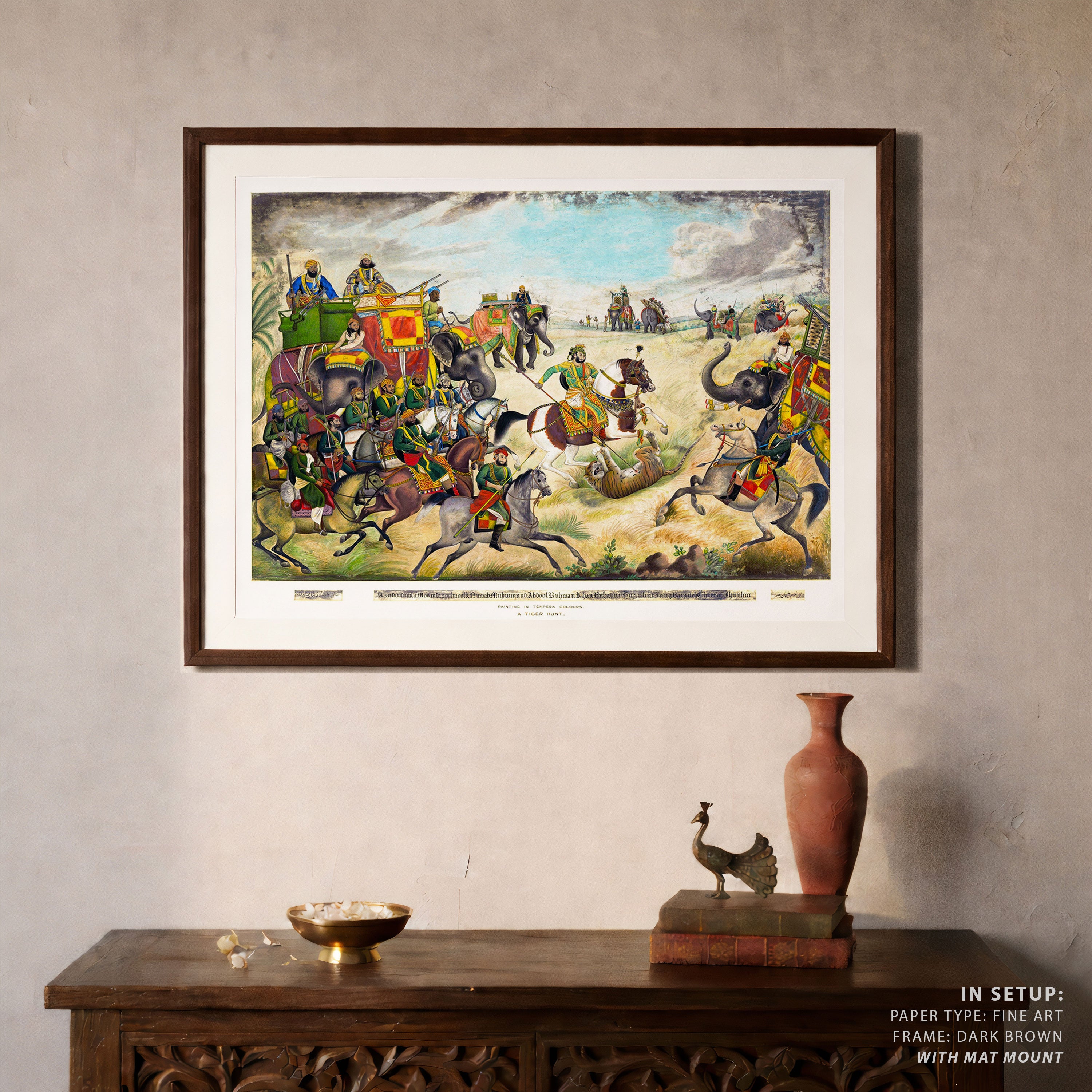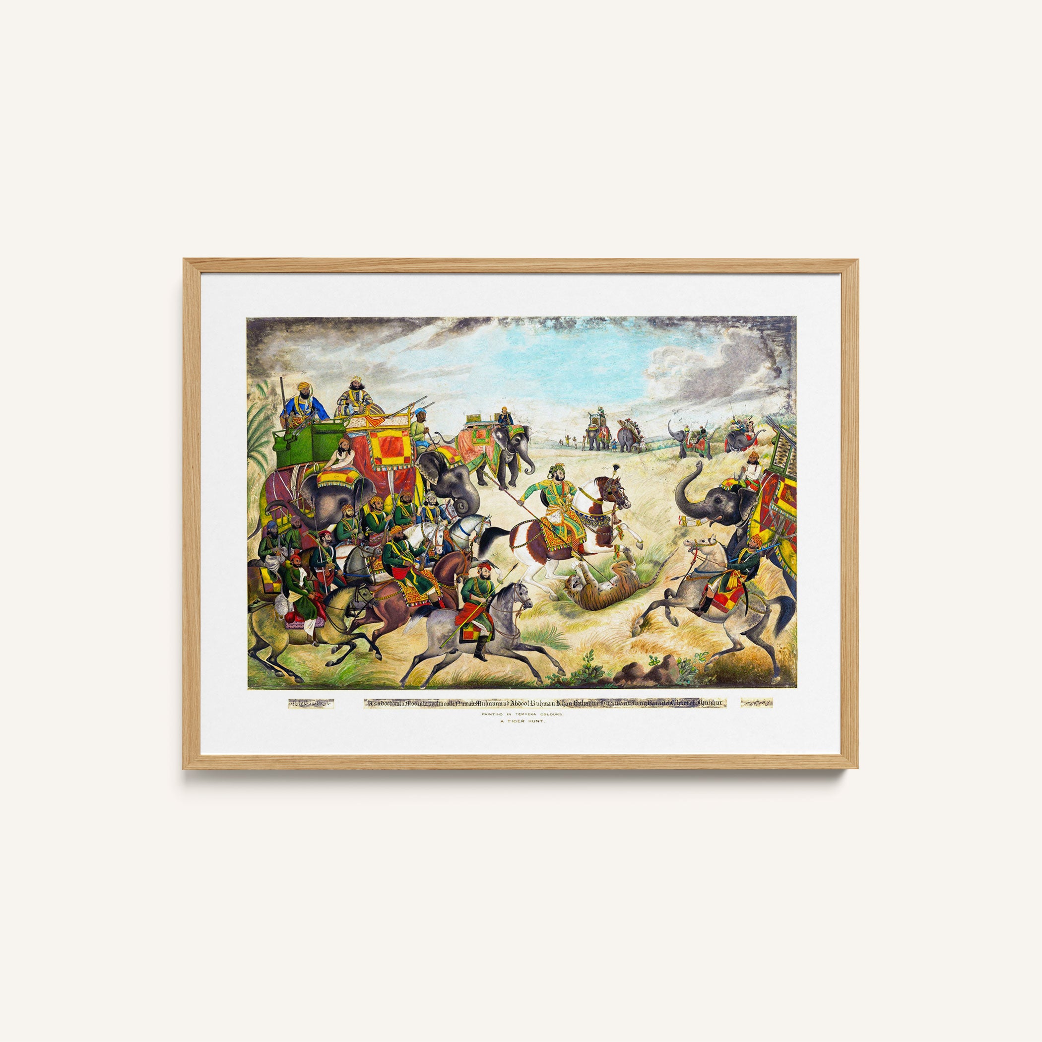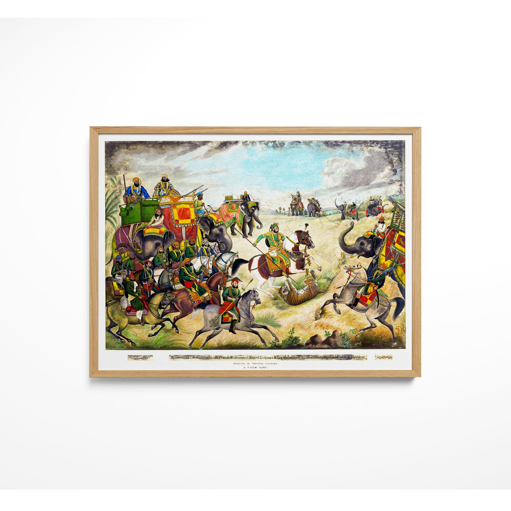 Bring elegance and cultural harmony into your space with this beautiful artwork, A Tiger Hunt at Jhajjar, Rohtak District, Punjab, from our Classical Indian Art Collection. Rooted in India’s rich classical and miniature painting traditions, this artwork showcases expressive figures, symbolic motifs, ornate architectural details, and serene natural landscapes, all rendered with refined craftsmanship and thoughtful precision. Its narrative depth and decorative richness make it ideal for traditional, heritage, eclectic, and contemporary interiors, adding warmth, character, and a timeless sense of history and storytelling to every interior.