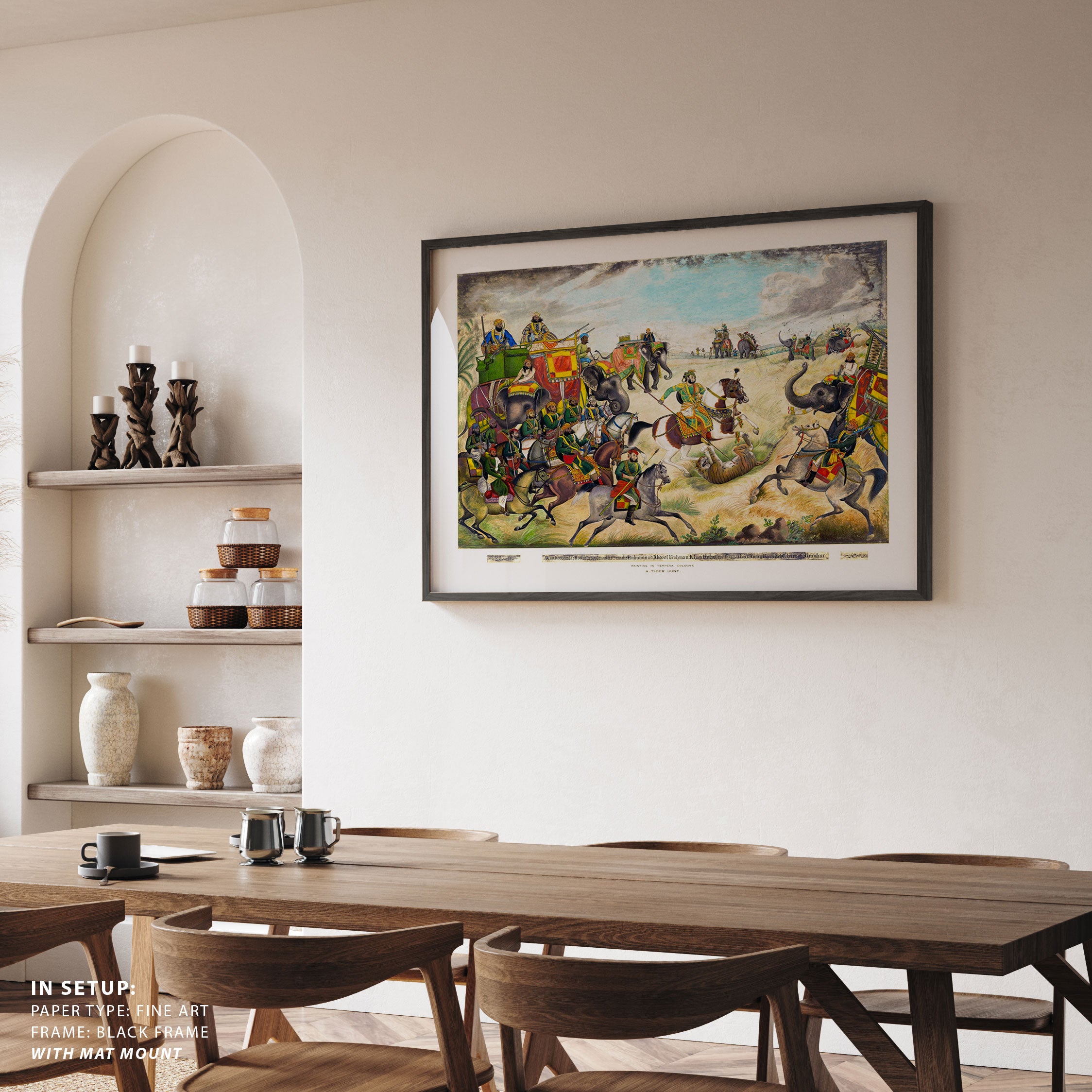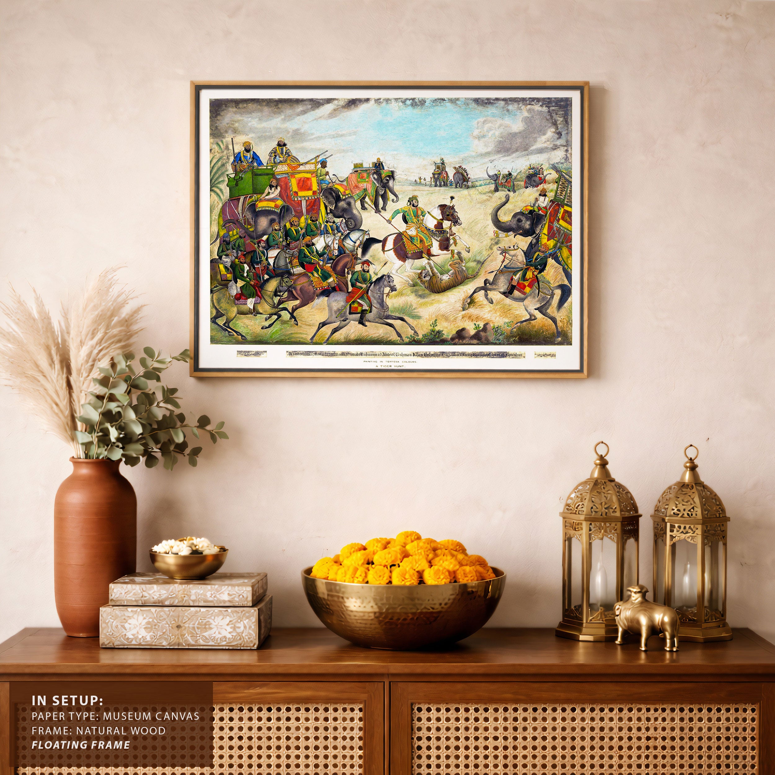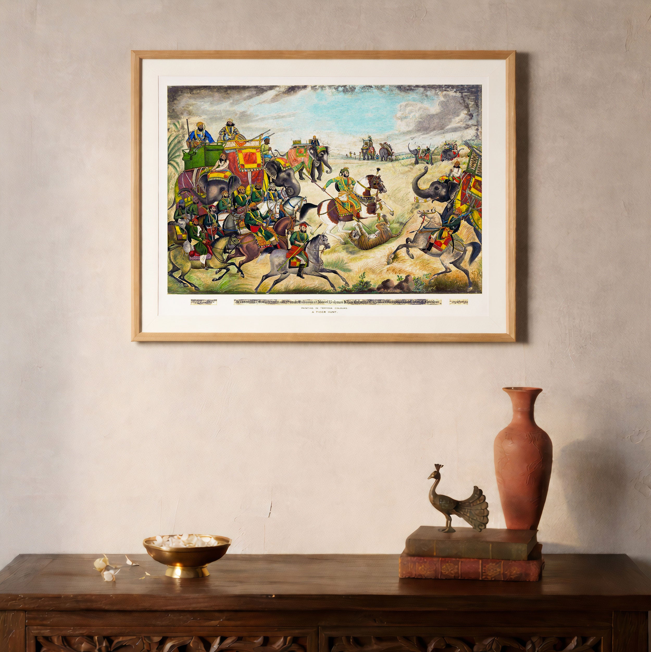 Bring elegance and cultural harmony into your space with this beautiful artwork, A Tiger Hunt at Jhajjar, Rohtak District, Punjab, from our Classical Indian Art Collection. Rooted in India’s rich classical and miniature painting traditions, this artwork showcases expressive figures, symbolic motifs, ornate architectural details, and serene natural landscapes, all rendered with refined craftsmanship and thoughtful precision. Its narrative depth and decorative richness make it ideal for traditional, heritage, eclectic, and contemporary interiors, adding warmth, character, and a timeless sense of history and storytelling to every interior.