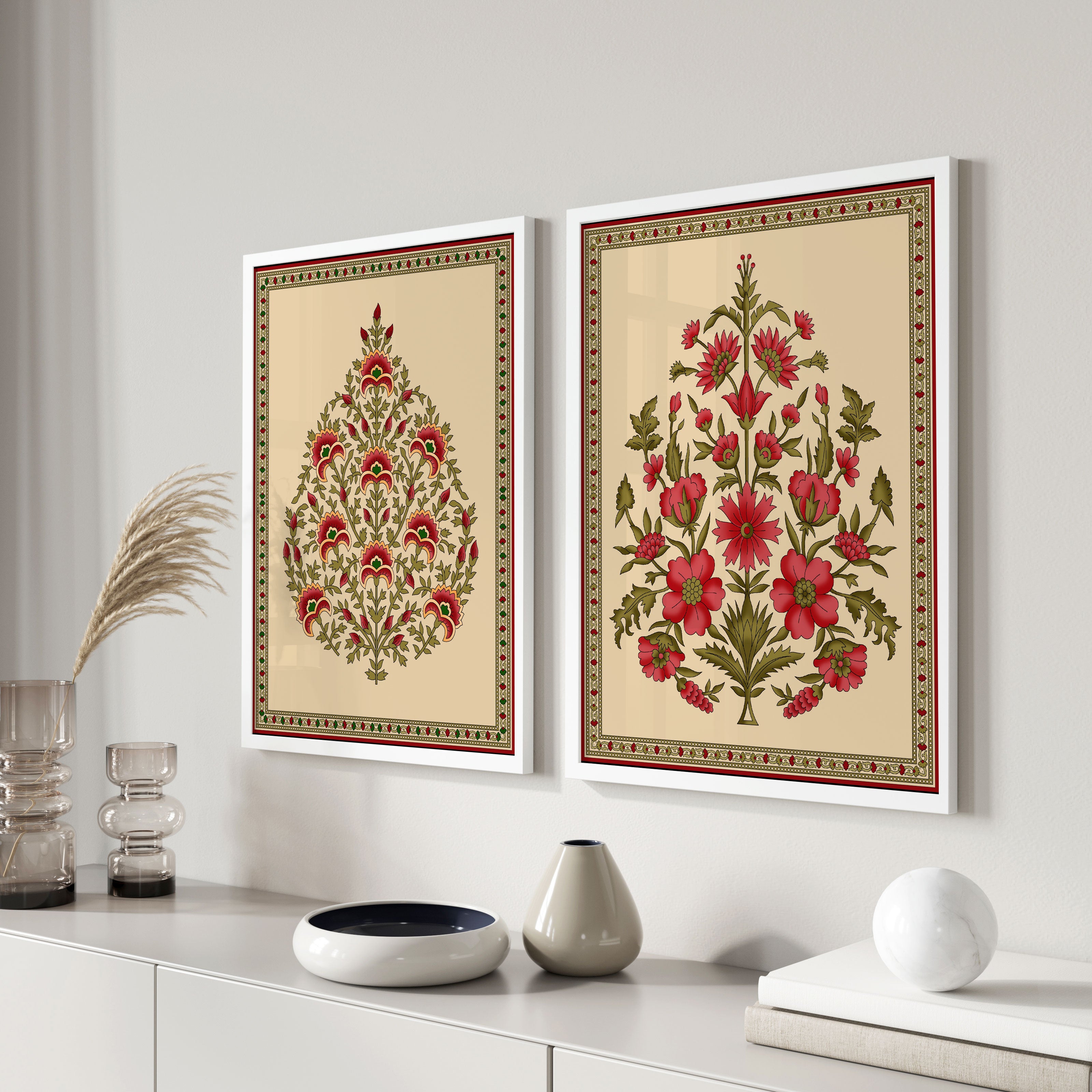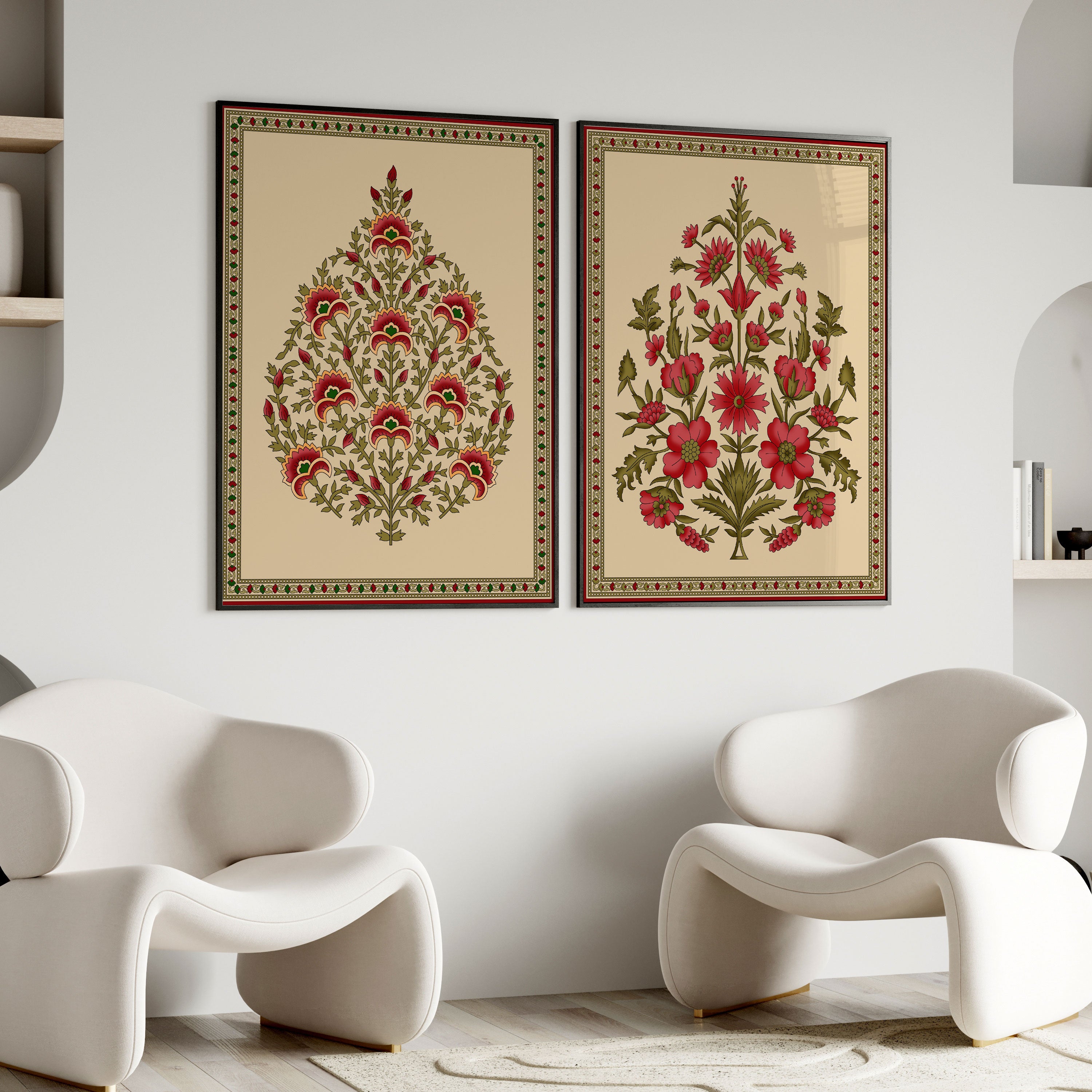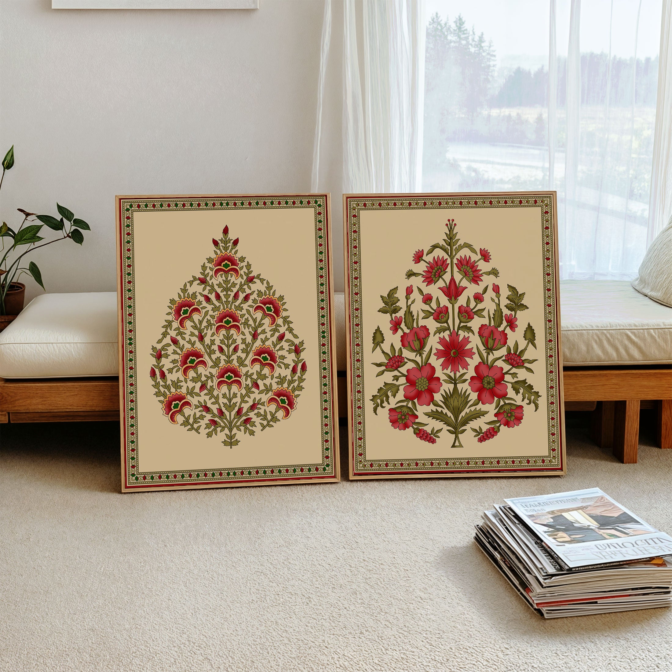 Seamless Mughal Motifs - from our Set of 2 Art Prints Collection is printed on premium-quality canvas or fine art paper with a smooth matte finish and vibrant, long-lasting colors that bring each detail to life. These Set of 2 Wall Art Prints are made with exceptional color clarity and precision, following the same high standards used by professional galleries and art studios. Perfect for art lovers or anyone looking to add a touch of modern botanical elegance to their space, these prints look stunning in any bedroom, living room, bathroom, balcony, or office. Get inspired by our designer-curated art sets, and complete your space with handmade, custom frames crafted in-house for a beautifully finished look.